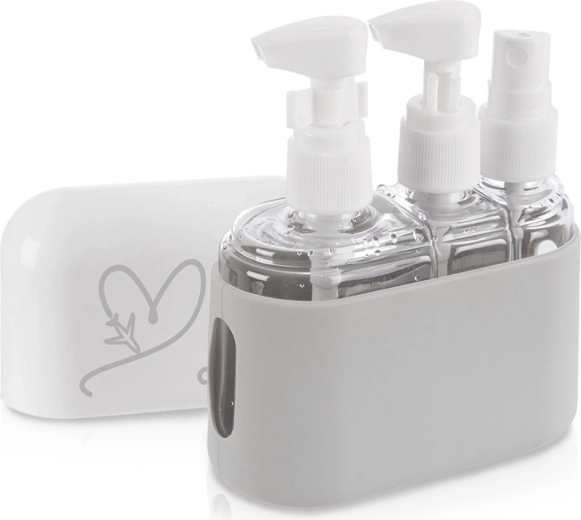 Det lukbare etui med silikonebund holder flaskerne stabile, beskytter dem mod skader og holder alt rent og samlet i kuffert eller taske.