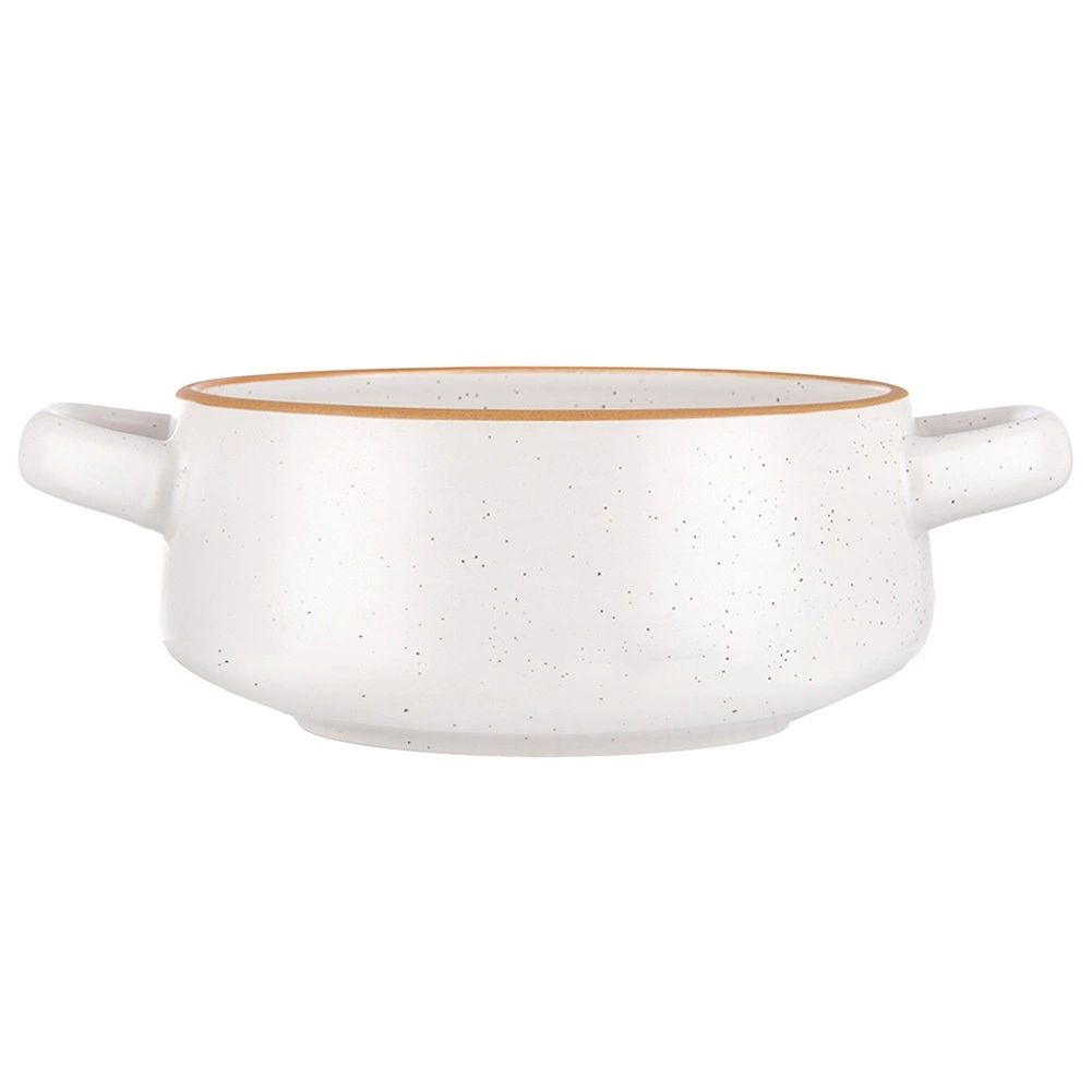 Kvalitetskeramik i hvid med kontrasterende brun kant og specklet overflade virker moderne og samtidig tidløs. Skålen er egnet til opvaskemaskine for hurtig rengøring og til mikrobølgeovn for nem opvarmning. Den fungerer også glimrende til cerealier, yoghurt, frugt, salater og snacks – en praktisk hjælper til daglig borddækning.