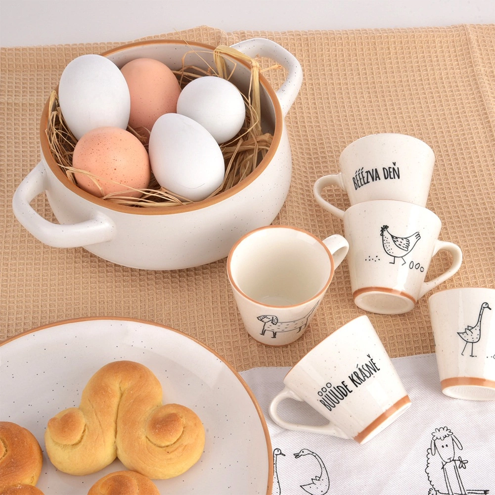 Slidstærk keramik i hvid med brun kant og specklet overflade tager sig flot ud på ethvert bord.