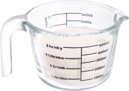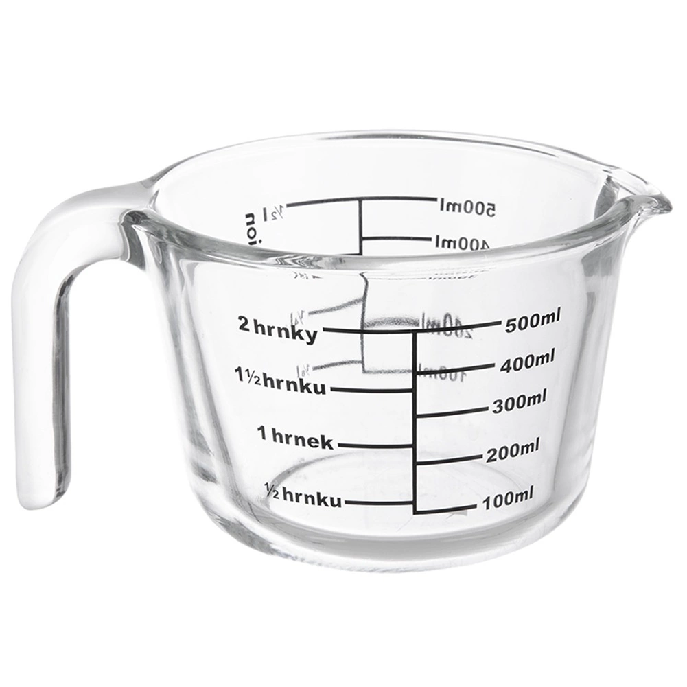 - Præcis og overskuelig skala i ml (100–500 ml for hver 100 ml), liter (1/8 l til 1/2 l) og kopper (1/2 til 2).