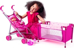 Dette smukke sæt indeholder alt, hvad dit barn har brug for til at pleje sin yndlingsdukke. Sættet inkluderer en sportsbarnevogn med metalramme, der er meget praktisk takket være nem håndtering. Derudover er der en rejseseng, ideel til spil både derhjemme og udenfor.