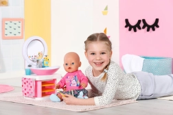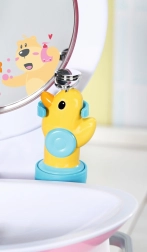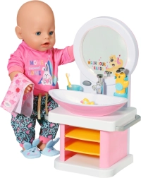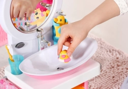 Lær børn gode hygiejnevaner gennem leg. Det hvid-rosa dukkeservante til BABY born byder på lys- og lydeffekter, en rigtig vandstråle ved tryk på hanen og søde tilbehør til komplet pleje. Når spejlet lyser, afspilles en melodi, der fungerer som en legende timer til håndvask.
