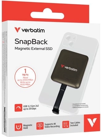 Ultrakompakt ekstern SSD Verbatim SnapBack 1 TB med magnetisk MagSafe-fastgørelse til iPhone, skabt til kreatører. Understøtter Apple ProRes 4K/60 fps til direkte optagelse på drevet, tilbyder USB 3.2 Gen 2x2 op til 20 Gb/s og leveres med 2 USB‑C-kabler. Let konstruktion (ca. 40 g) og softwaren Nero Backup 3‑2‑1 sikrer datasikkerhed på farten og på kontoret.