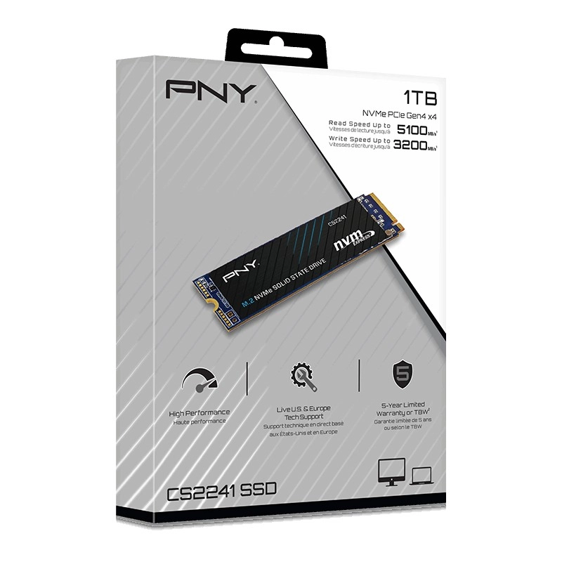 PNY CS2241 er en moderne NVMe SSD til både stationære pc’er og bærbare med PCIe 4.0-understøttelse. Den tilbyder markant højere læse- og skrivehastigheder end SATA SSD, så du reducerer indlæsningstider for system og programmer og forbedrer enhedens samlede respons.