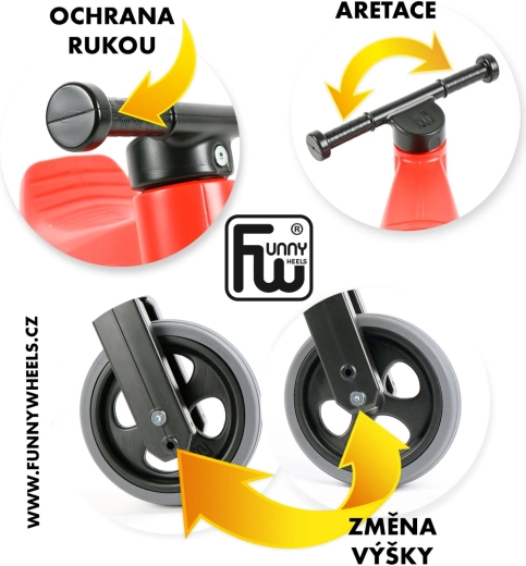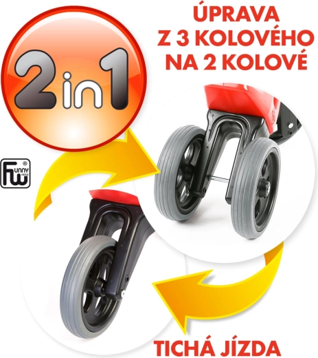 Den originale tjekkiske løbecykel FUNNY WHEELS Rider Sport er designet til at gøre de første skridt mod cykling nemmere. Takket være 2-i-1-systemet kan du på få minutter ændre den fra tretur til tohjulet, og med to højdepositioner på sadlen (forskel 3 cm) følger den barnet gennem flere vækstfaser.