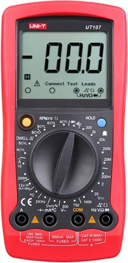 UNI-T UT107 er et digitalt automobilmultimeter designet til både professionel og hobbybrug på autoværksteder. Det leverer præcise målinger af DC-spænding op til 1000 V, AC-spænding op til 750 V, DC-strøm op til 10 A og modstand op til 20 MΩ. Takket være det overskuelige display og den robuste konstruktion klarer det krævende forhold i værkstedet.
