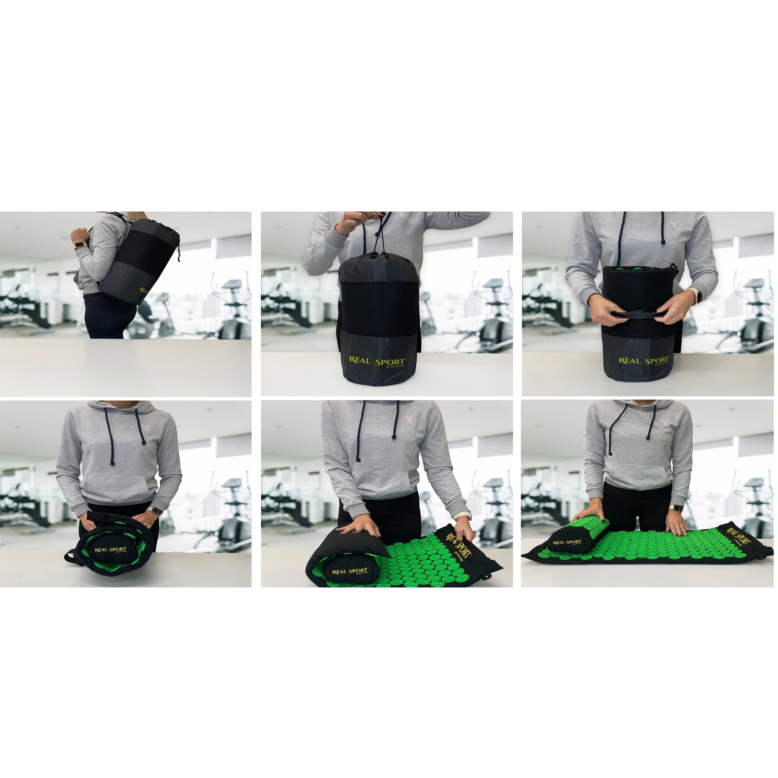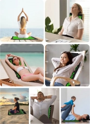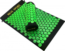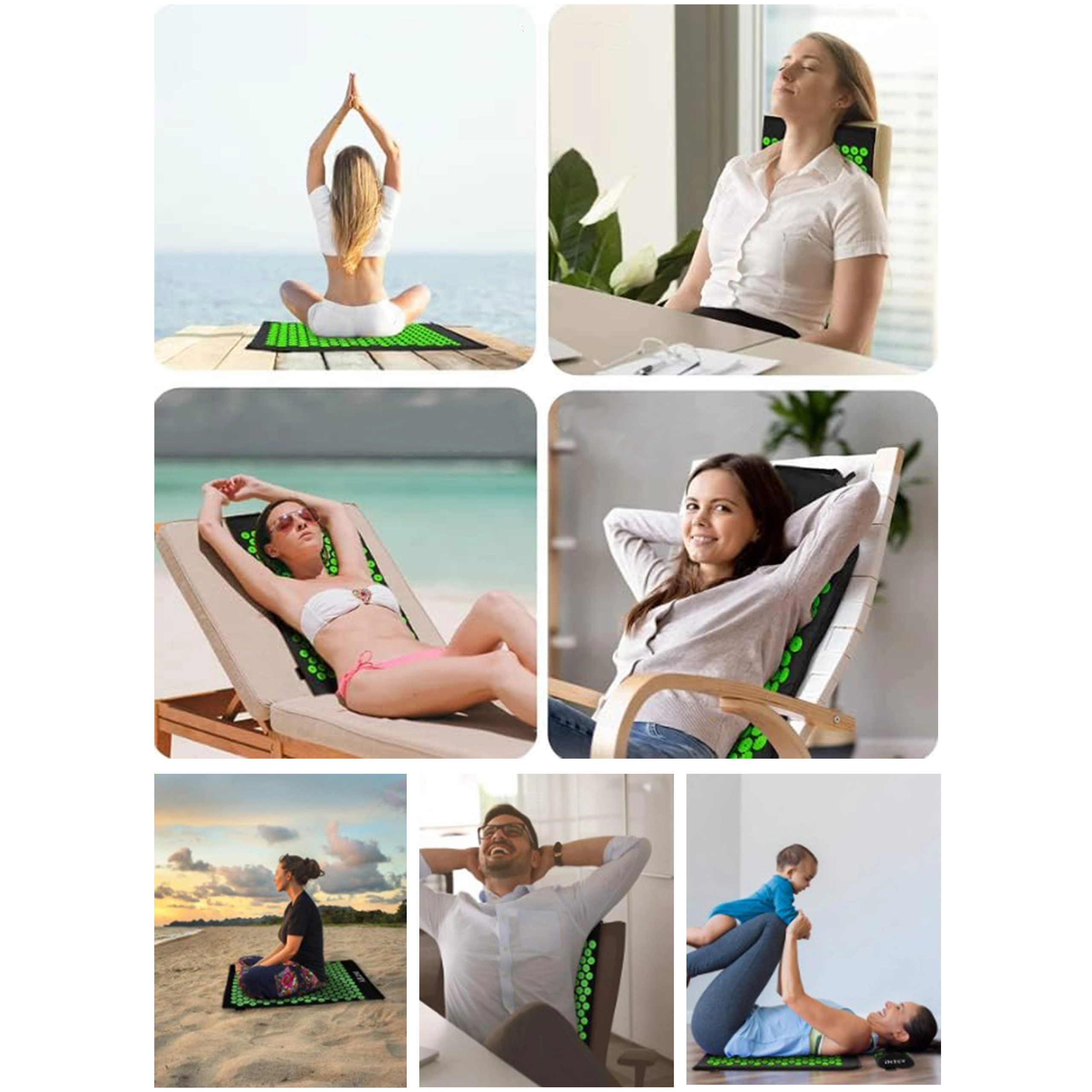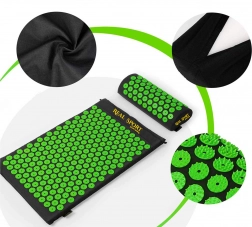 Akupressursættet (måtte + pude) efterligner effekten af traditionel akupressur og hjælper med at lindre spændinger i ryg, nakke og skuldre. De mange grønne skiver med pigge retter sig mod trykpunkter og fremmer afslapning, musklernes restitution og naturlig blodcirkulation. Takket være den lette konstruktion og den medfølgende taske kan du nemt tage den med hjem, på kontoret og på rejser.