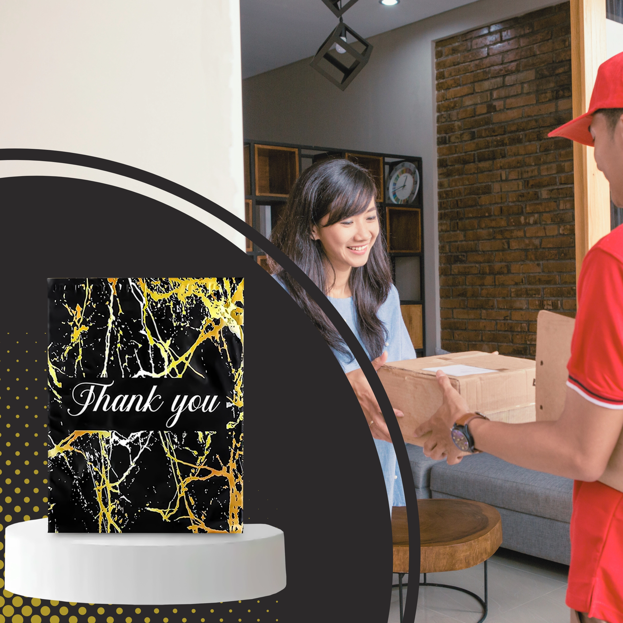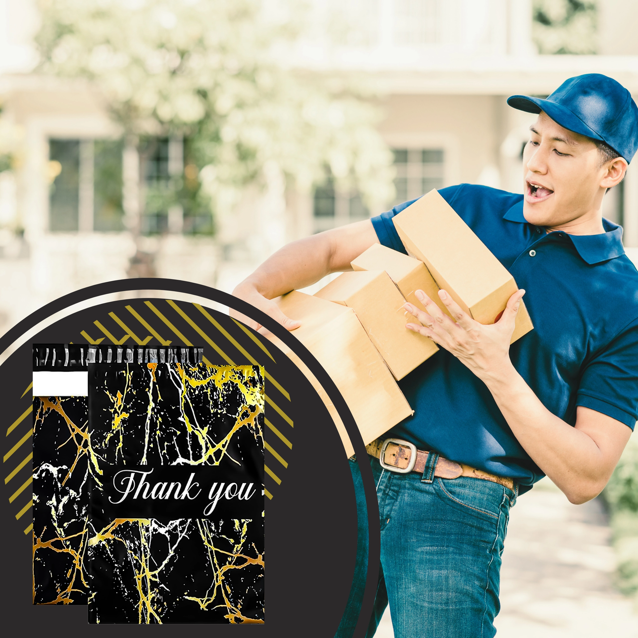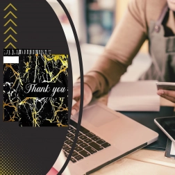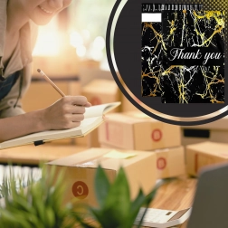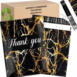 Leder du efter en pålidelig emballageløsning til dine forsendelser? Disse kurér-foliopakker kombinerer holdbarhed, sikkerhed og et professionelt udseende. Den mat sorte overflade med gylden marmor og en Thank You-hilsen virker repræsentativ og styrker købsoplevelsen.