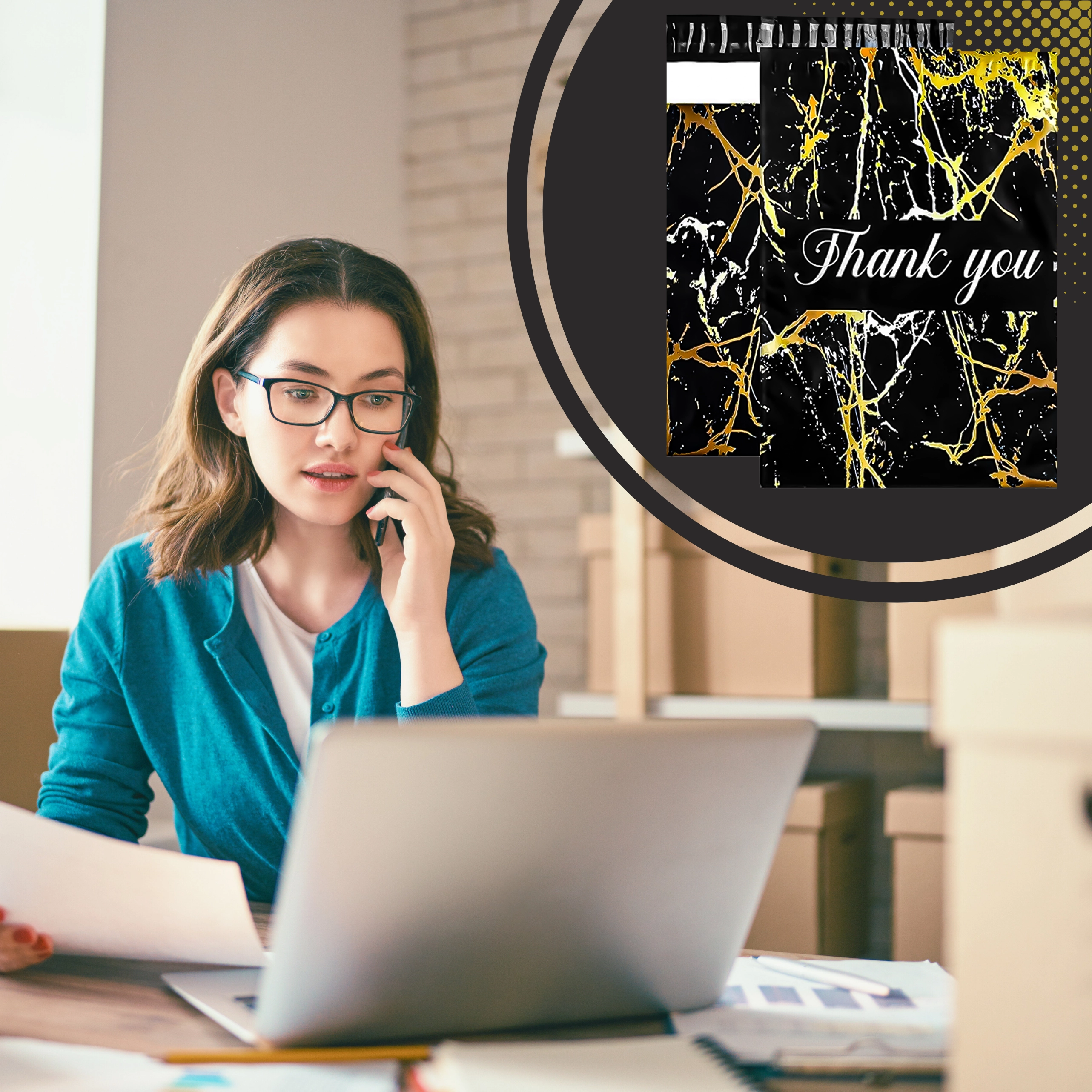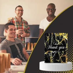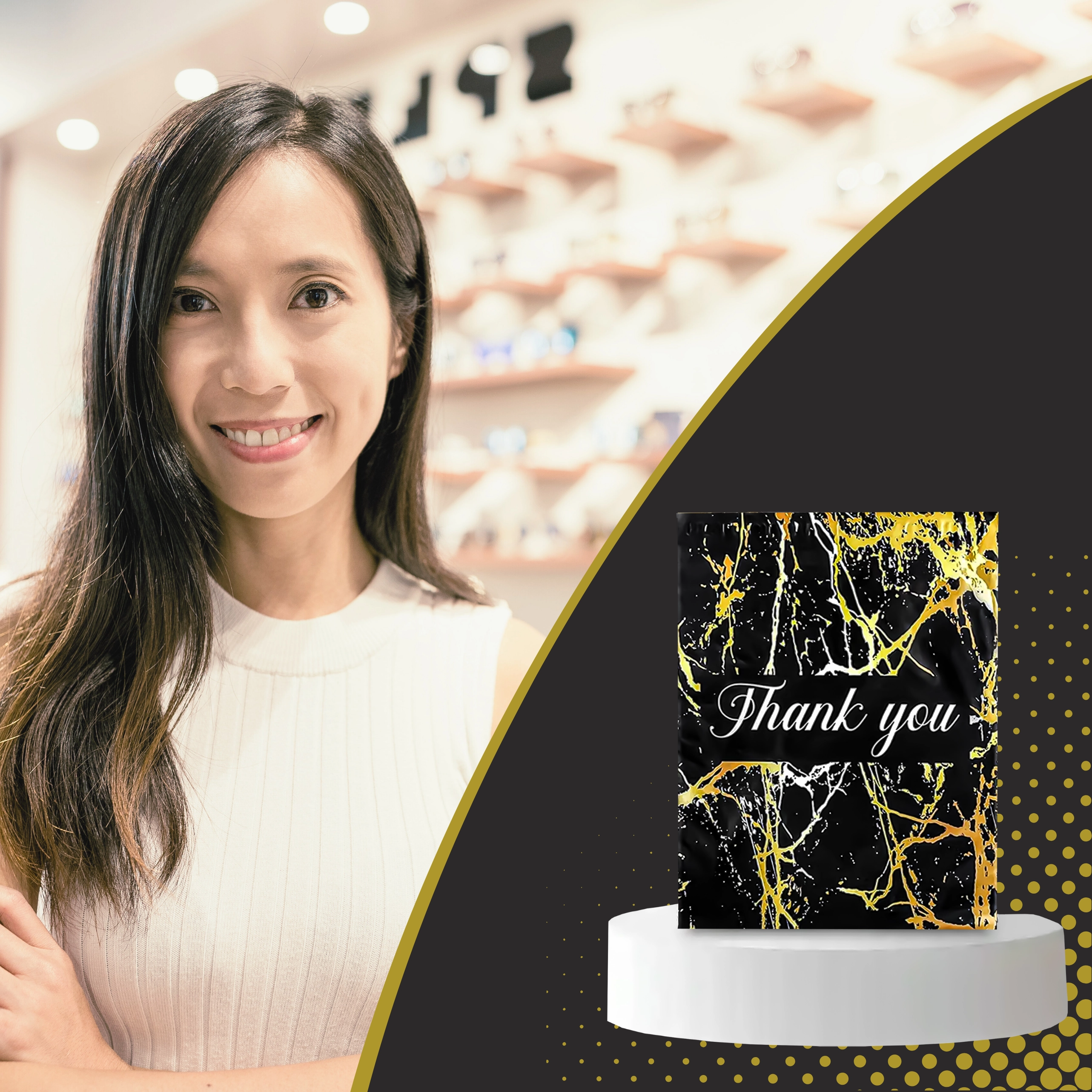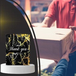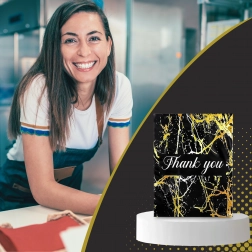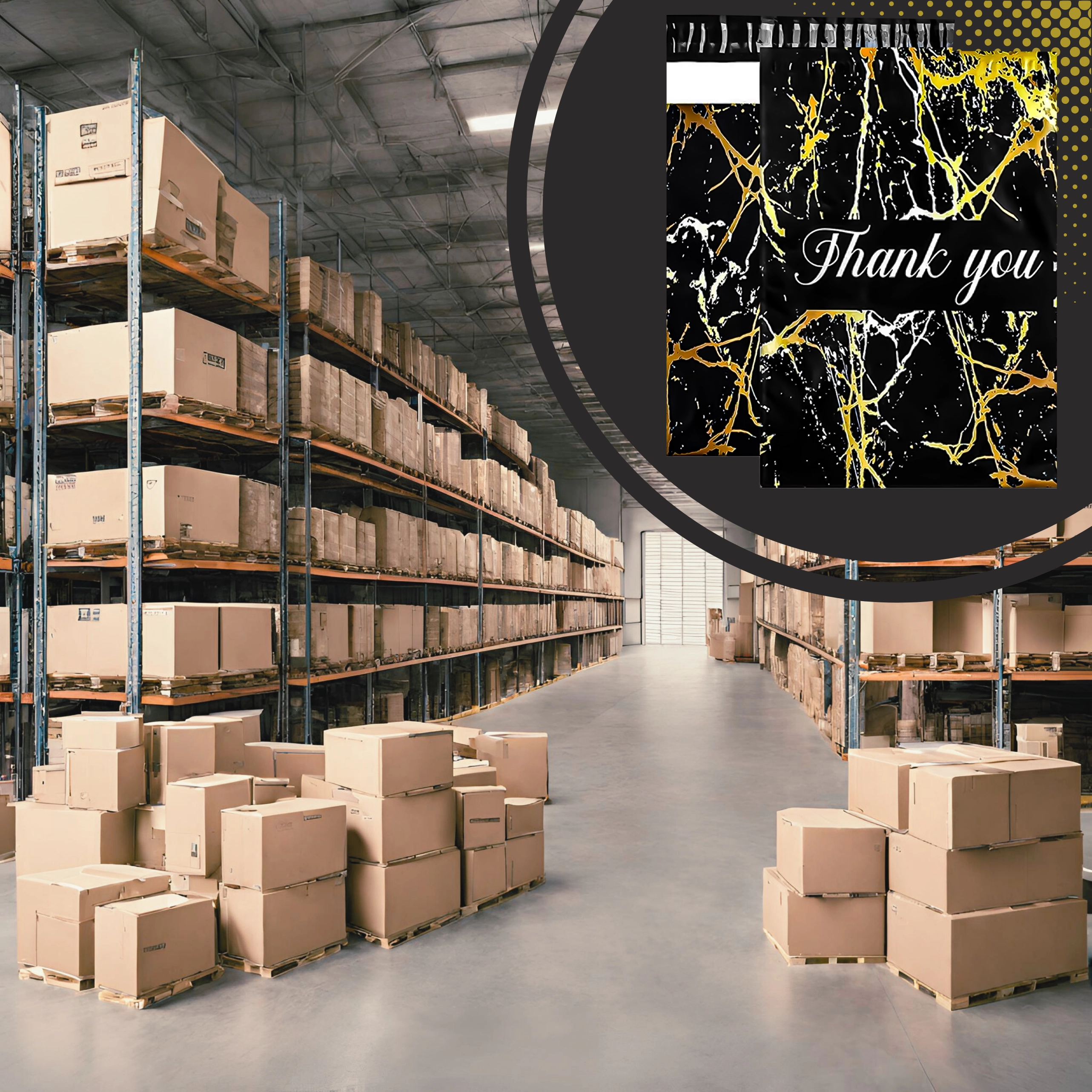 Leder du efter en pålidelig emballageløsning til dine forsendelser? Disse kurér-foliopakker kombinerer holdbarhed, sikkerhed og et professionelt udseende. Den mat sorte overflade med gylden marmor og en Thank You-hilsen virker repræsentativ og styrker købsoplevelsen.