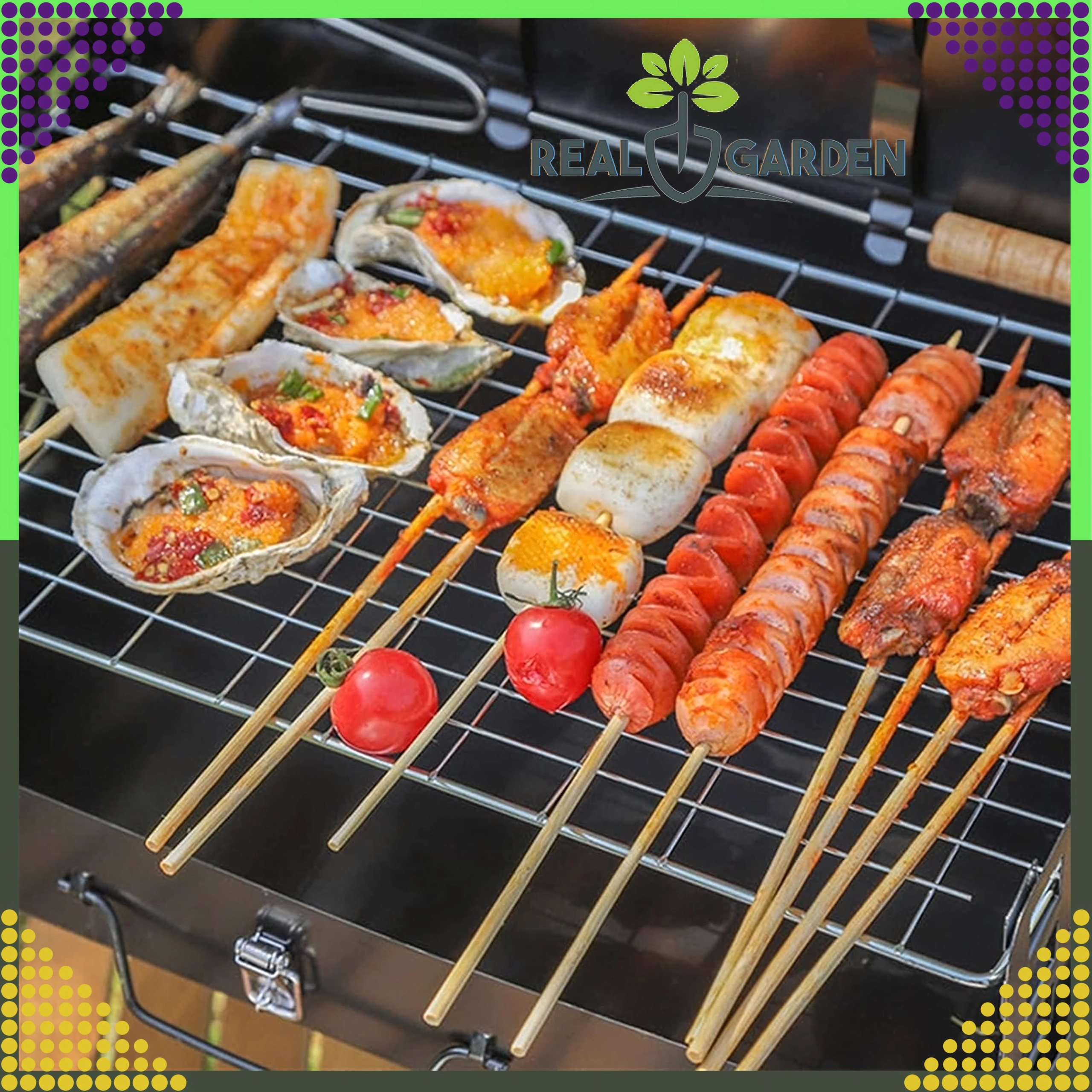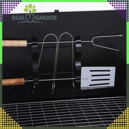Takket være ventilationsåbningerne er kulforbrændingen mere effektiv, så maden tilberedes hurtigere og mere jævnt. På siderne finder du praktiske greb til nem transport. I pakken får du desuden grundlæggende tilbehør – spade, tang og spid, så du kan begynde at grille med det samme.