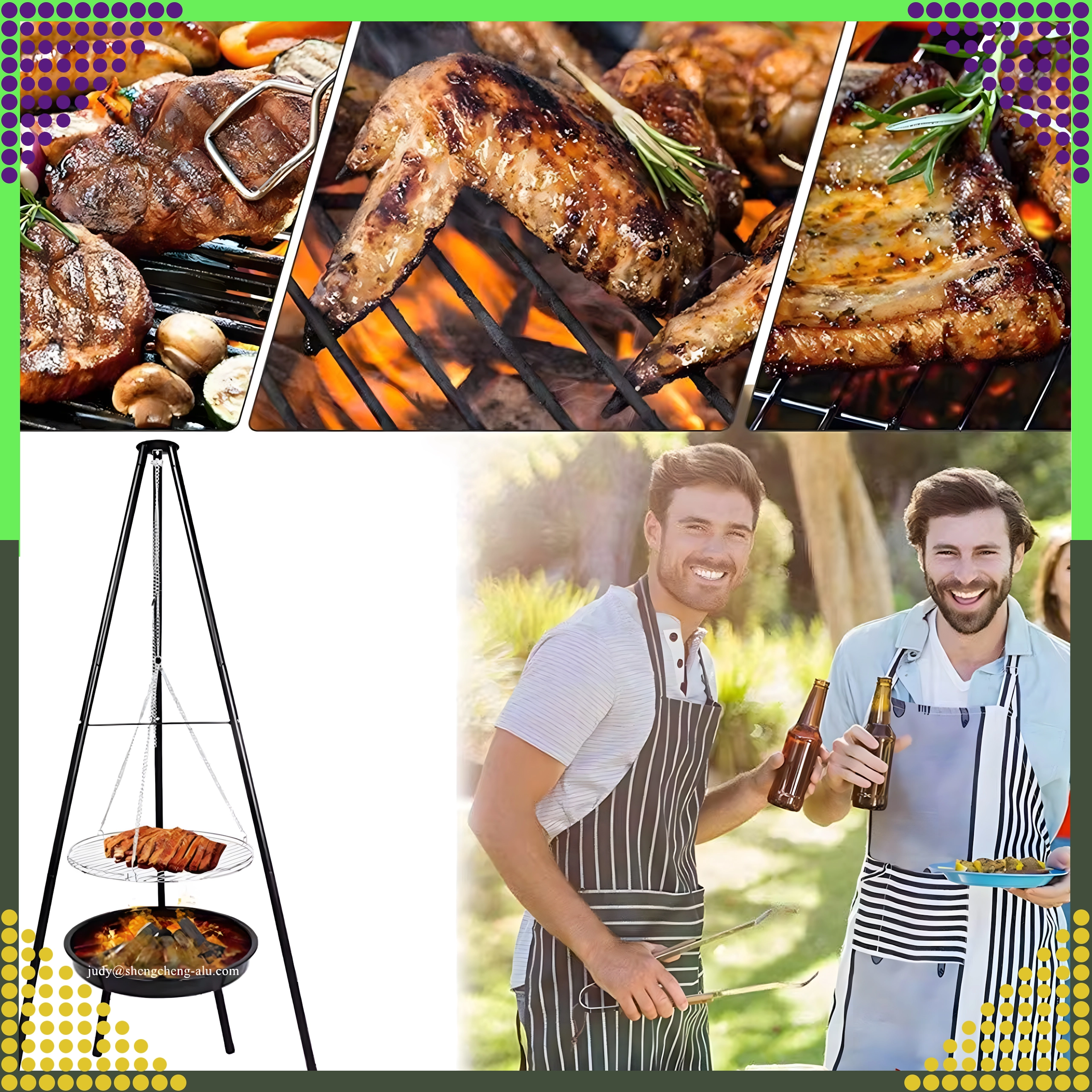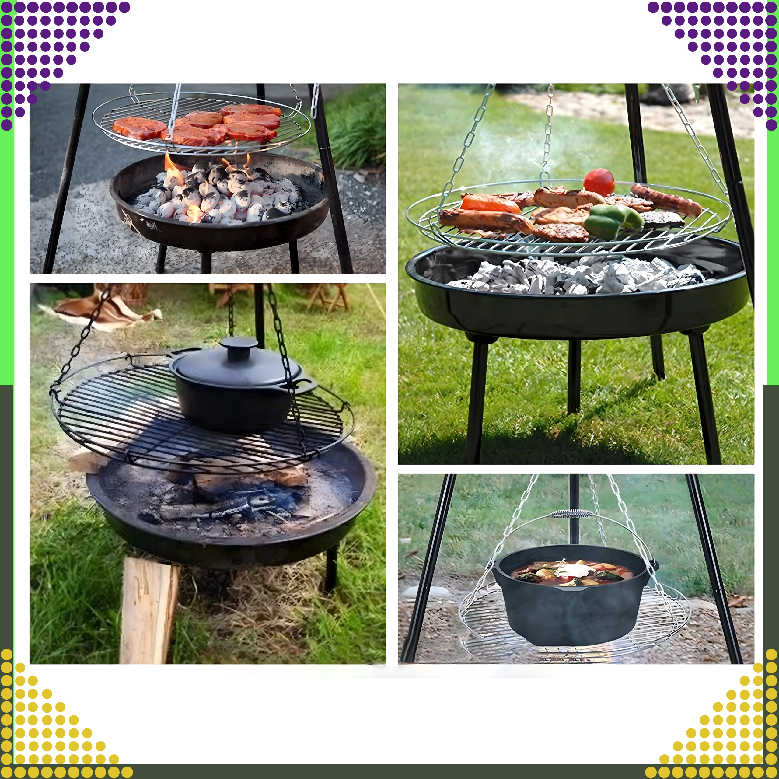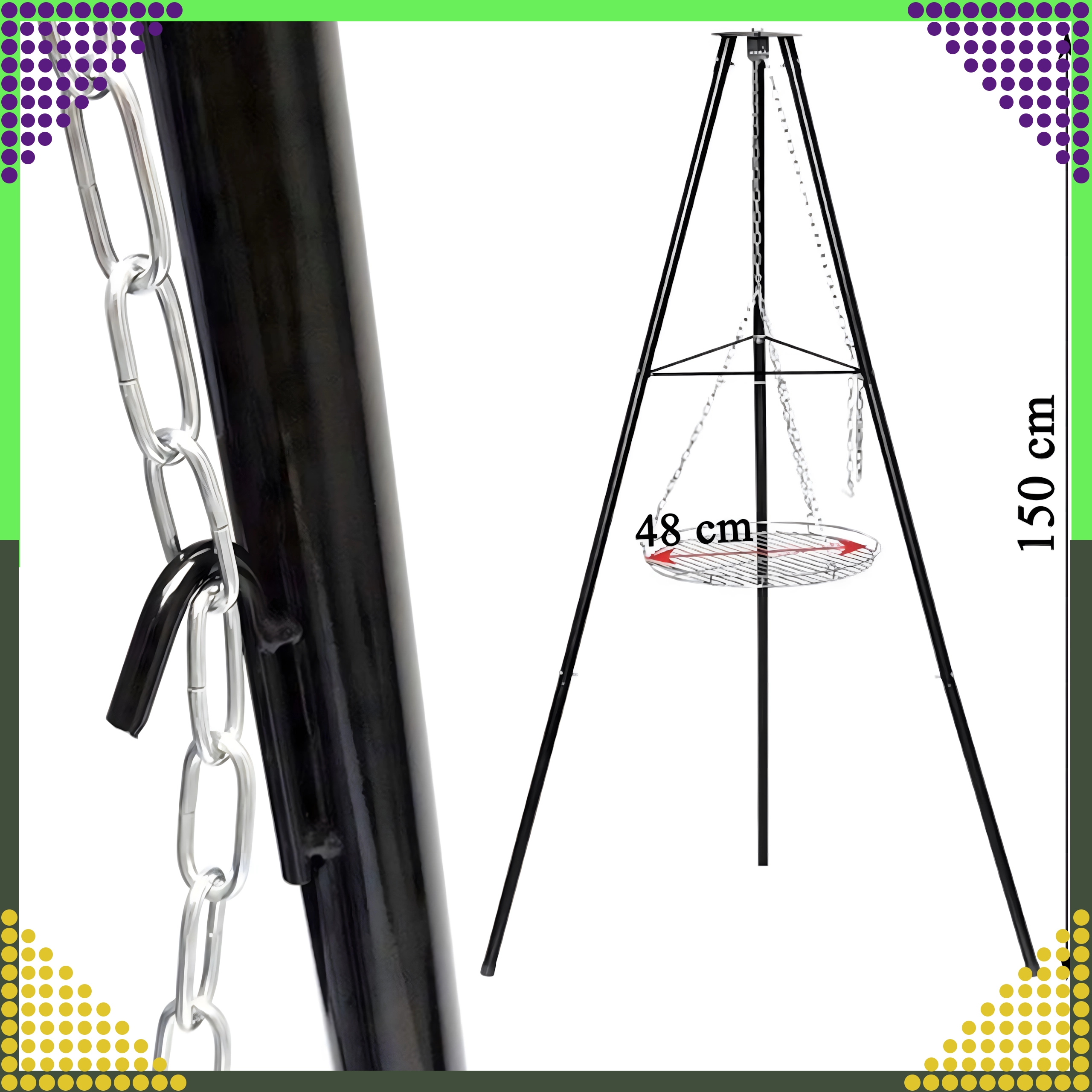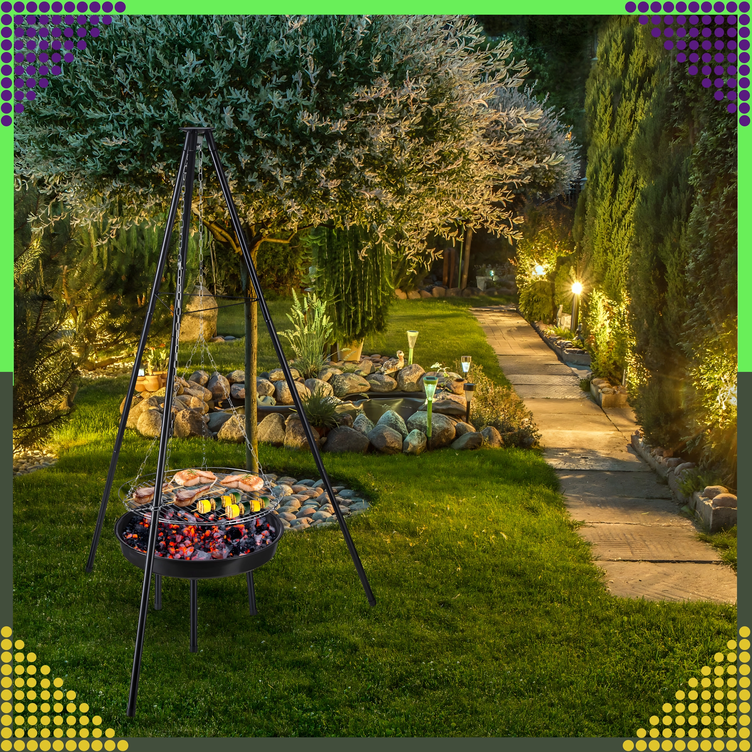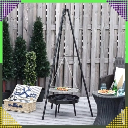 Denne elegante og robuste trefodsgrill til haven er en fremragende løsning for alle, der vil grille over åben ild, men ikke har en fast bålplads. Den højdejusterbare rist (Ø 50 cm) med kædeophæng giver præcis temperaturkontrol og jævn tilberedning af både kød og grøntsager. Den stabile trefodskonstruktion i pulverlakeret stål er modstandsdygtig over for høje temperaturer og nem at vedligeholde.