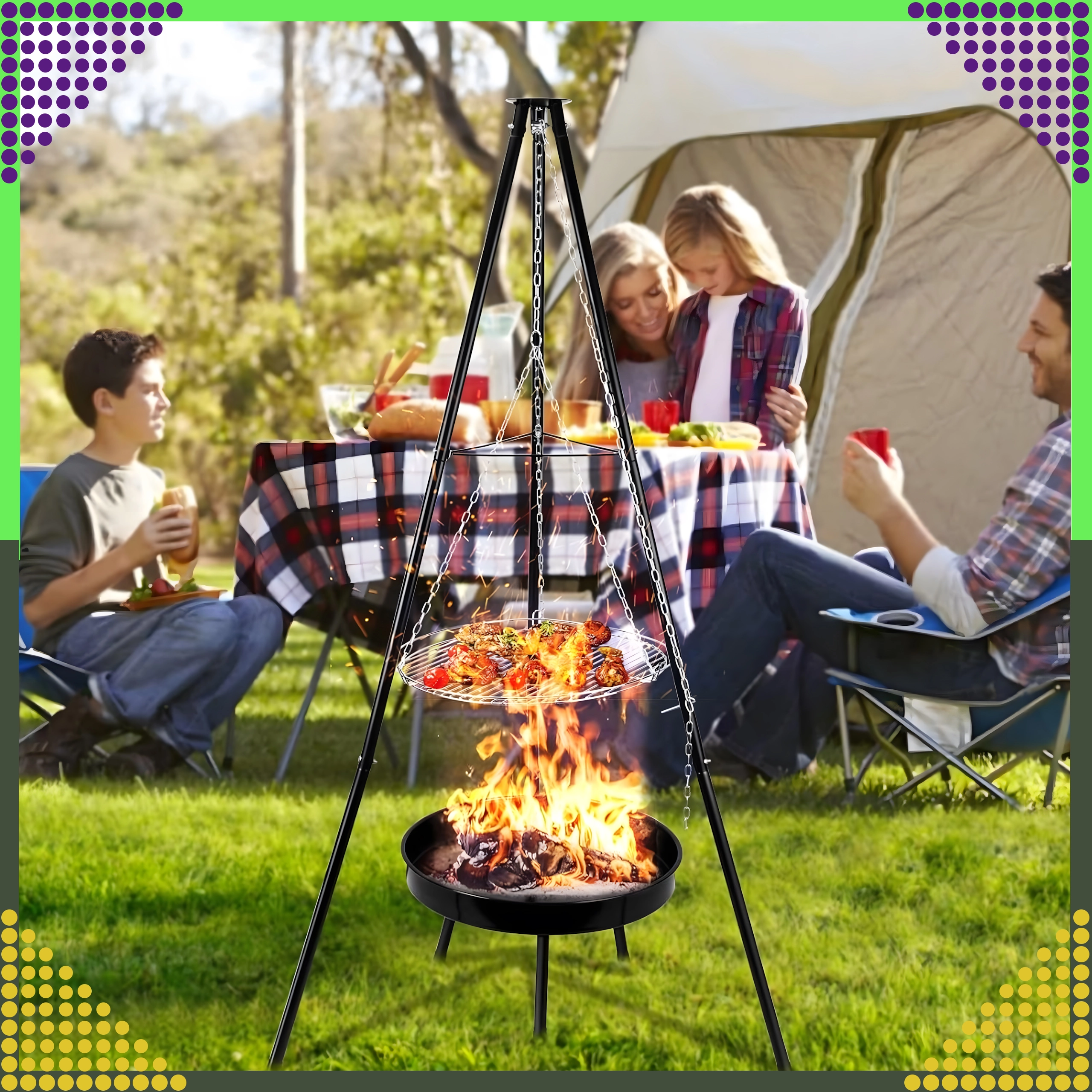 Trefodskonstruktionen i pulverlakeret stål tåler høje temperaturer og sikrer sikker grillning i haven og på campingpladsen.