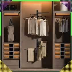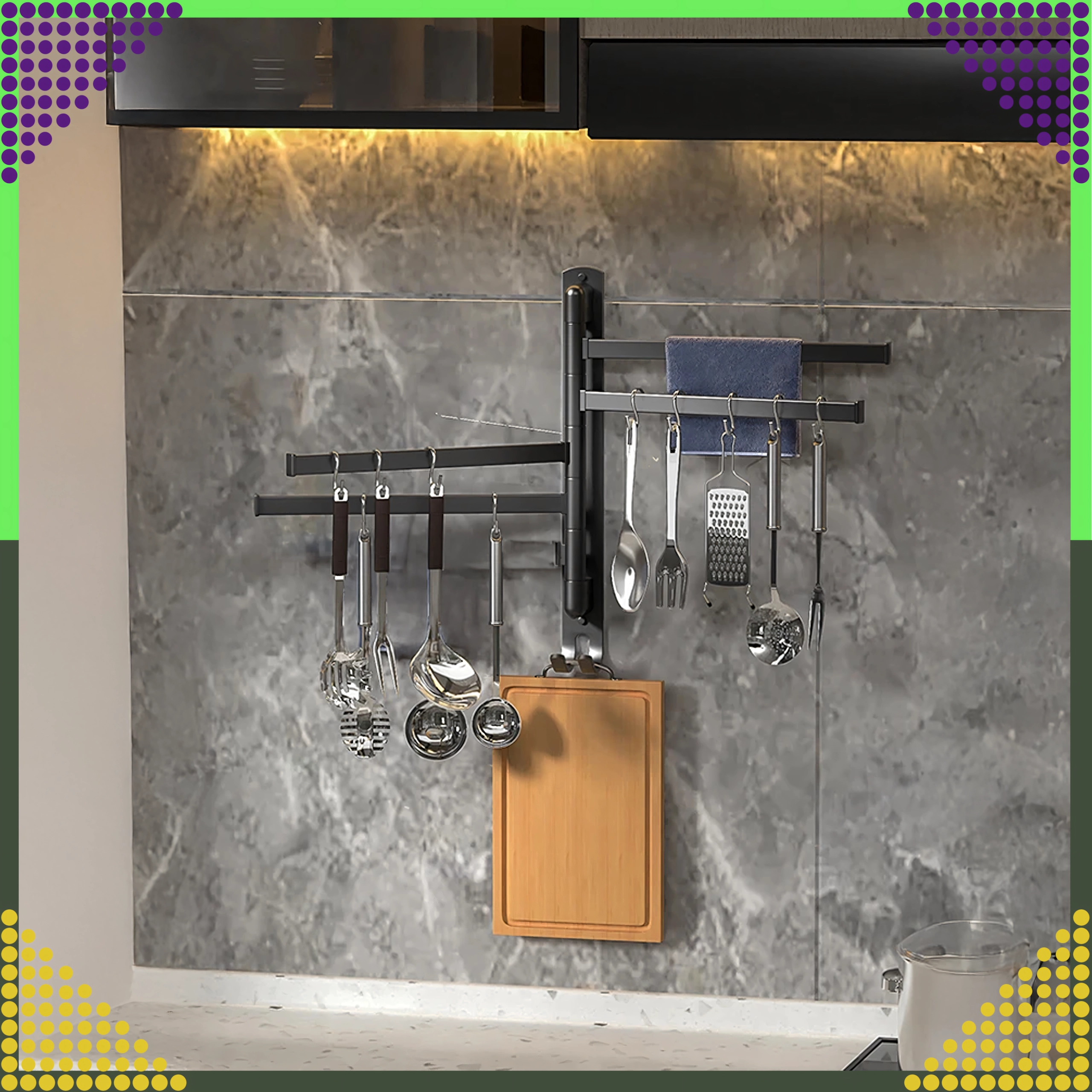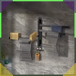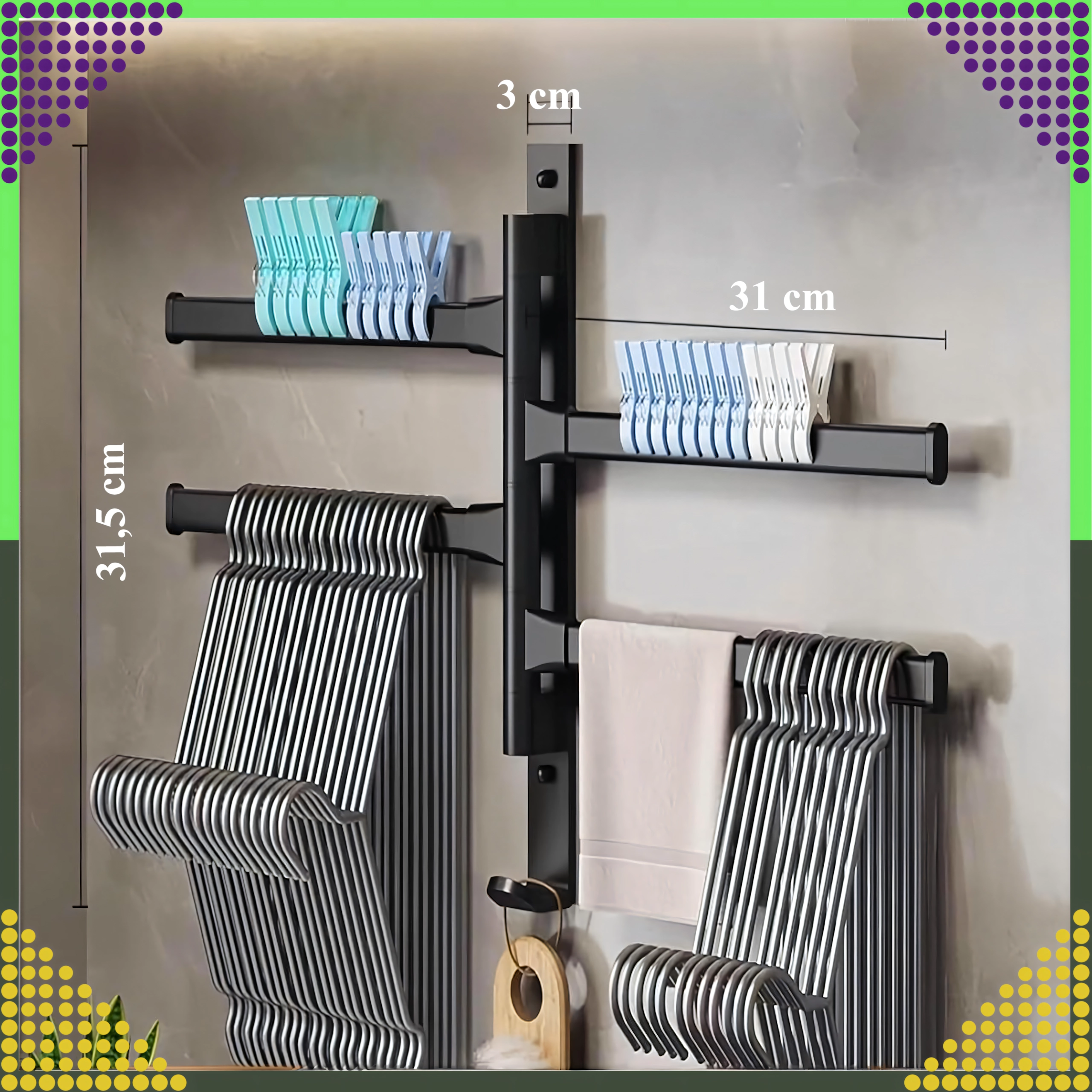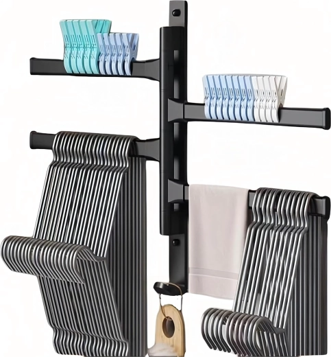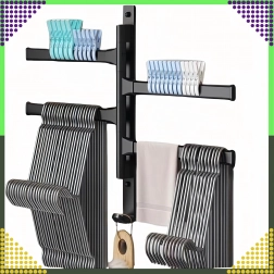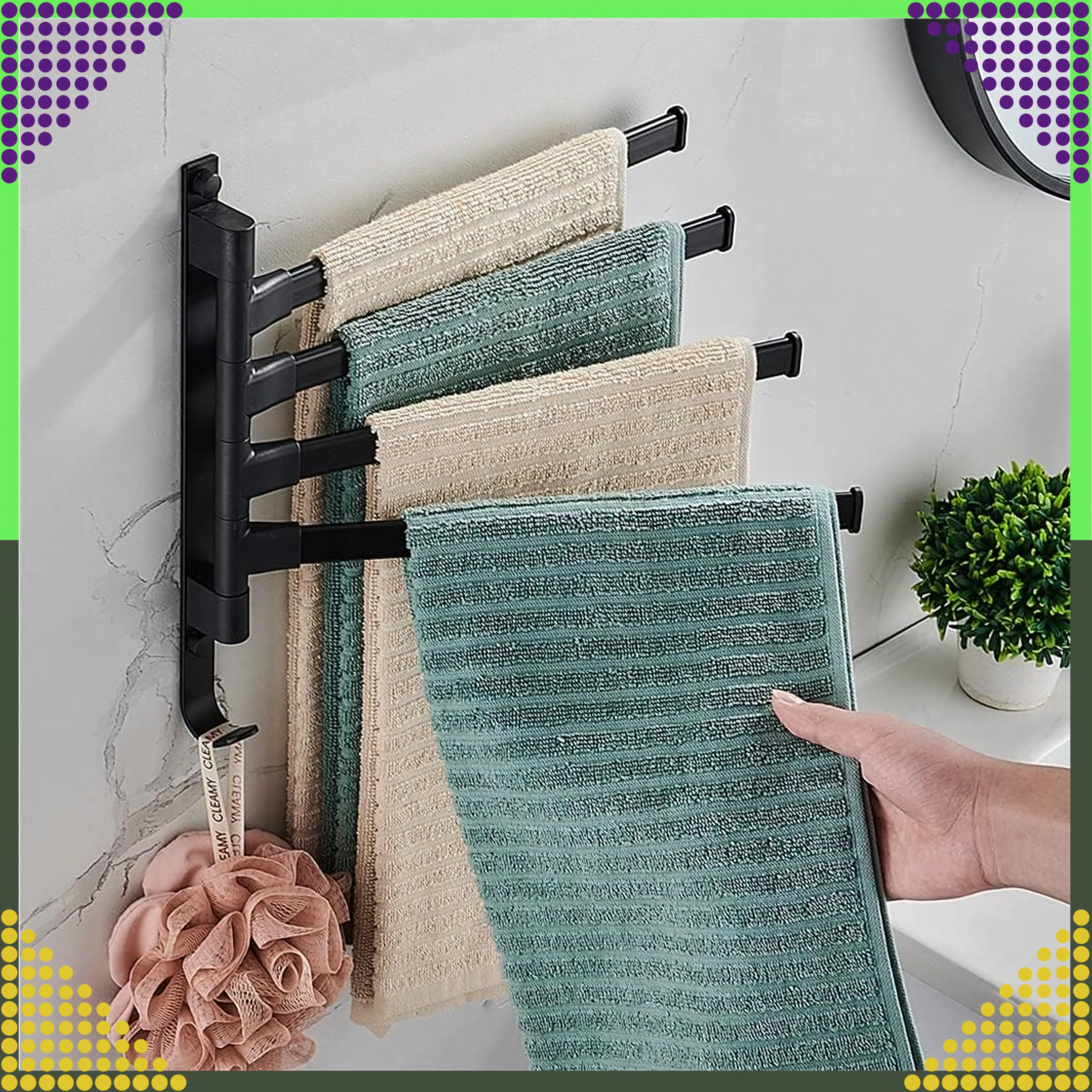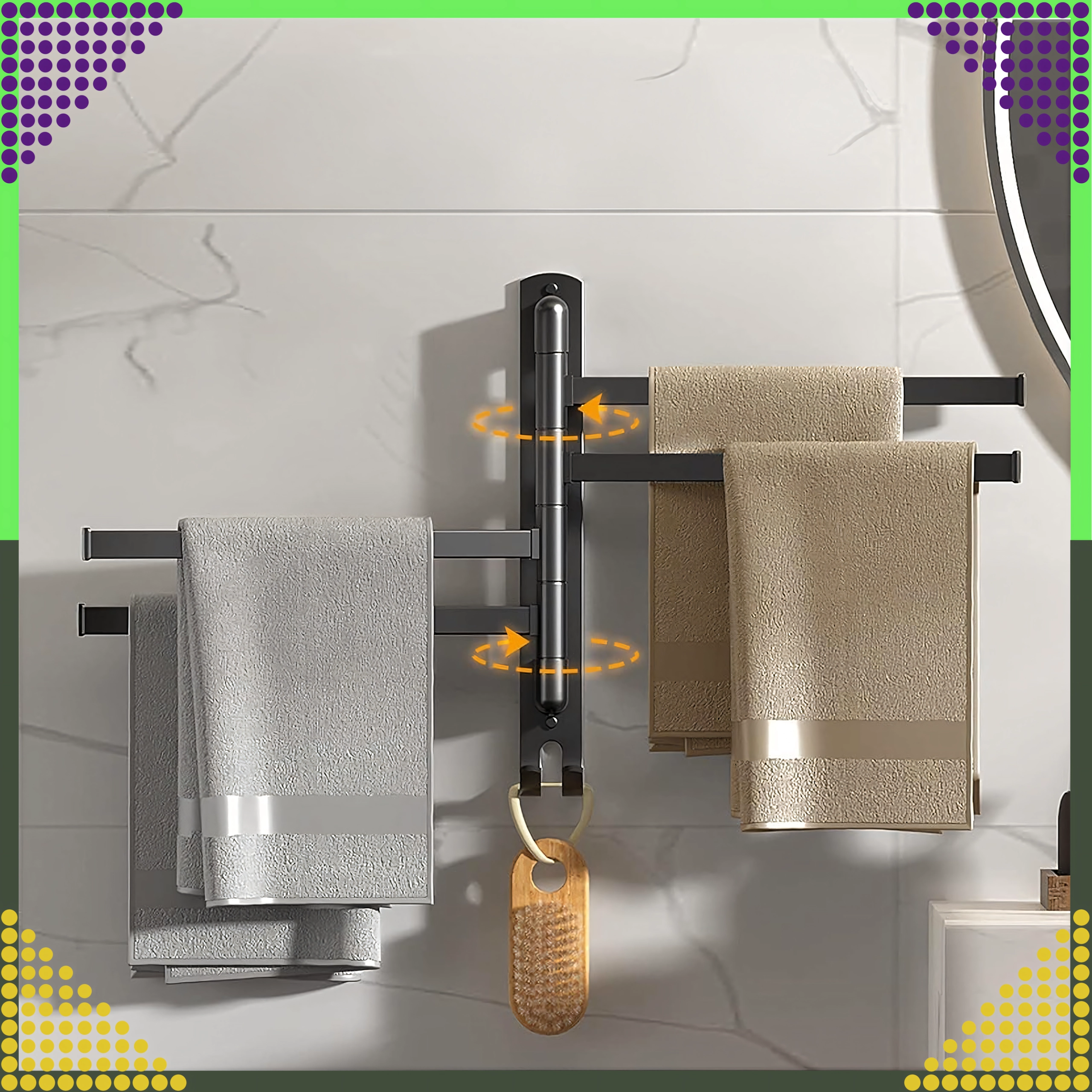 Denne alsidige drejelige holder er ideel til badeværelse, køkken og garderobe. Fire uafhængigt udsvingsbare arme giver nem ophængning af flere håndklæder eller viskestykker på én gang, bedre luftcirkulation og hurtigere tørring. Den nederste krog er desuden praktisk til børster, svampe eller tilbehør.