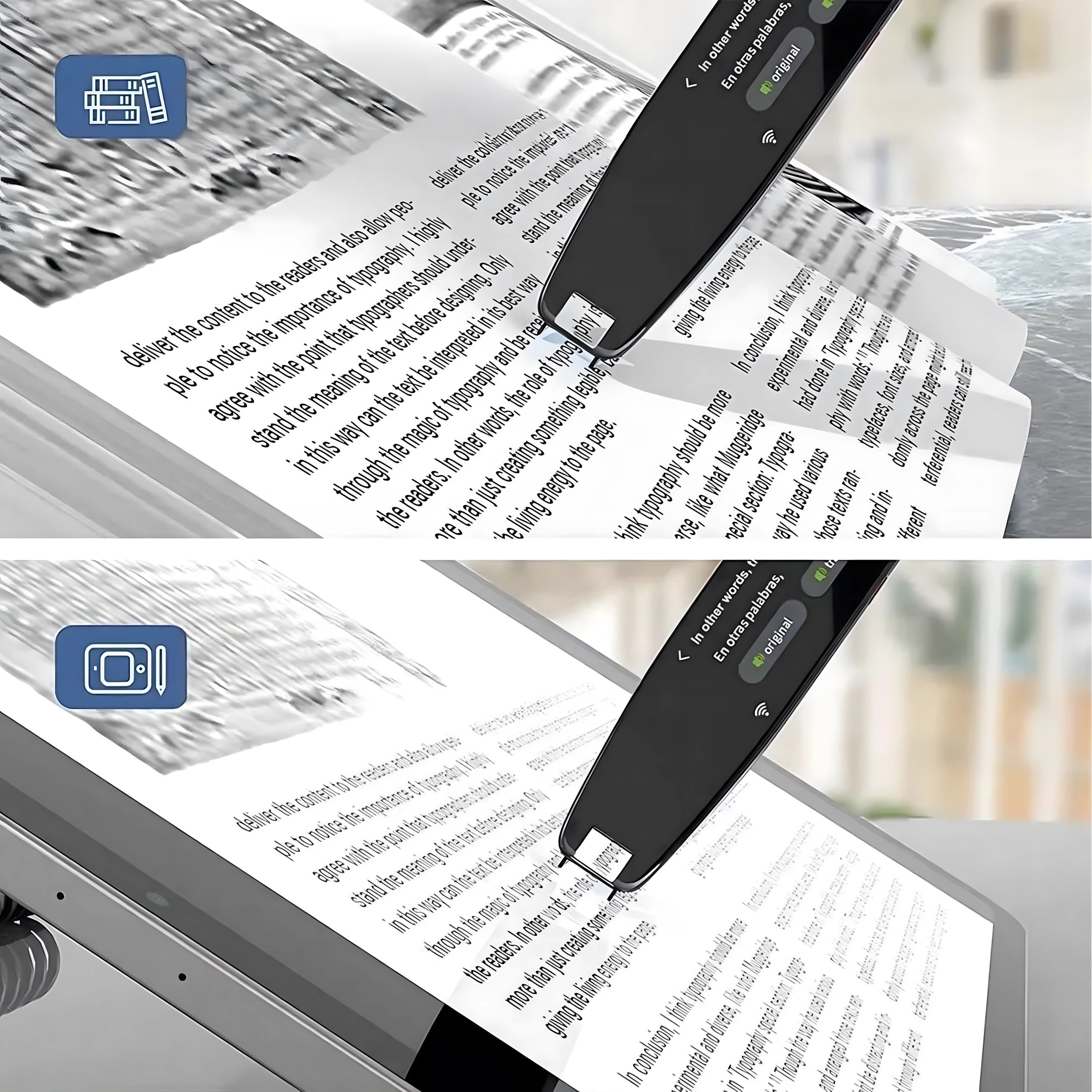 Strøg langs tekstlinjen og se oversættelse samt udtale på skærmen. Ideel til bøger, kompendier og arbejdsdokumenter.