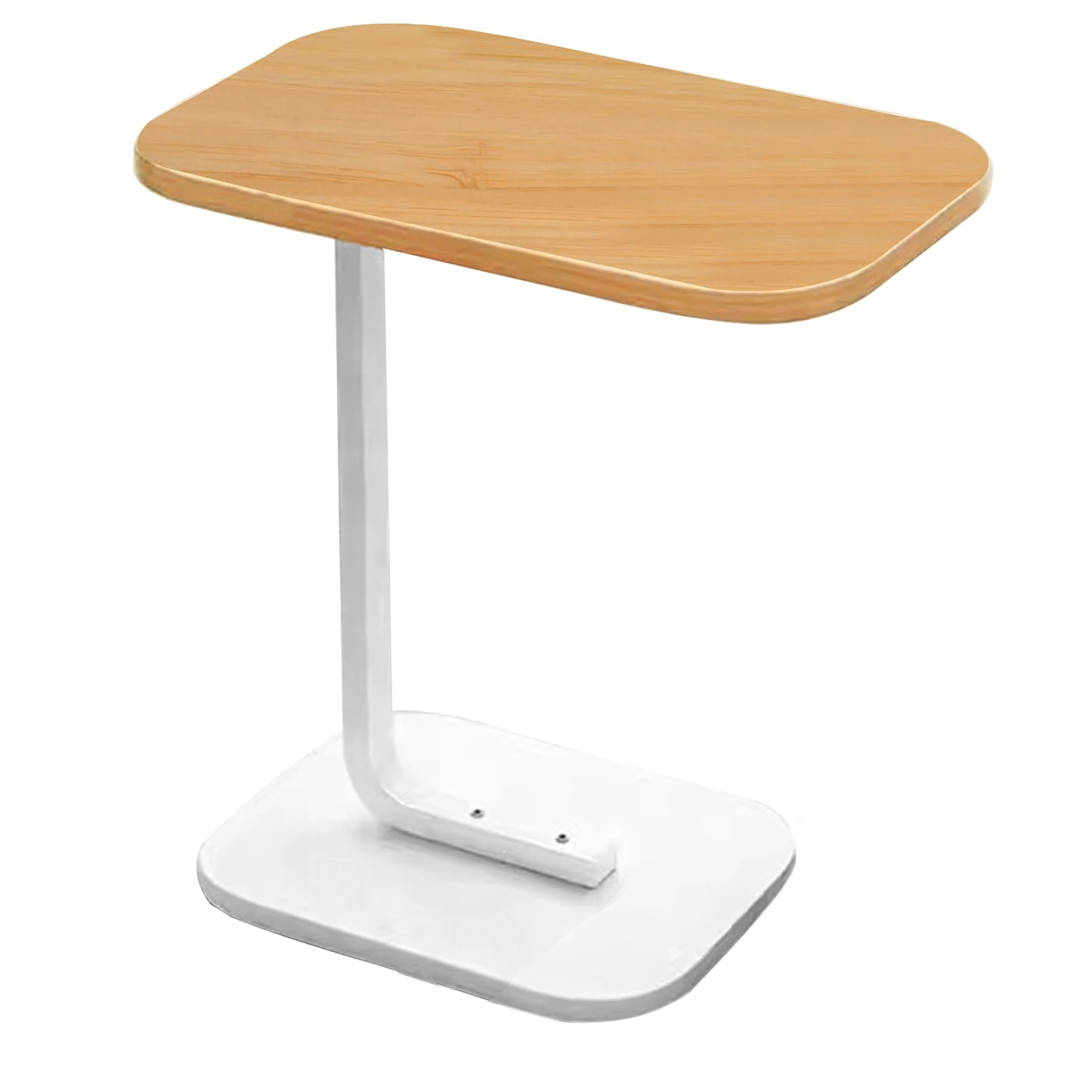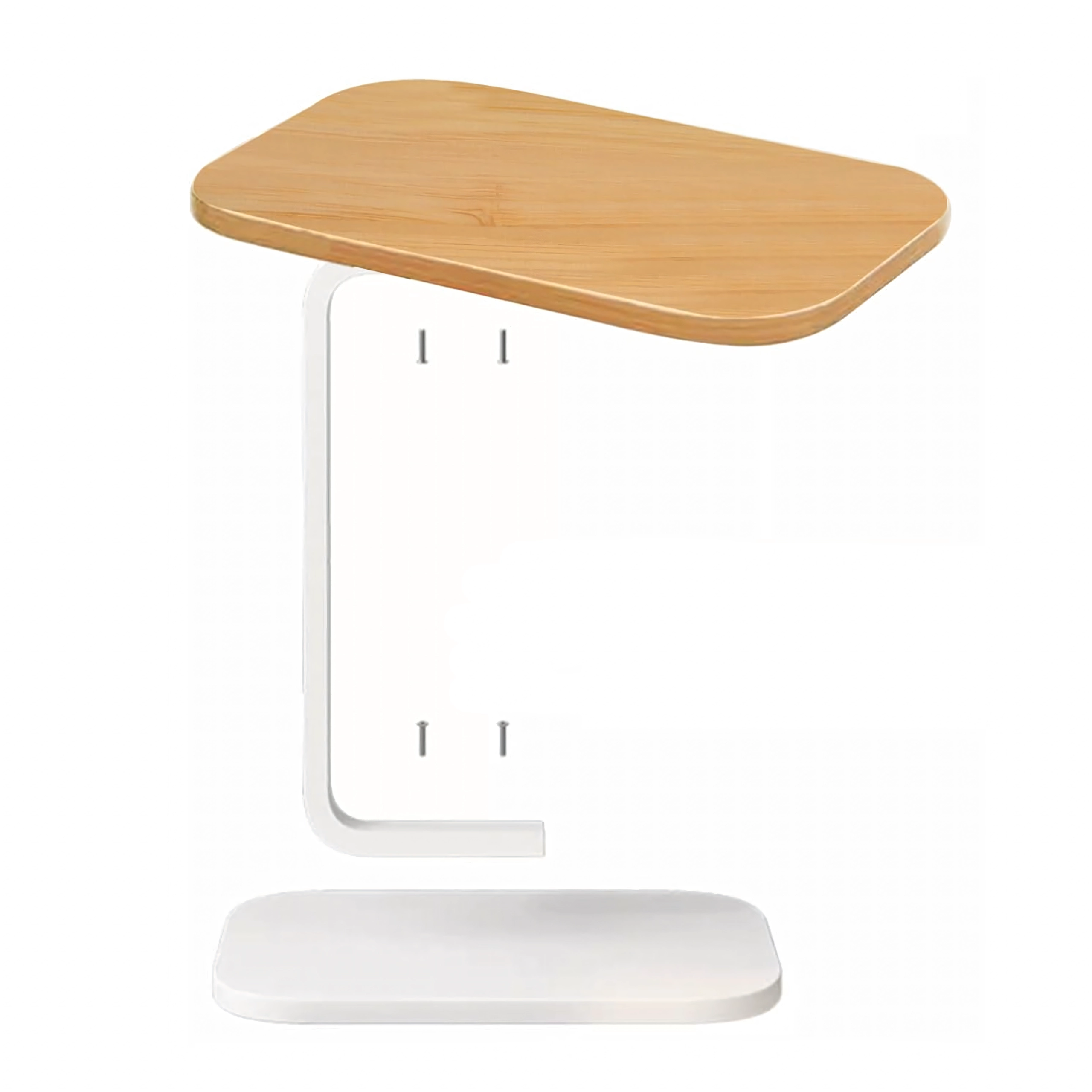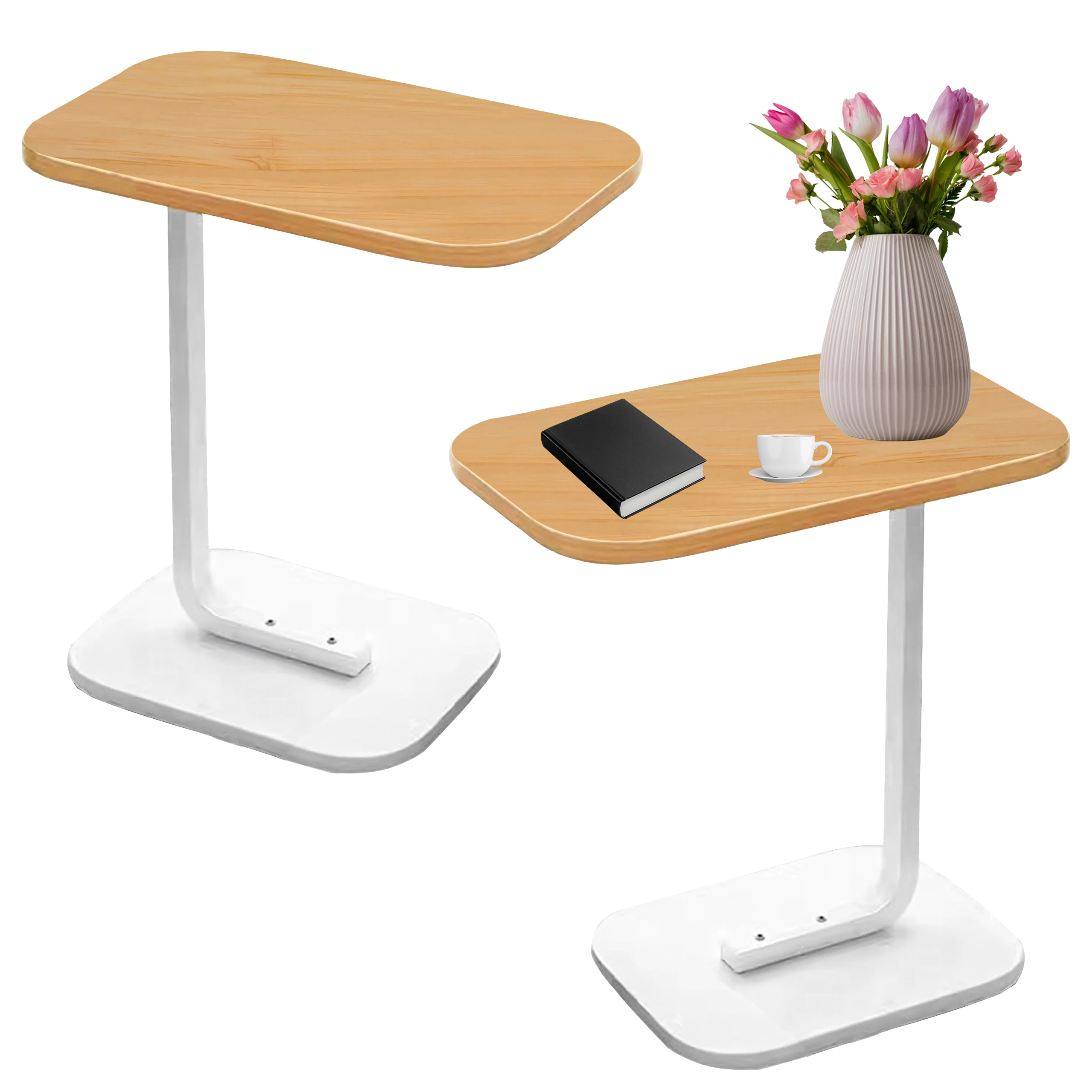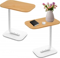 Pladsbesparende bord med oval/afrundet bordplade i lyst trælook og solid hvid metalkonstruktion, som giver komfortabel brug ved sofaen eller sengen. C-formen gør det muligt at skubbe basen ind under møblerne og bringe bordpladen præcis derhen, hvor du har brug for den.