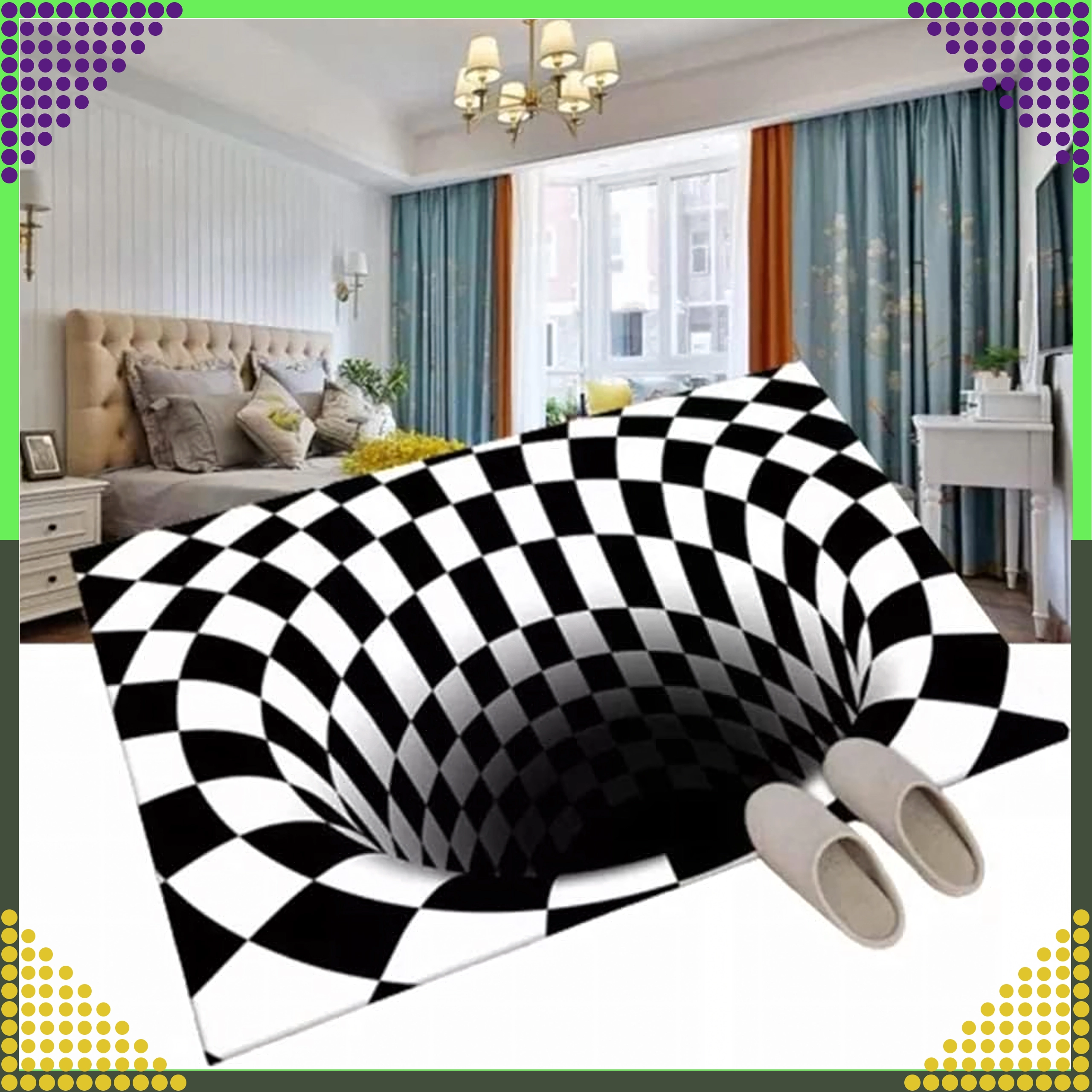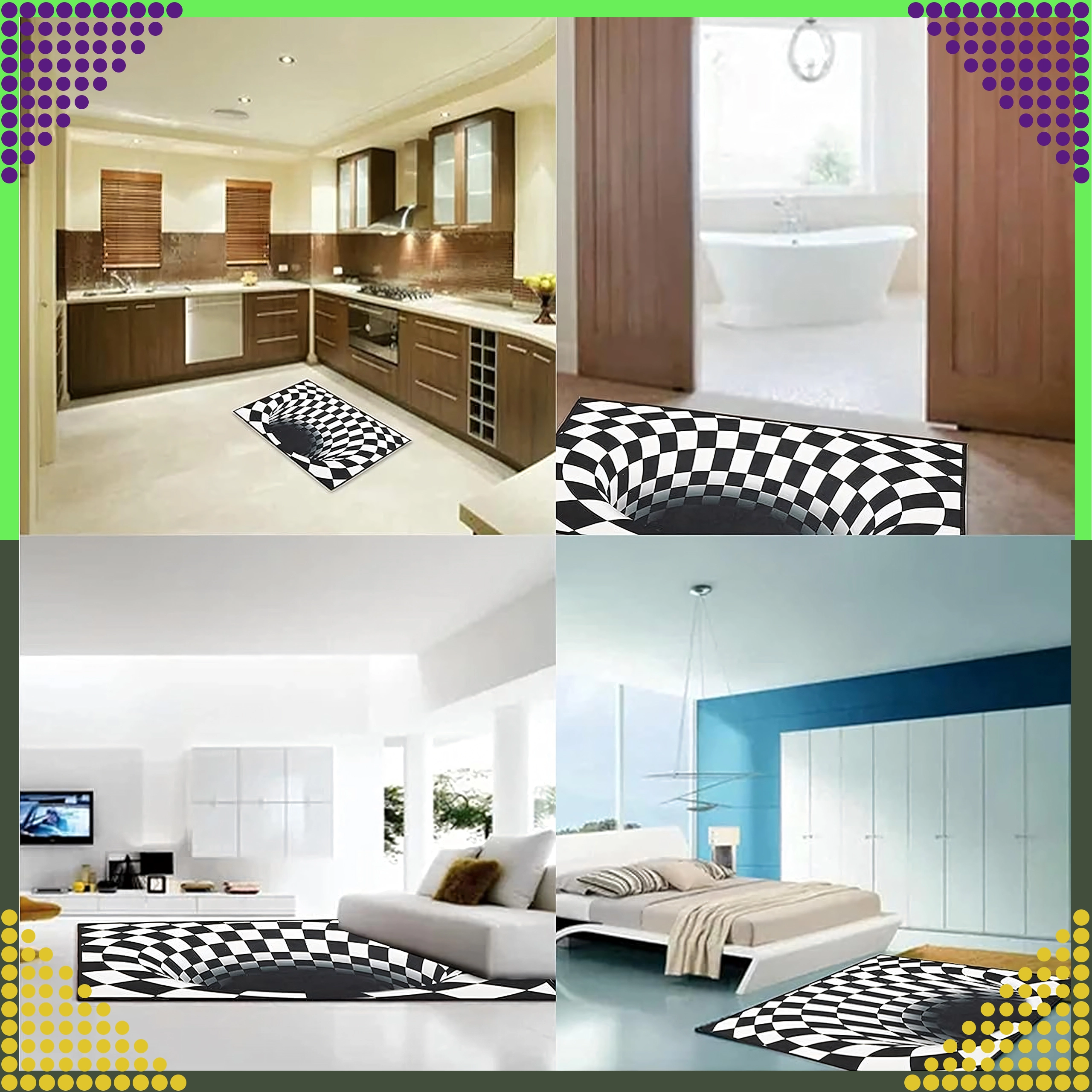 Denne moderne indgangsmåtte med 3D‑illusion af en hvirvel skaber en markant optisk effekt, der imponerer enhver gæst. Den lave profil og behagelige overflade giver komfort ved hvert skridt og er praktisk i entréer, gange, badeværelser eller ved døren.