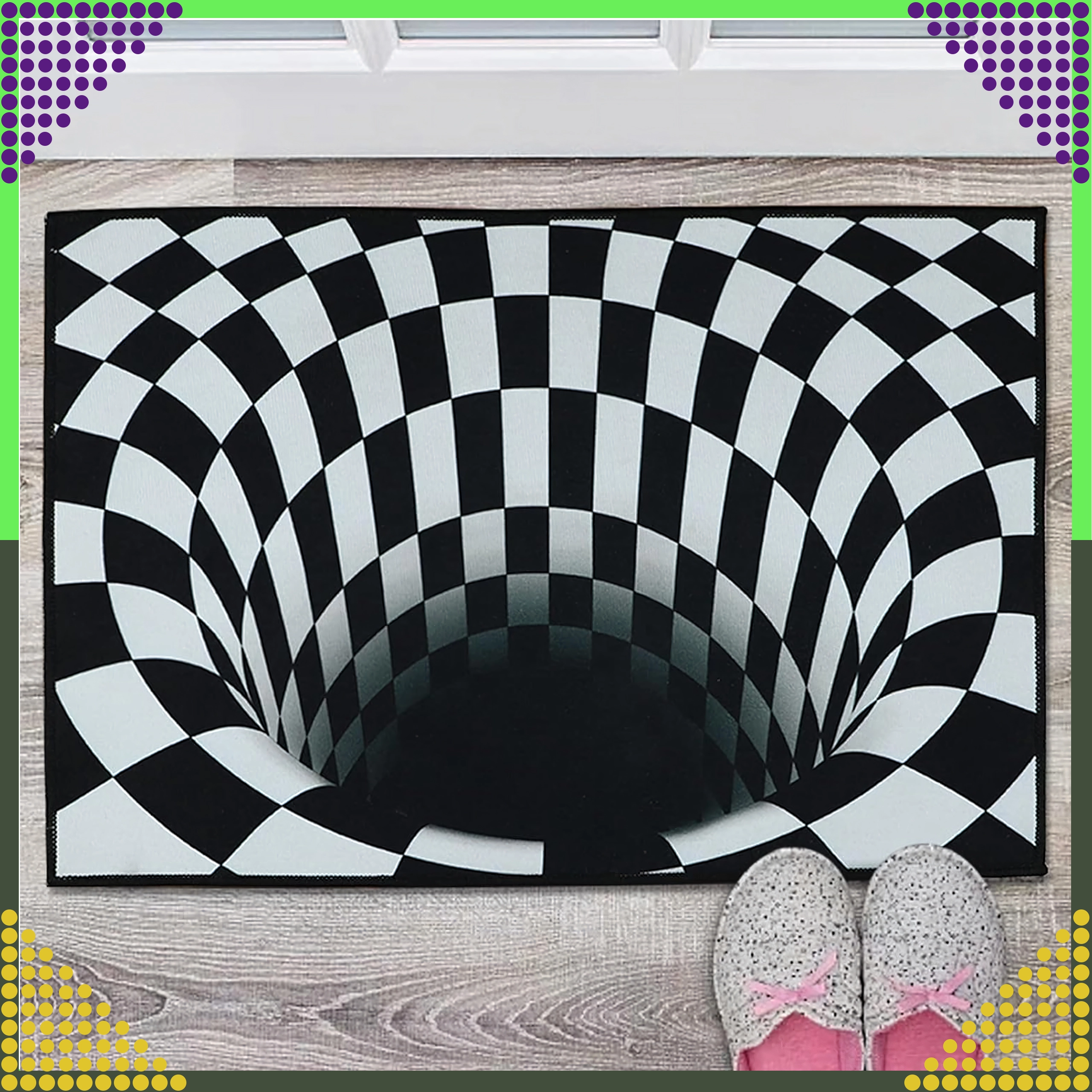 Sort‑hvidt skakternet vortex skaber en markant optisk dybdeillusion. Et stilfuldt element, der løfter enhver indretning og indgang.