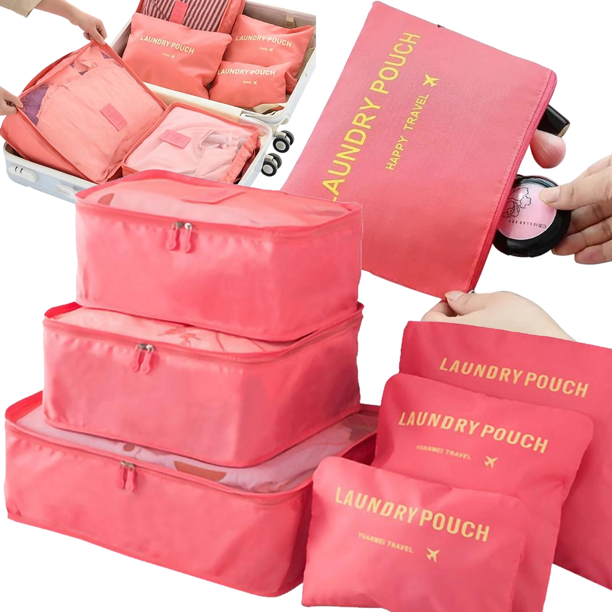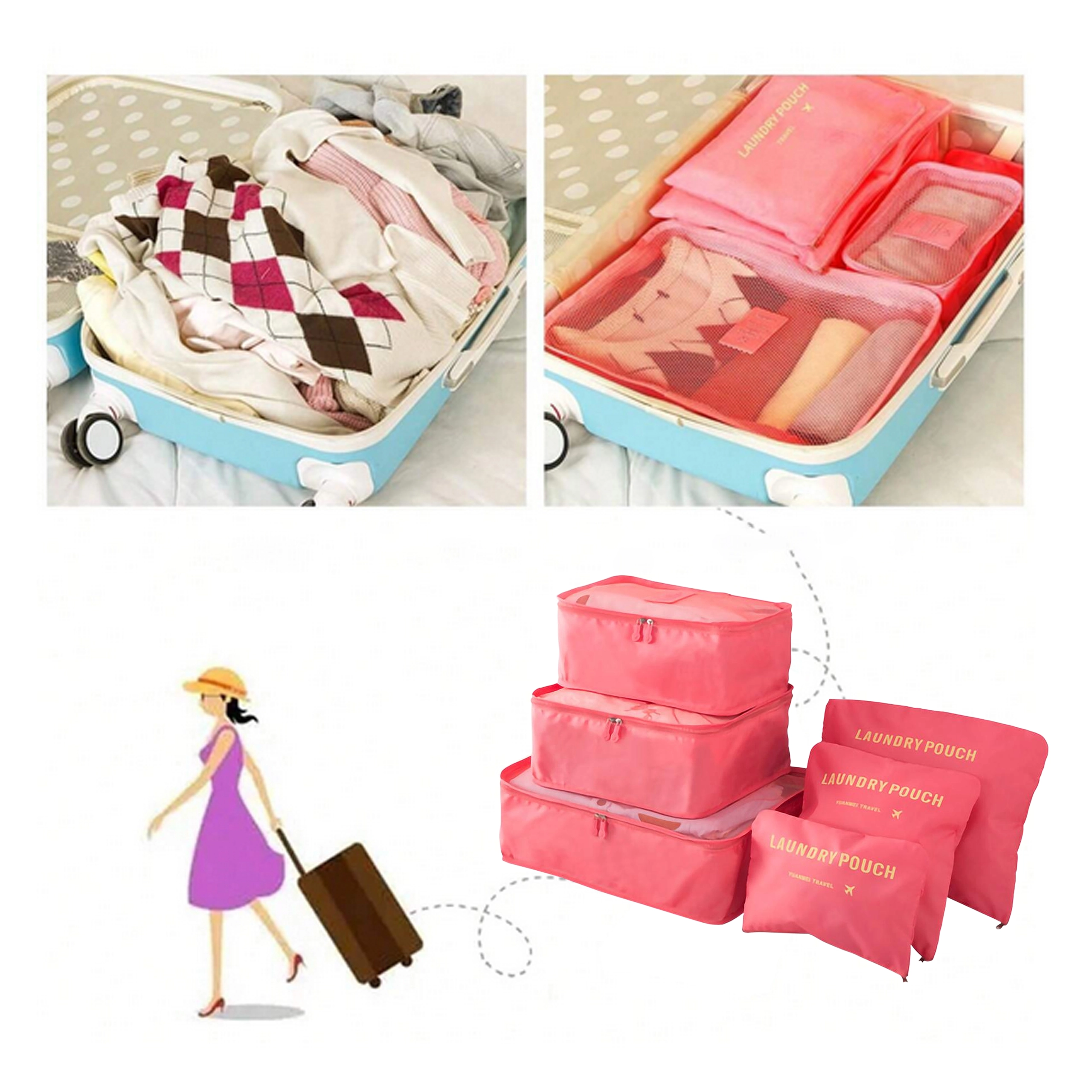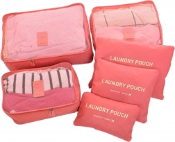 Sættet indeholder tre rummelige kuber med åndbart net og tre flade lommer mærket “Laundry Pouch” til snavset tøj. Det lette tekstilmateriale og de holdbare lynlåse sikrer nem pakning, overblik og beskyttelse af tingene under rejsen.