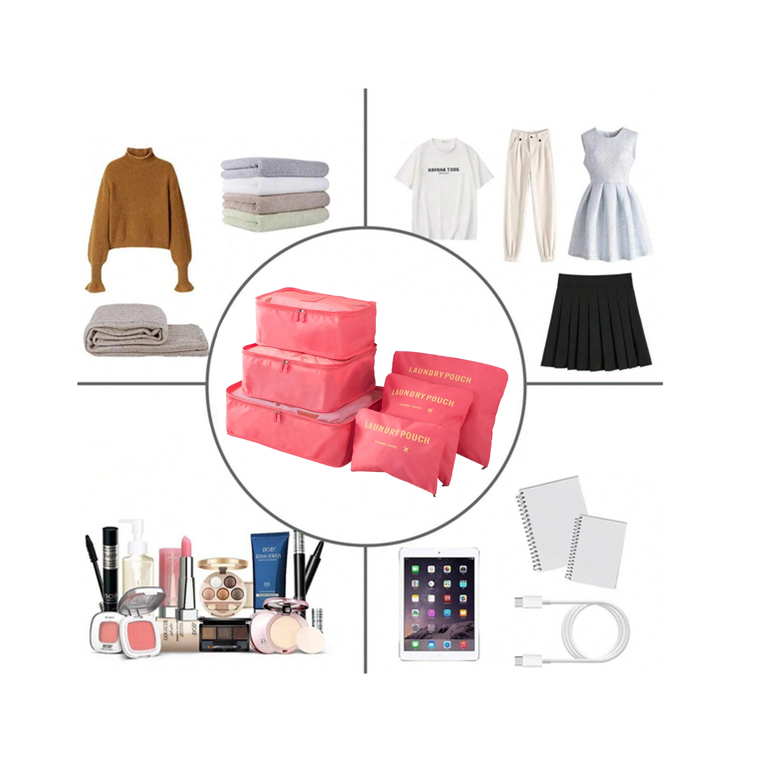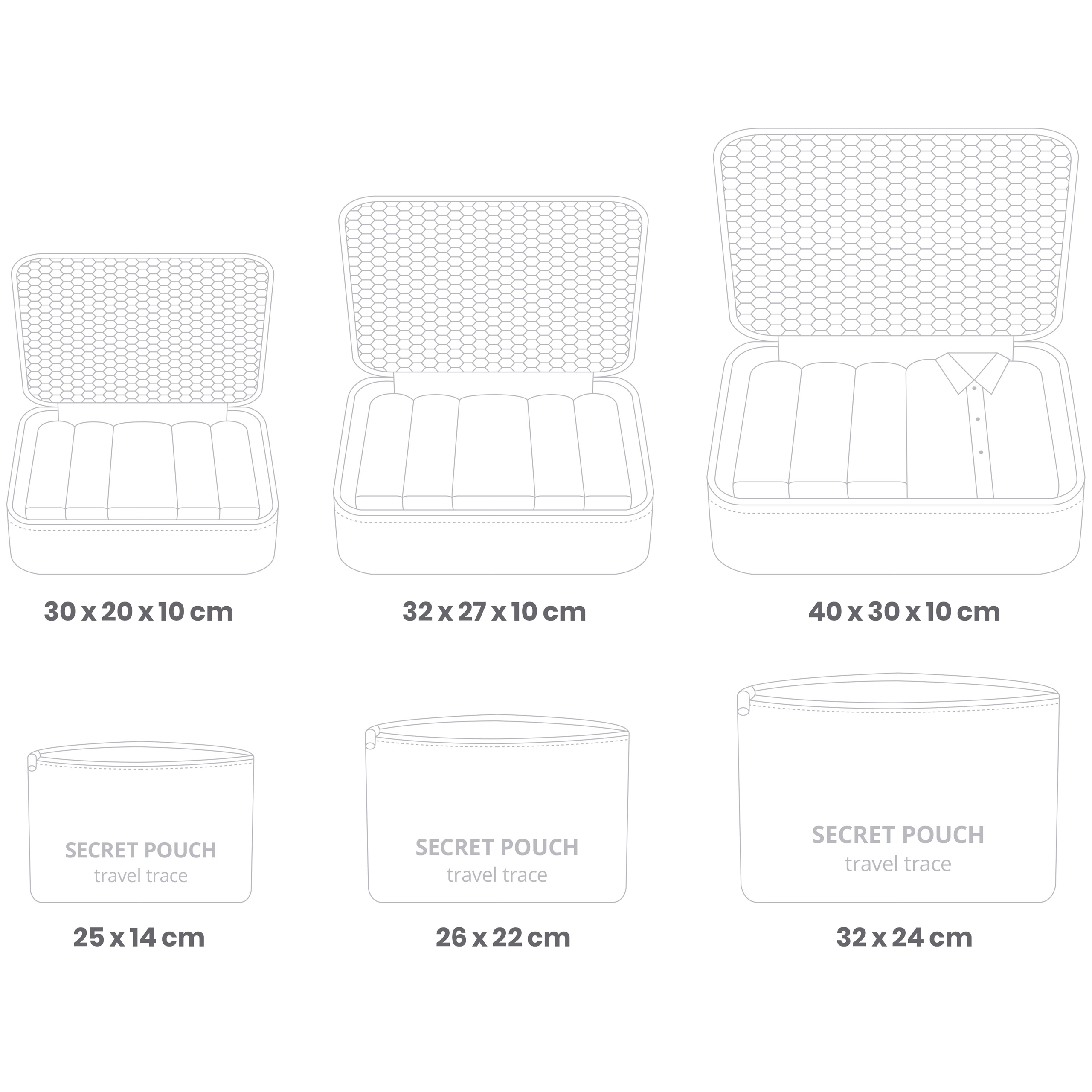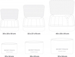 Organisatorerne hjælper med at sortere bukser, T-shirts, undertøj og tilbehør, adskille sko fra tøj og gør sikkerhedskontrollen i lufthavnen lettere. Takket være de forskellige størrelser kan du nemt tilpasse indholdet til enhver rejse – fra weekendture til lange ferier.