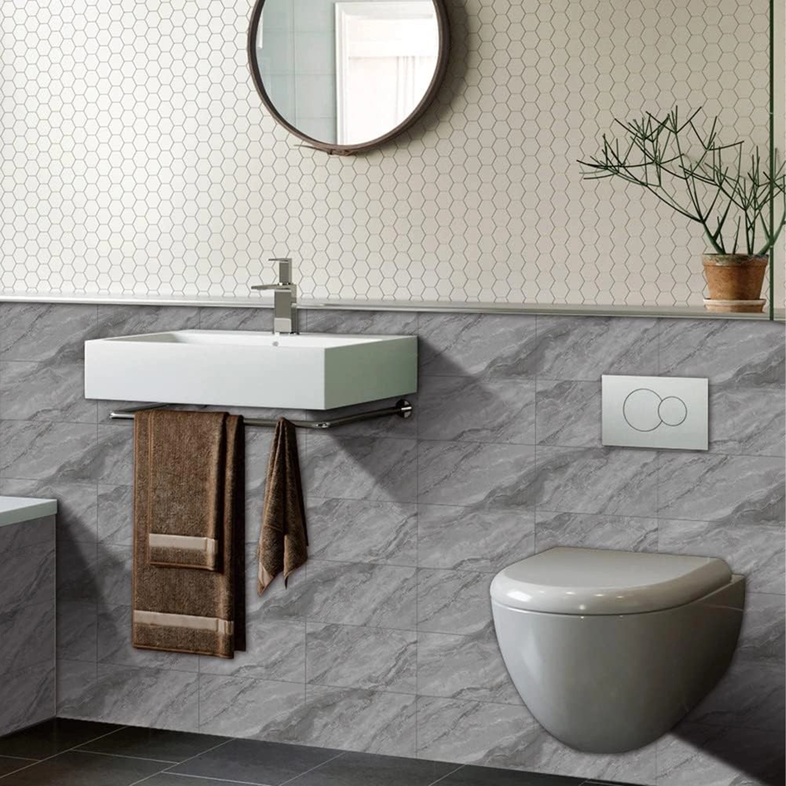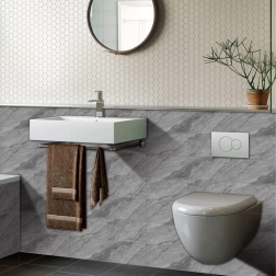 Grå marmorårer giver væggene et elegant og tidløst præg uden dyrt flisearbejde.