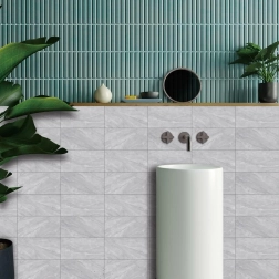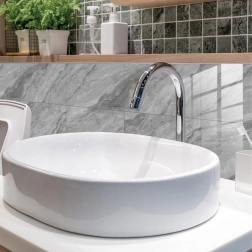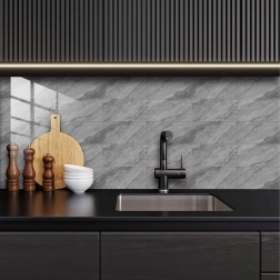 Den blanke overflade med marmorlook modstår fugt i badeværelset og stænk i køkkenet. Vedligeholdelsen klares med én aftørring.
