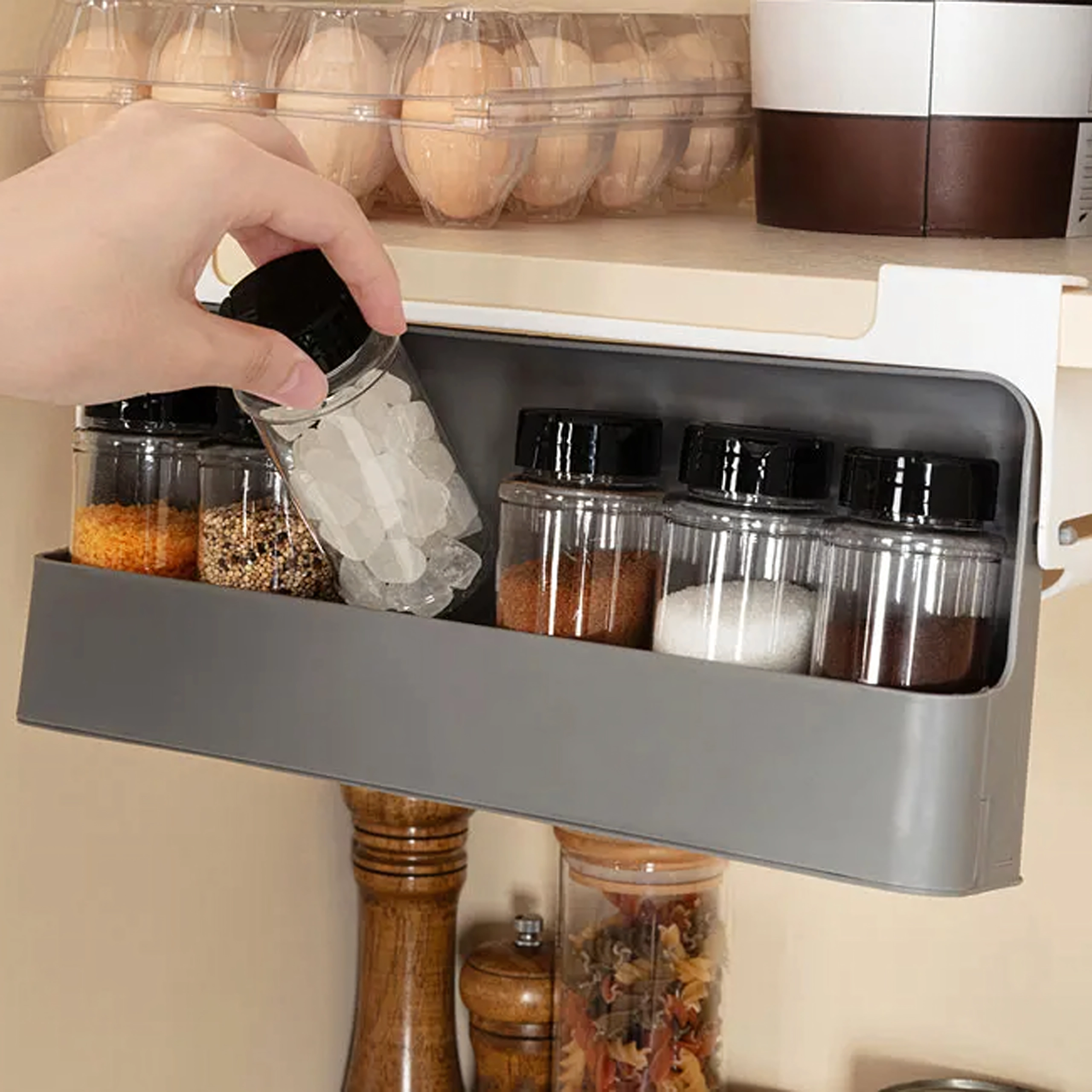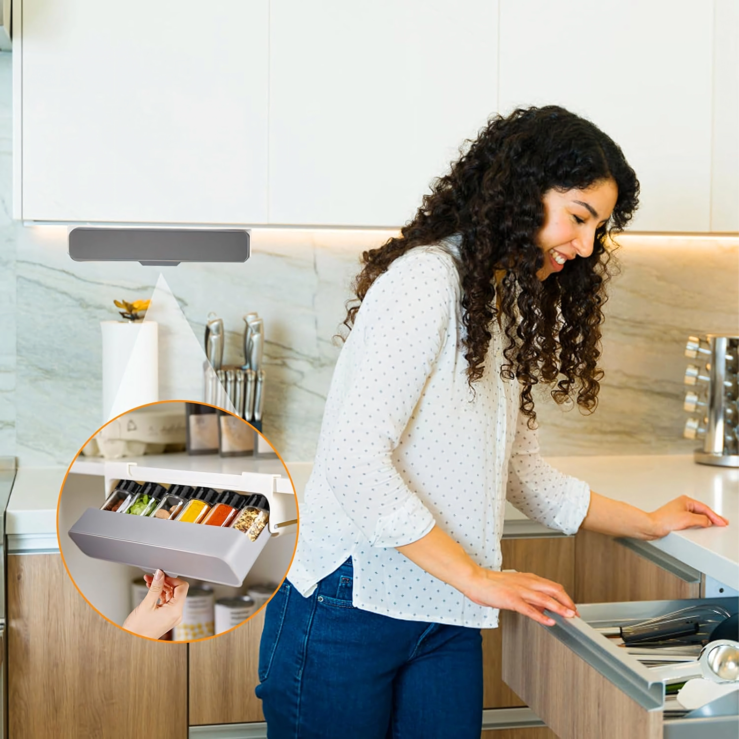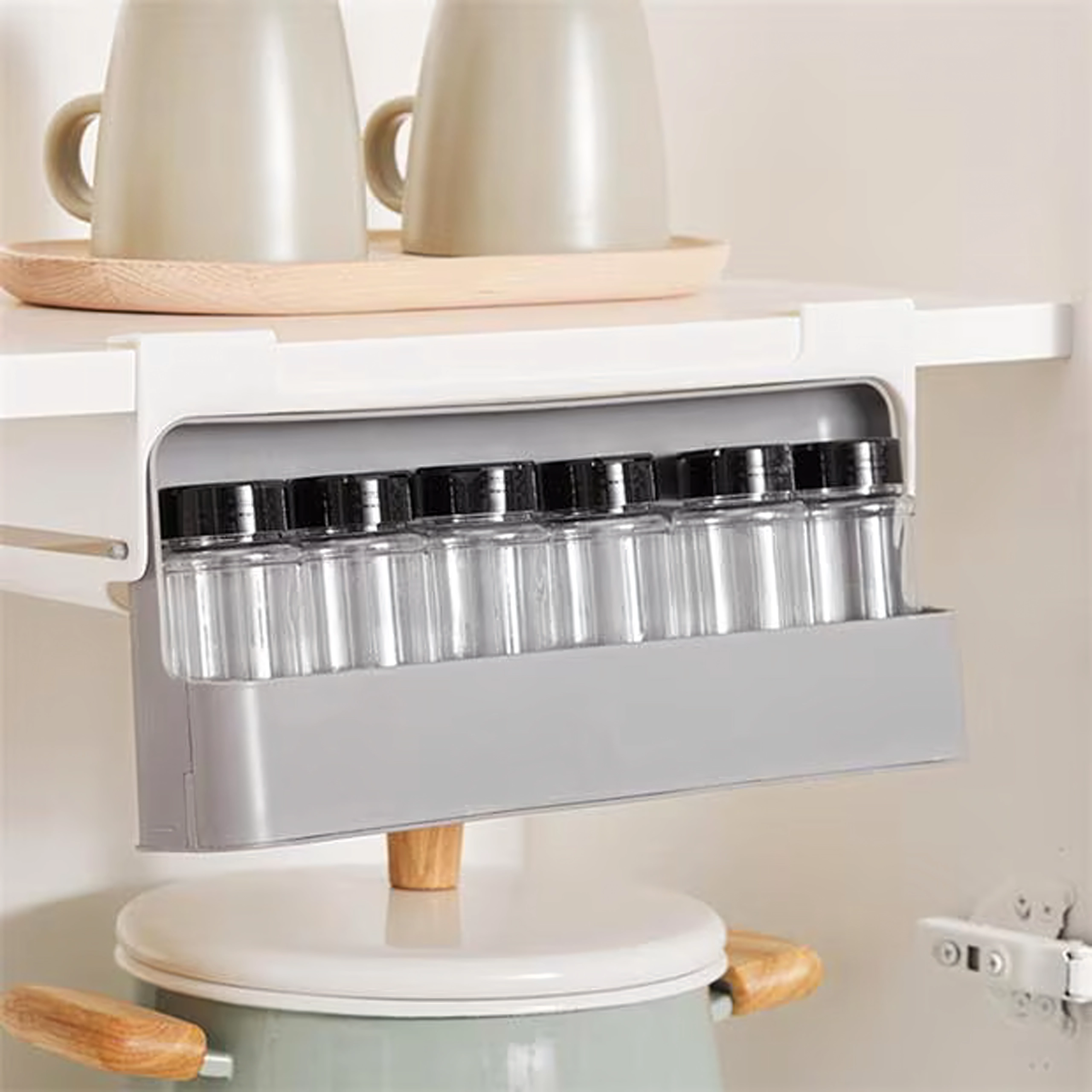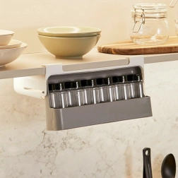 Den praktiske underhængte krydderi-organisator lader dig have dine yndlingskrydderier lige ved hånden og frigør samtidig bordplads. Takket være den overskuelige udtrækskonstruktion kan du nemt trække skinnen med glassene ud og straks se, hvad du skal bruge. Den selvklæbende montering med 3M-tape sikrer en stærk fastgørelse uden boring og uden at beskadige møbler.