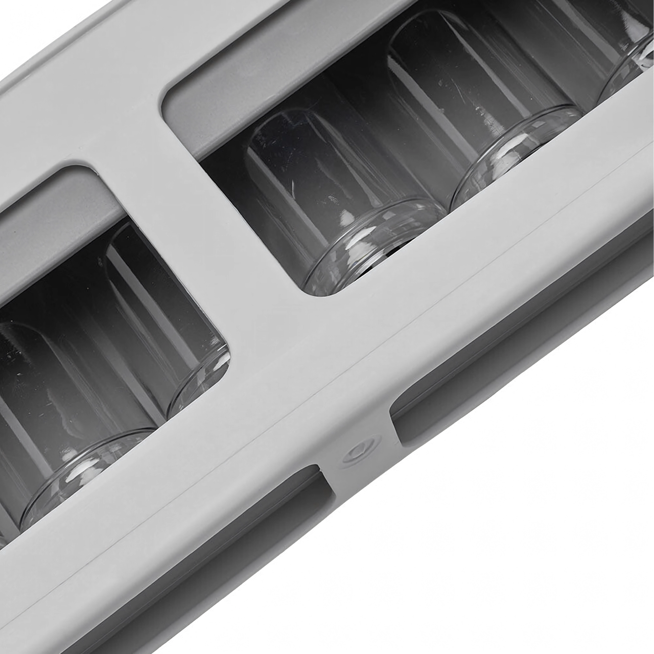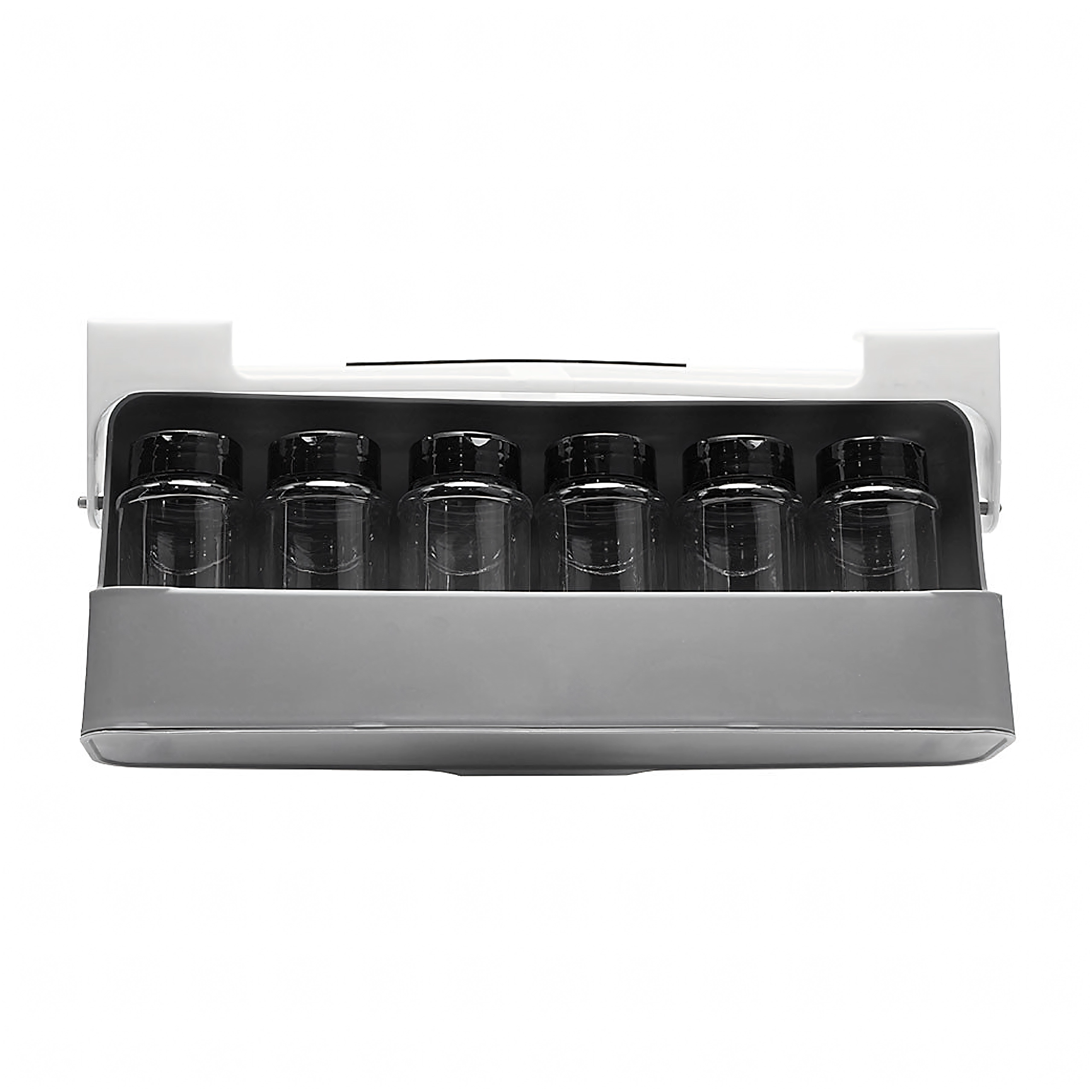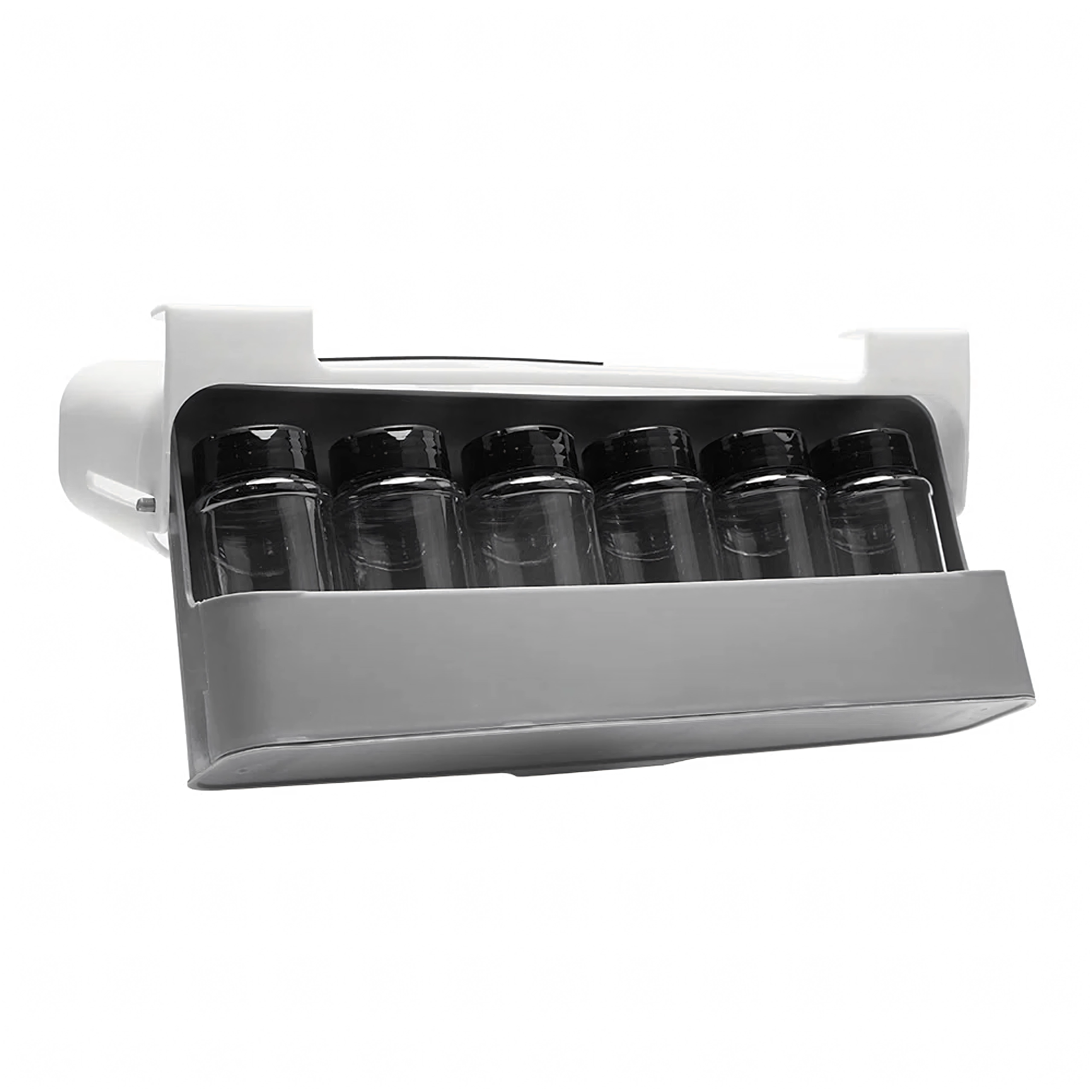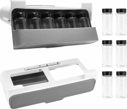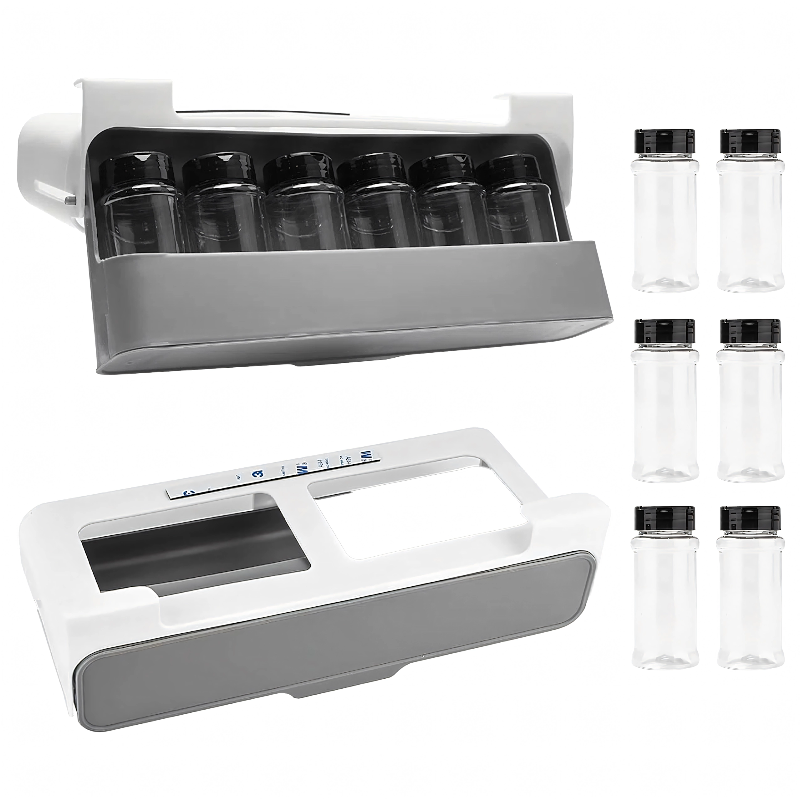 Seks gennemsigtige glasbeholdere med sorte låg holder krydderierne friske og rene. Det minimalistiske design i hvid-grå passer både i moderne og klassiske køkkener og udnytter effektivt pladsen under en hylde eller i et skab.