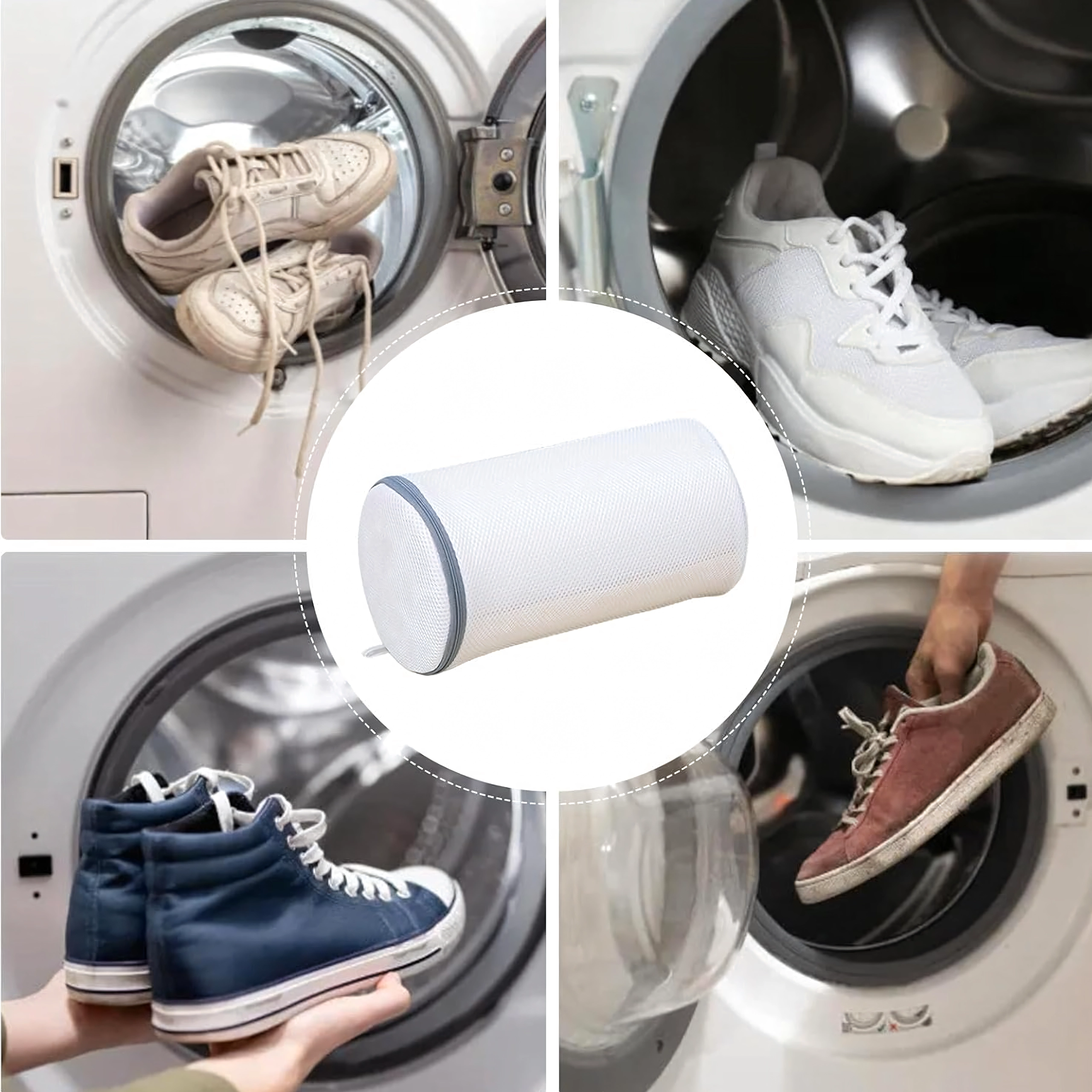 Denne cylindriske pose af luftigt net muliggør effektiv cirkulation af vand og vaskemiddel og beskytter samtidig skoene mod slid og vaskemaskinen mod stød fra sålerne. Lynlåslukningen holder skoene sikkert inde og mindsker risikoen for sammenfiltrede snørebånd.