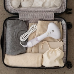 Let, pladsbesparende og nem at transportere. Passer i kufferten og er klar til hurtige tøjrettelser hvor som helst på rejsen.