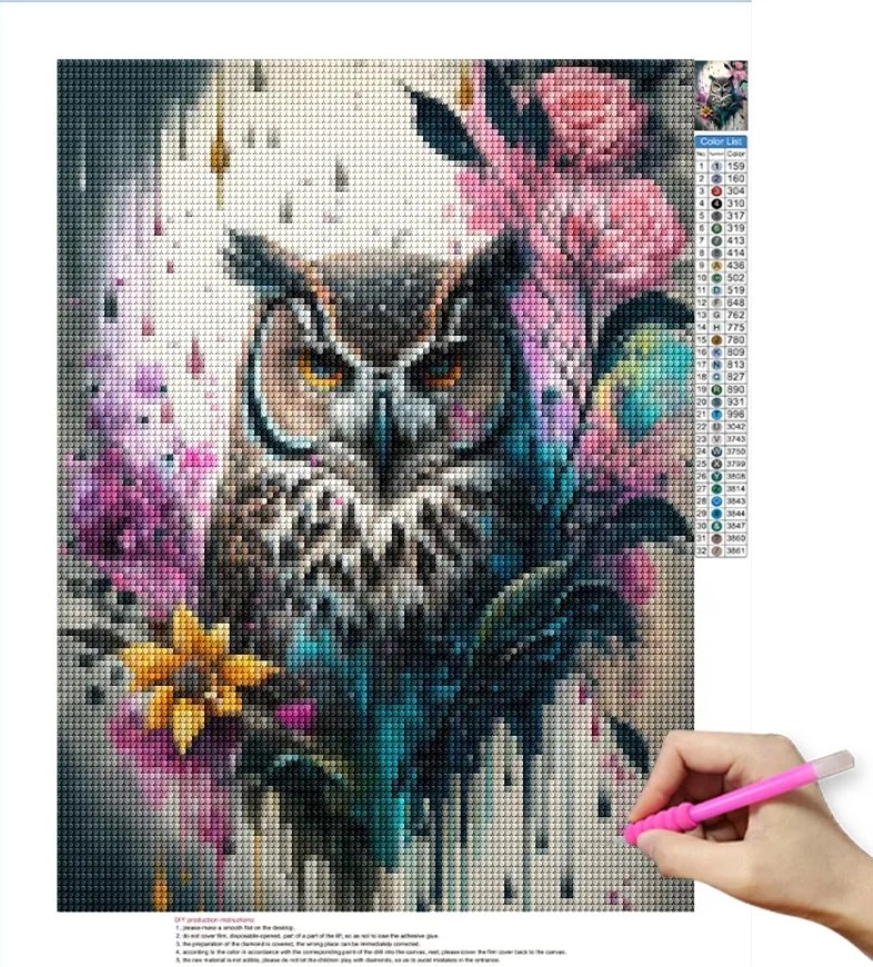 I sættet finder du alt, hvad du behøver for komfortabelt arbejde. Den riflede bakke retter stenene ind, voksen i applikatoren sikrer nem optagning, og farvelegenden på lærredet guider hvert skridt. Det færdige værk er perfekt som en original dekoration til stue, soveværelse eller børneværelse – og også som en unik gave.