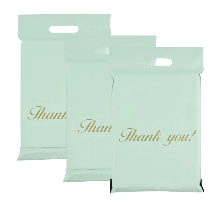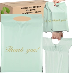 Robuste kurerposer med udstanset hank i elegant mintfarve, fremstillet af stærk LDPE‑folie. Sikker lukning med selvklæbende strimmel, nem transport takket være hanken og pålidelig beskyttelse af forsendelser mod fugt, støv og snavs. Pakken indeholder 50 stk. i størrelsen 500 × 600 mm + 70 mm hank med dekorativ teksten “Thank you!”.