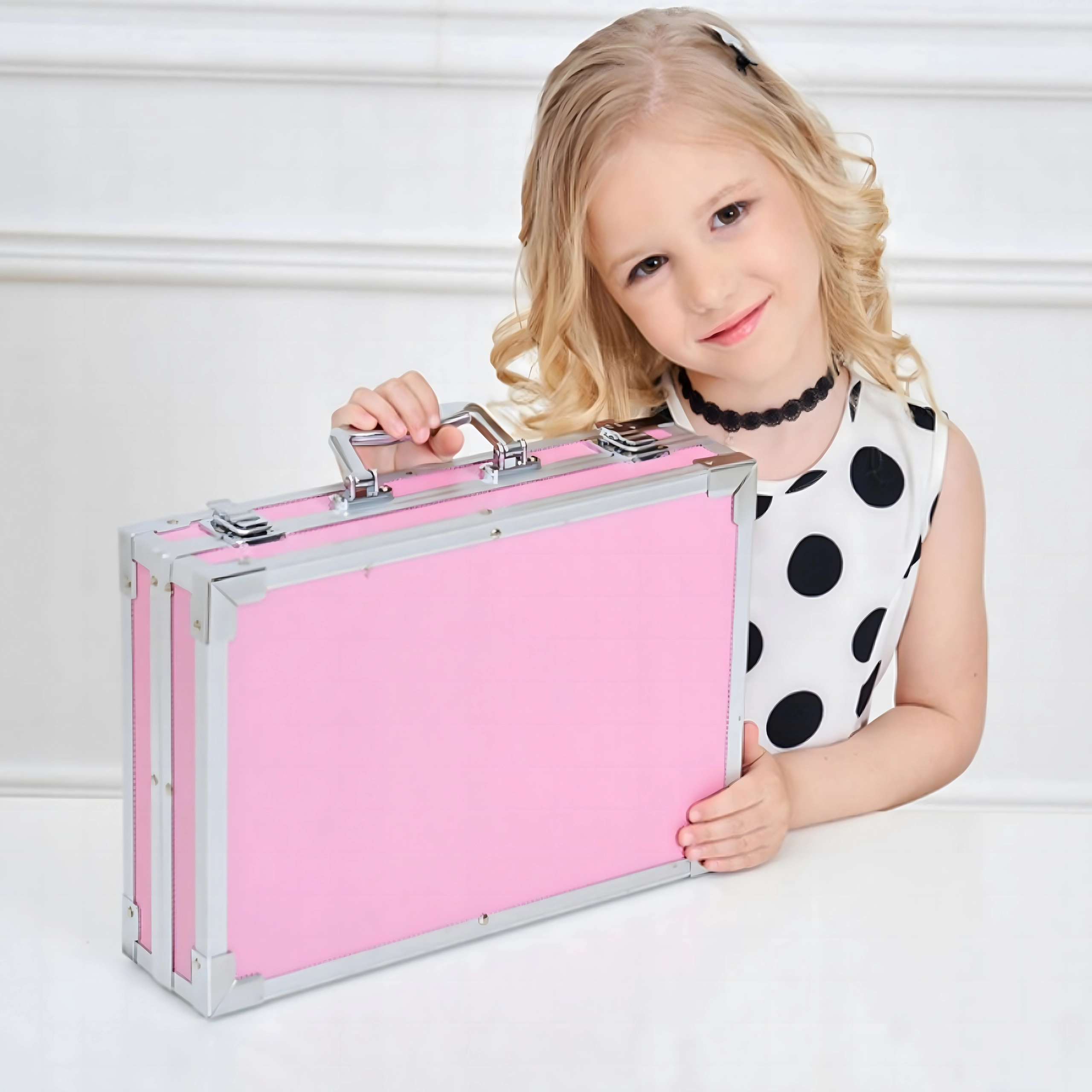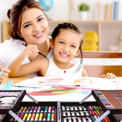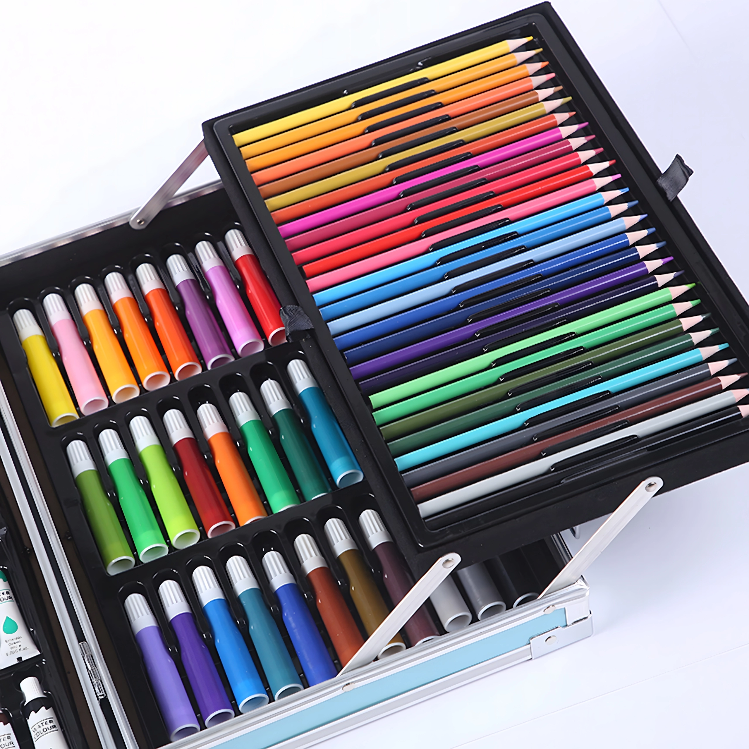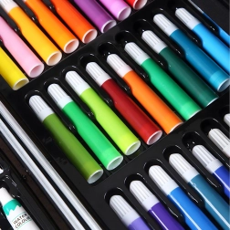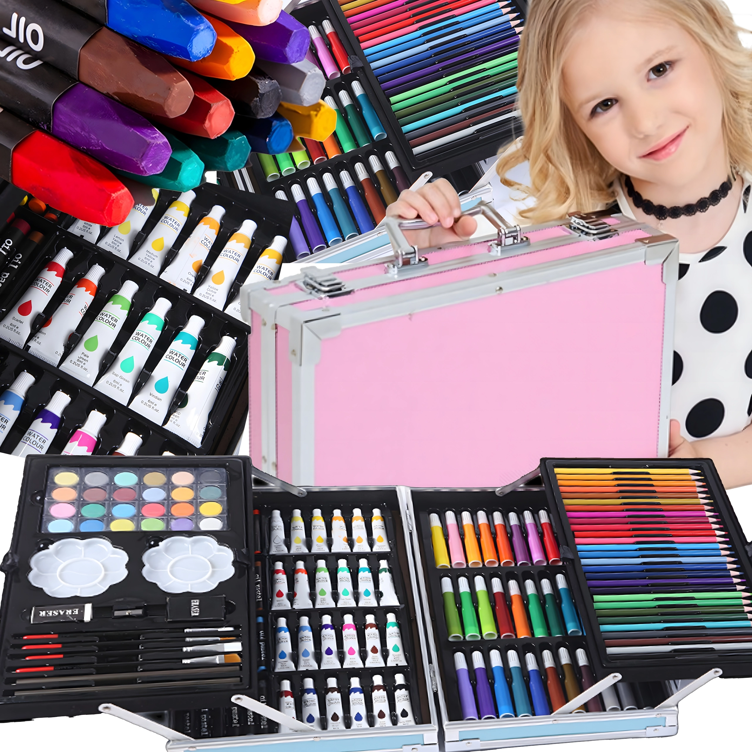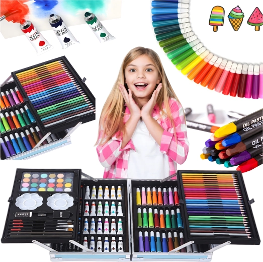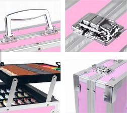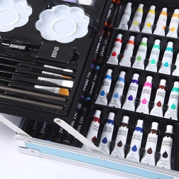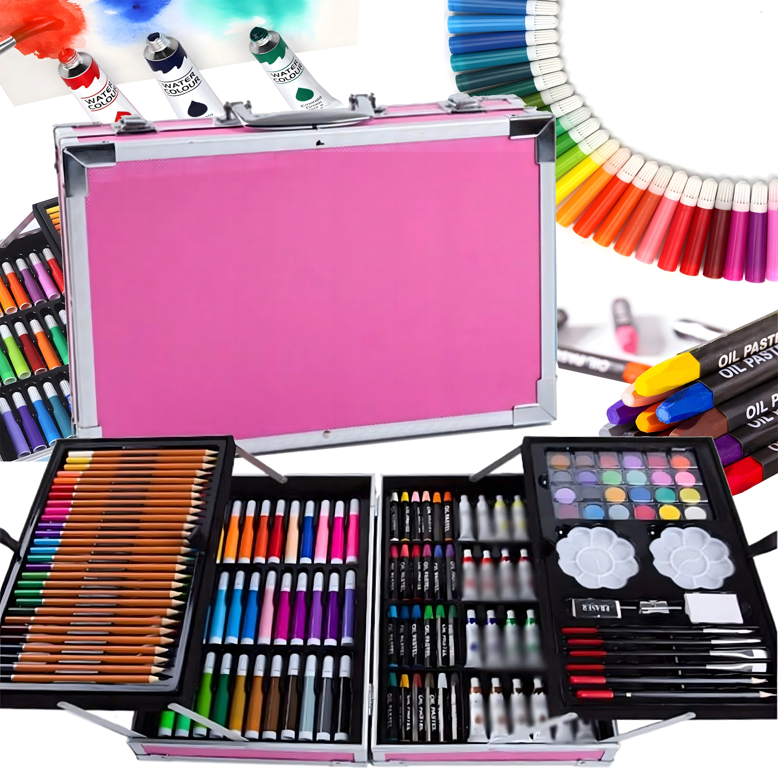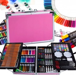 Komplet kunstsæt med 145 dele i en robust aluminiums kuffert til tegning, maling og farvelægning. Indeholder tuscher, farveblyanter, voksfarver, oliepasteller, akvareller, pensler og paletter overskueligt organiseret i lagdelte rum. Ideel til børn og begyndere, både hjemme og på farten – alt, hvad der behøves til kreativ skaben samlet ét sted.