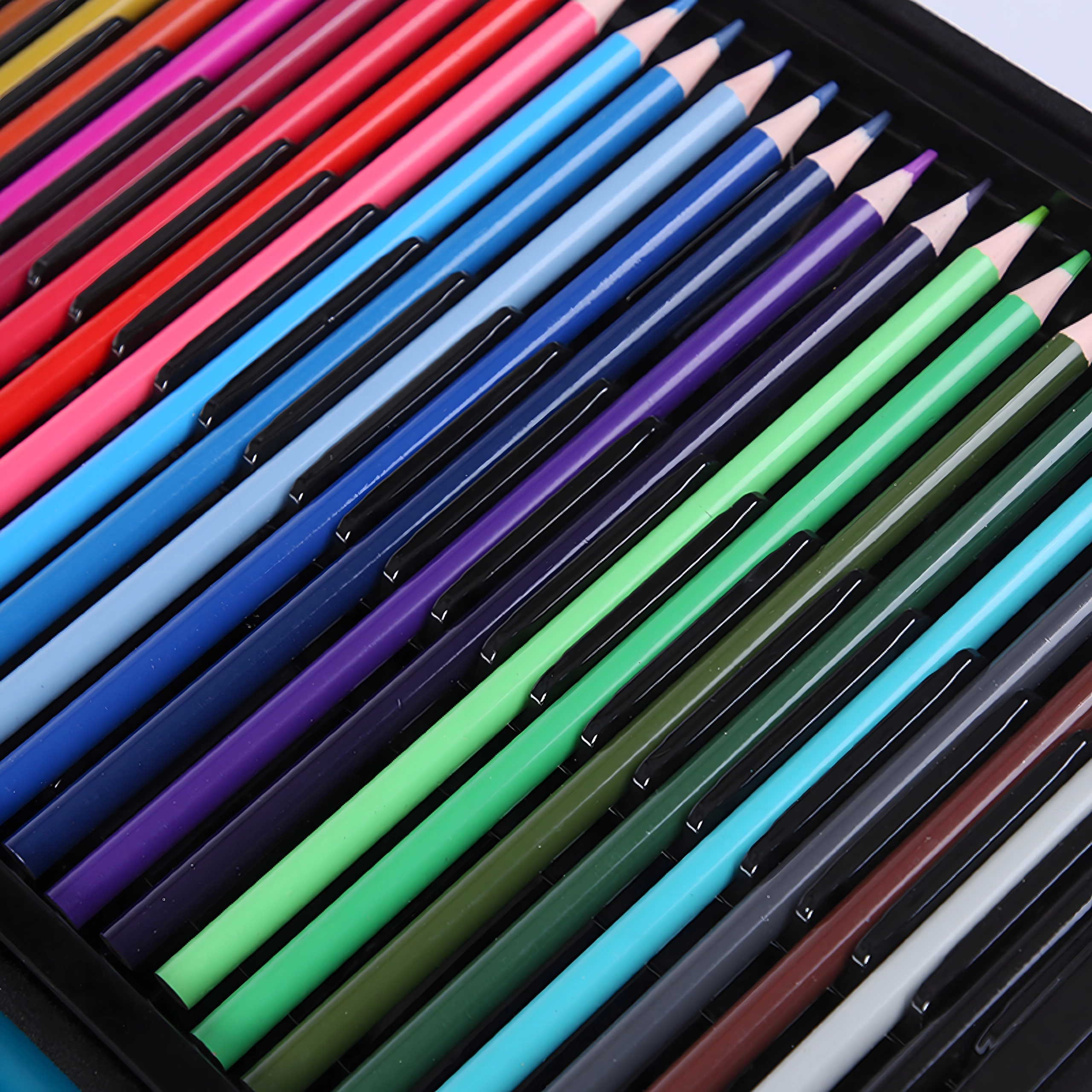 Lagdelte, udtrækkelige bakker holder alle materialer lige ved hånden. Børn og voksne finder let den rette nuance og det passende værktøj.