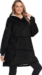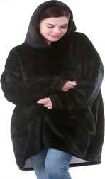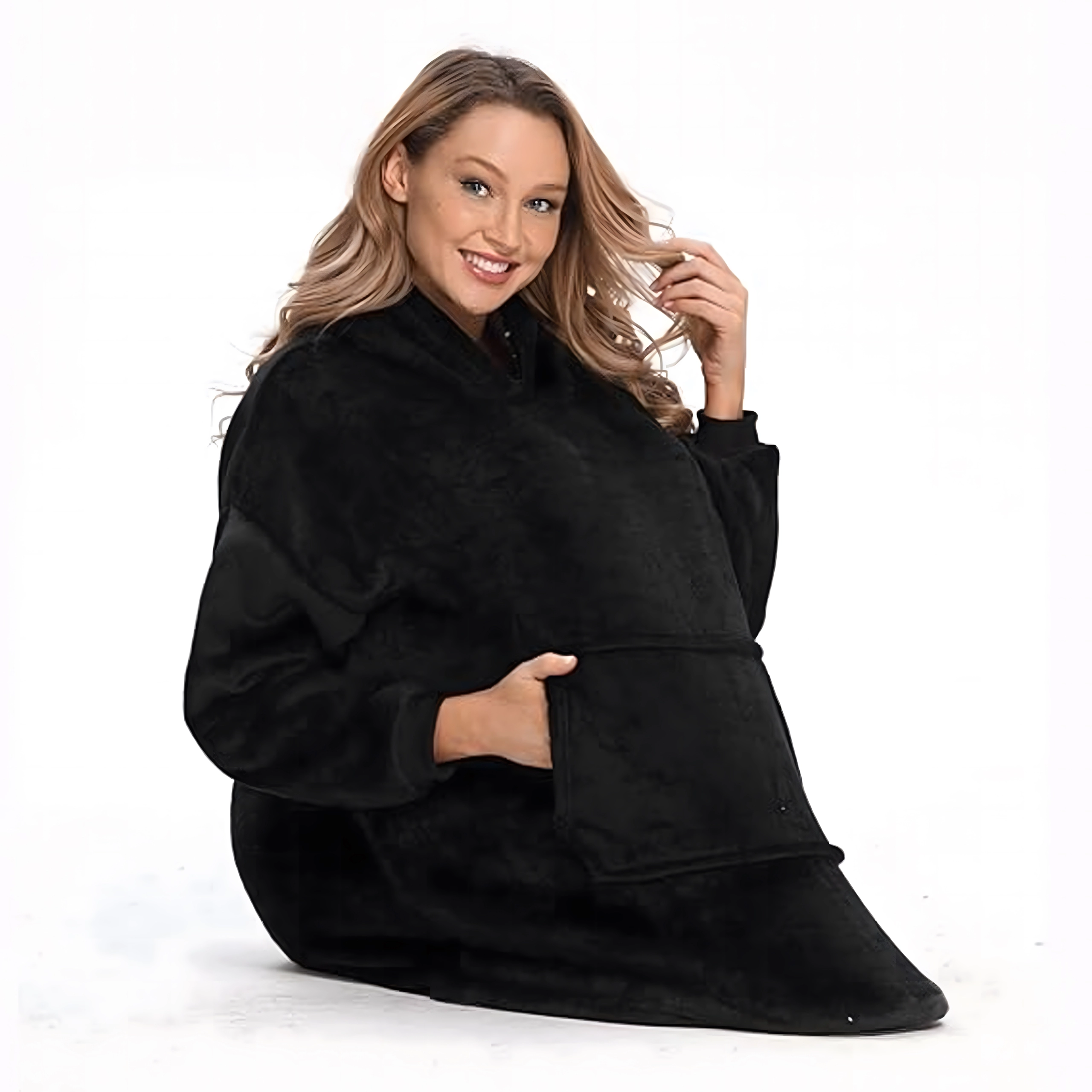 Dette bærbare tæppe kombinerer komforten ved en morgenkåbe med en hættetrøjes praktikalitet. Den generøse oversize-pasform tilpasser sig enhver figur og giver behagelig varme fra skuldre til knæ. Det bløde, plyssede materiale føles rart mod huden og isolerer fremragende, så du er komfortabel hele dagen.