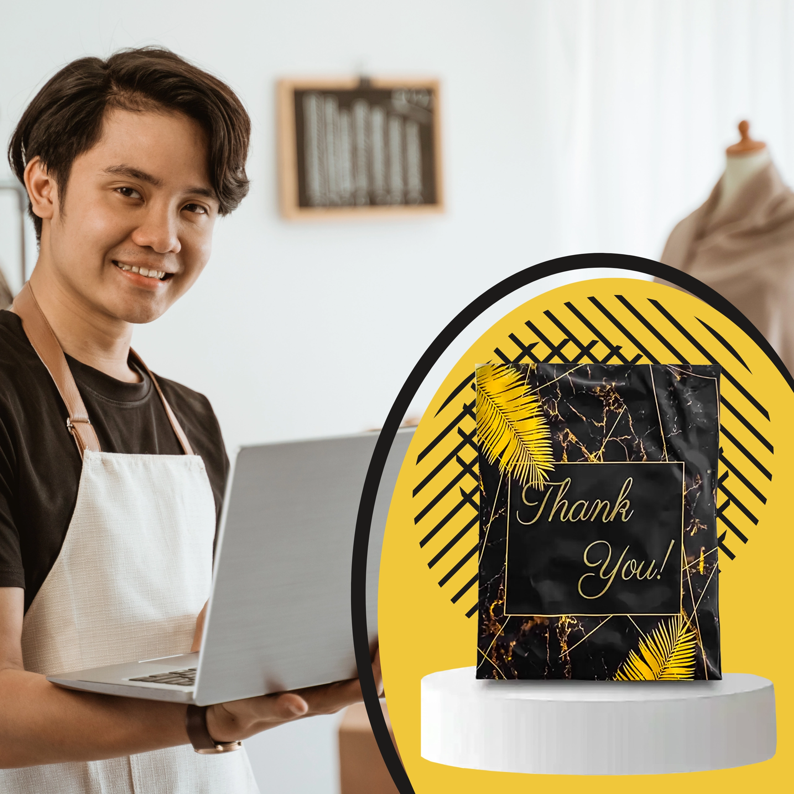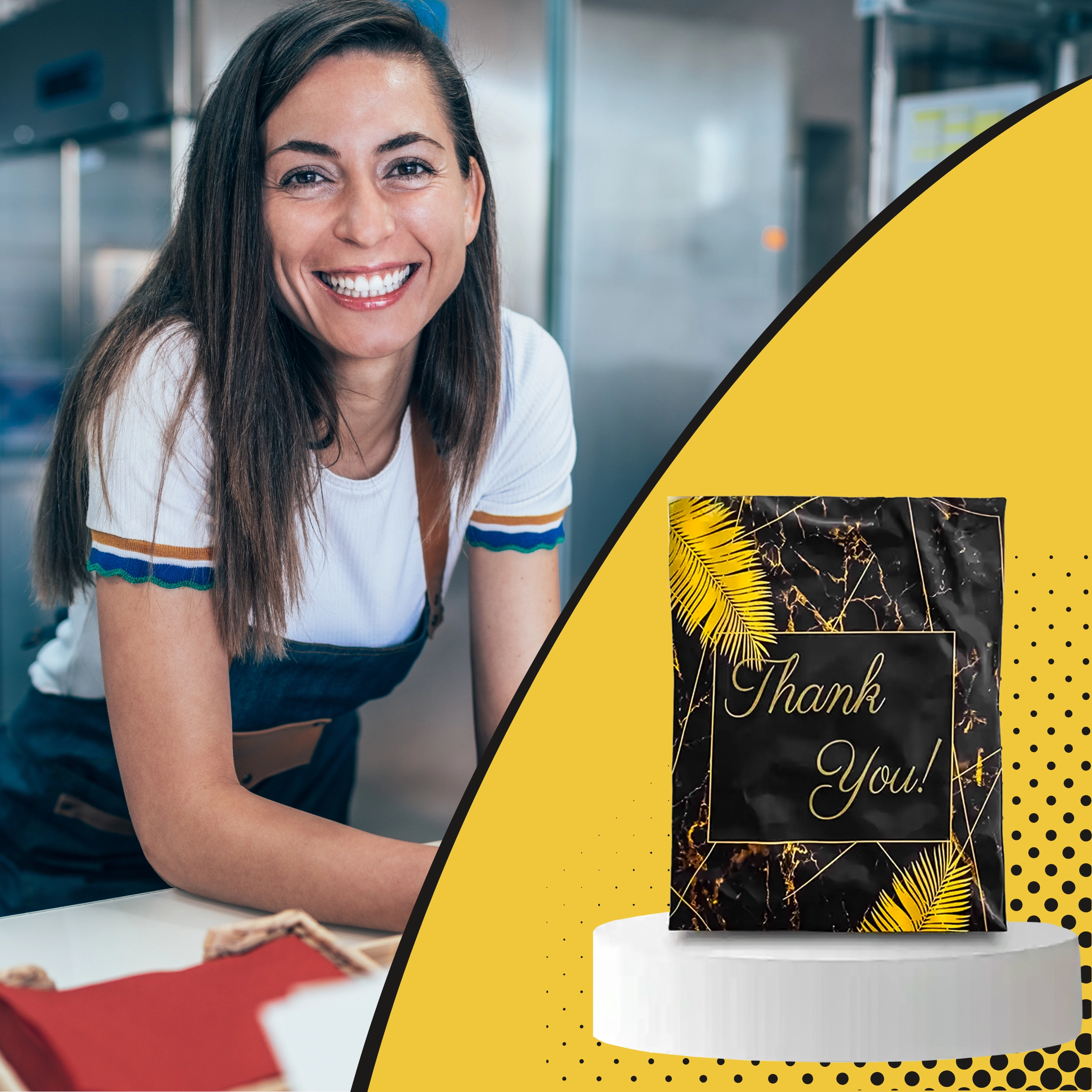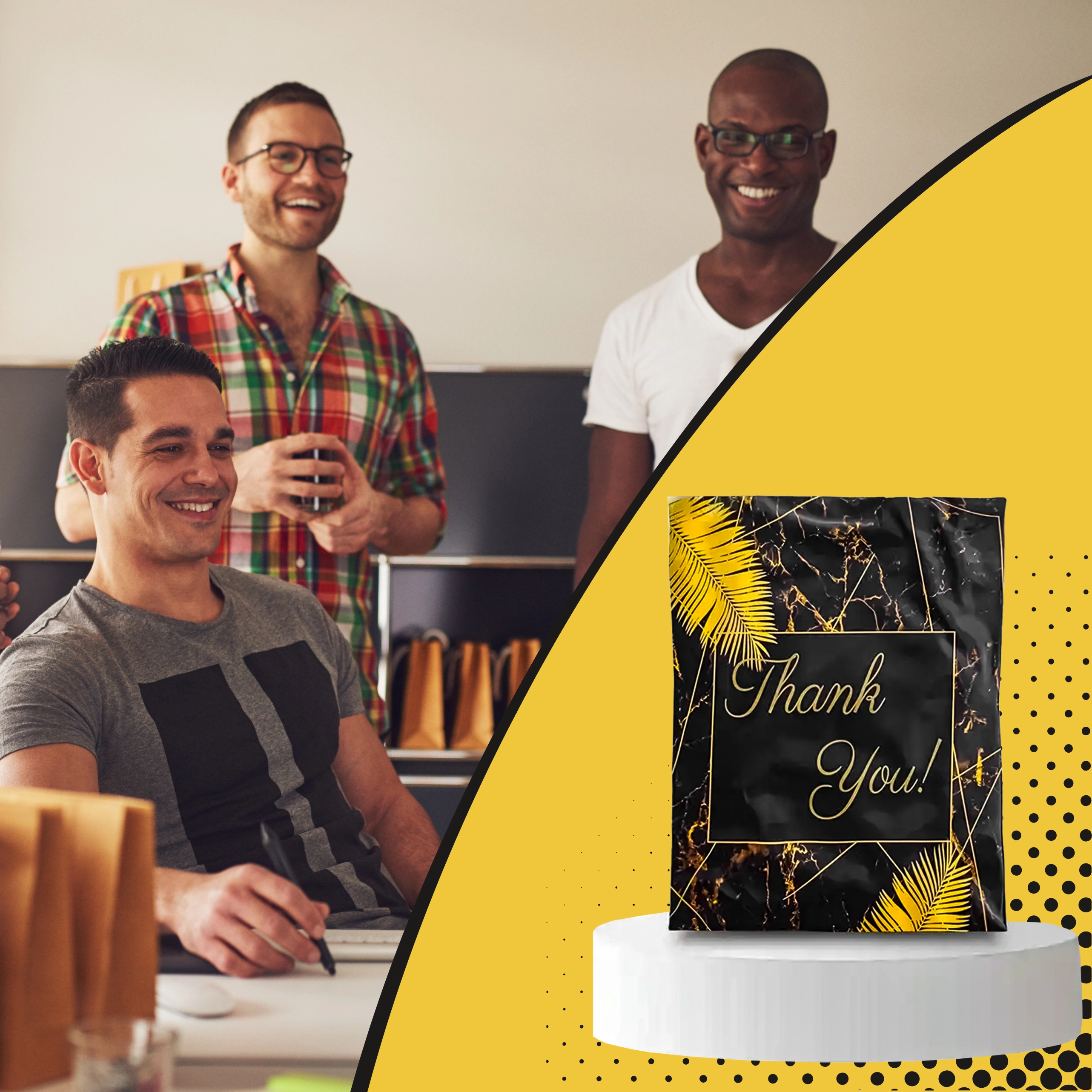 Leder du efter pålidelig emballage til webshop eller regelmæssige forsendelser? Disse robuste foliepostkuverter i størrelsen 255 × 370 mm er perfekte til små og mellemstore emner. Den sorte overflade med den diskrete tekst Thank You virker professionel og styrker det gode indtryk ved levering.