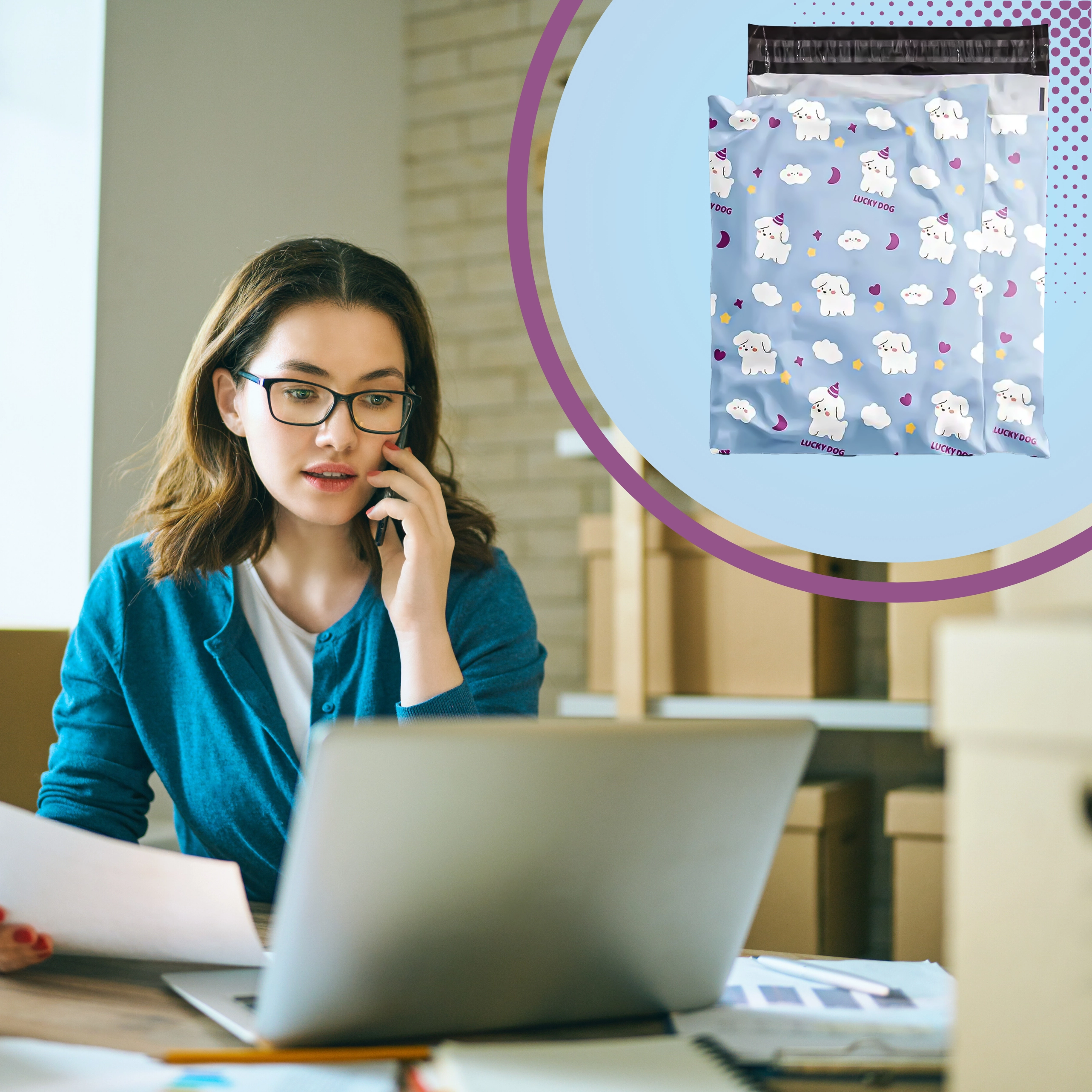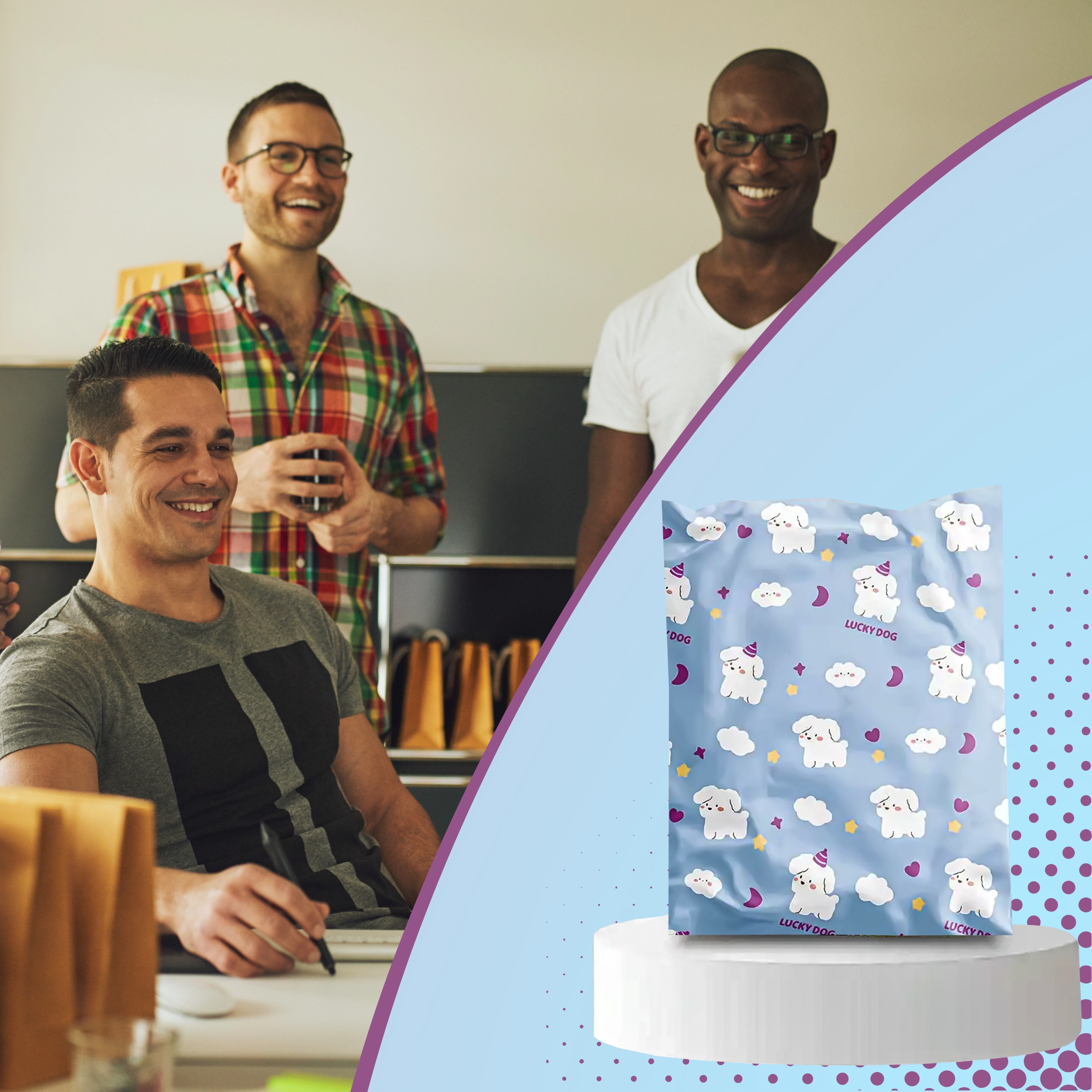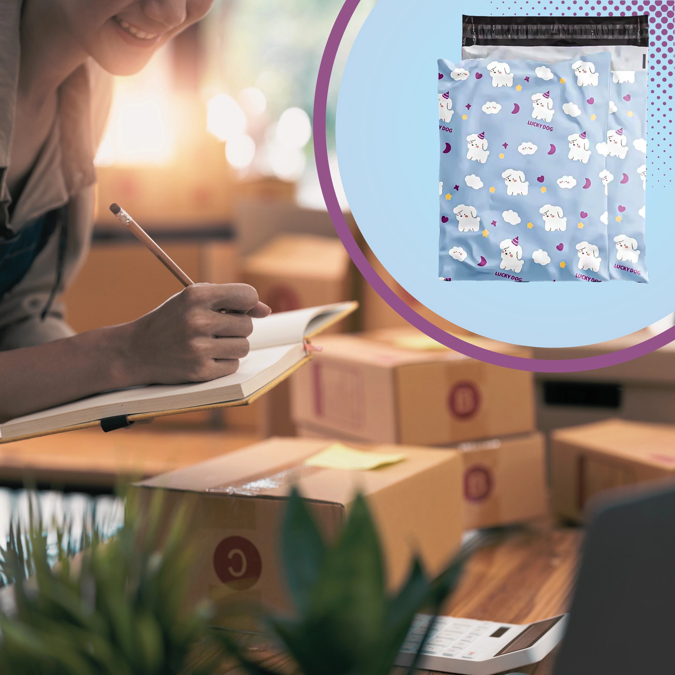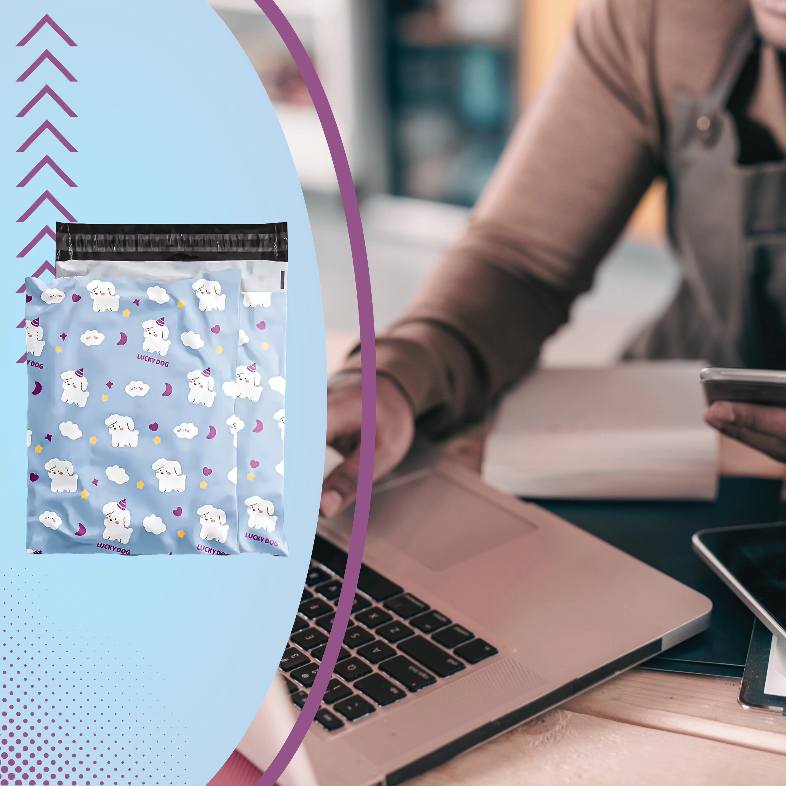 Takket være det holdbare materiale og det uigennemsigtige design forbliver indholdet beskyttet mod fugt og nysgerrige blikke. Dekoret LUCKY DOG understreger professionaliteten og gør dine forsendelser mere mindeværdige.