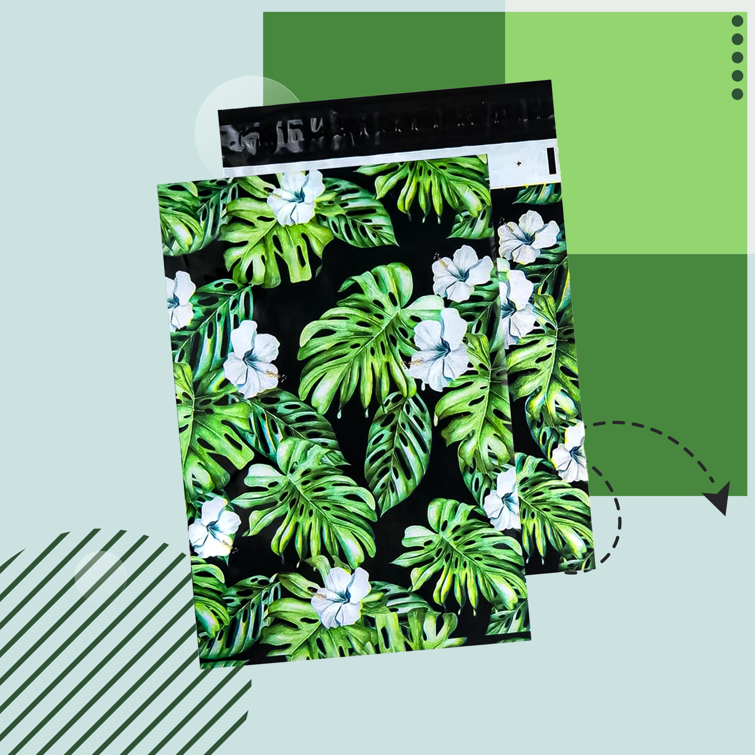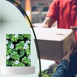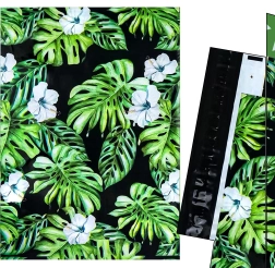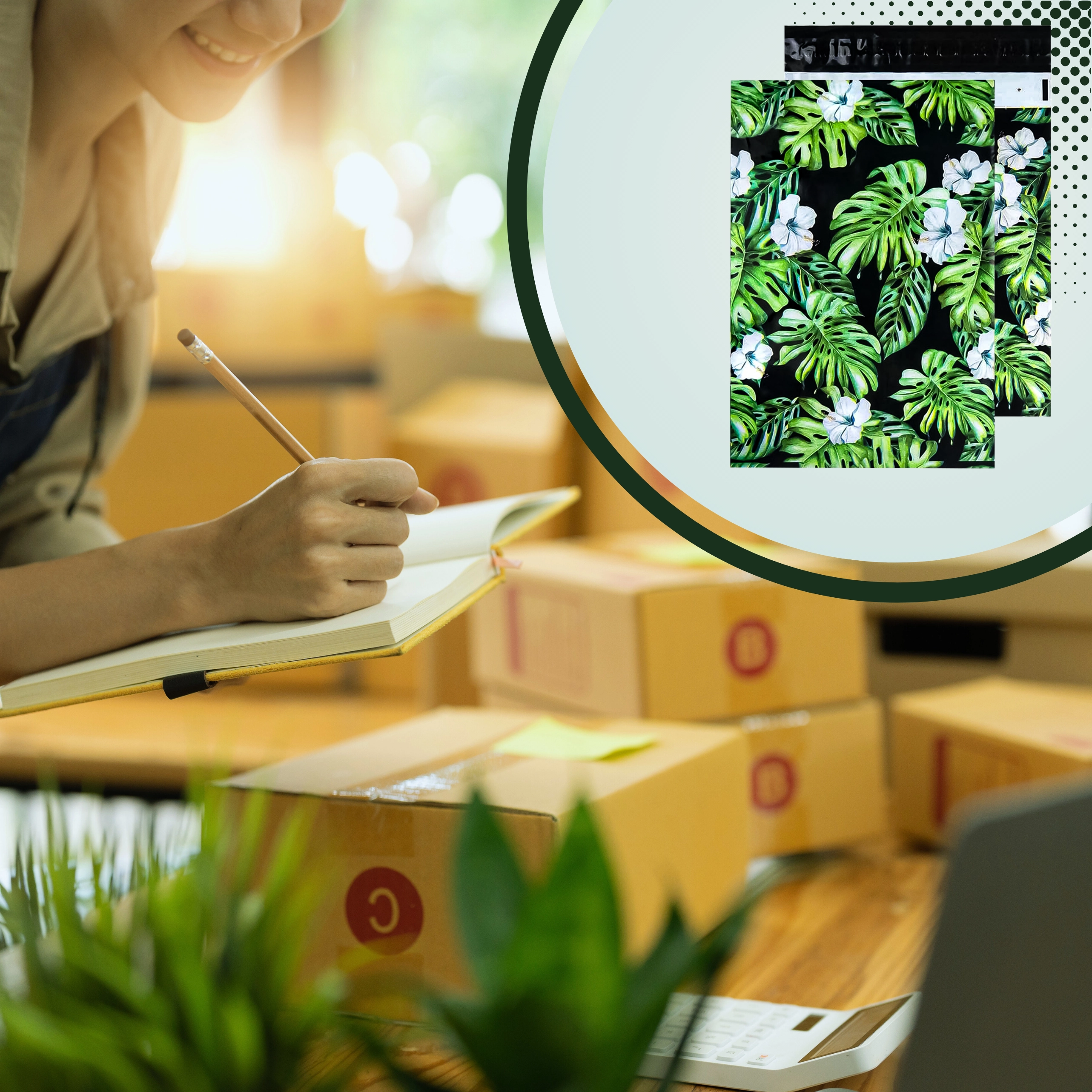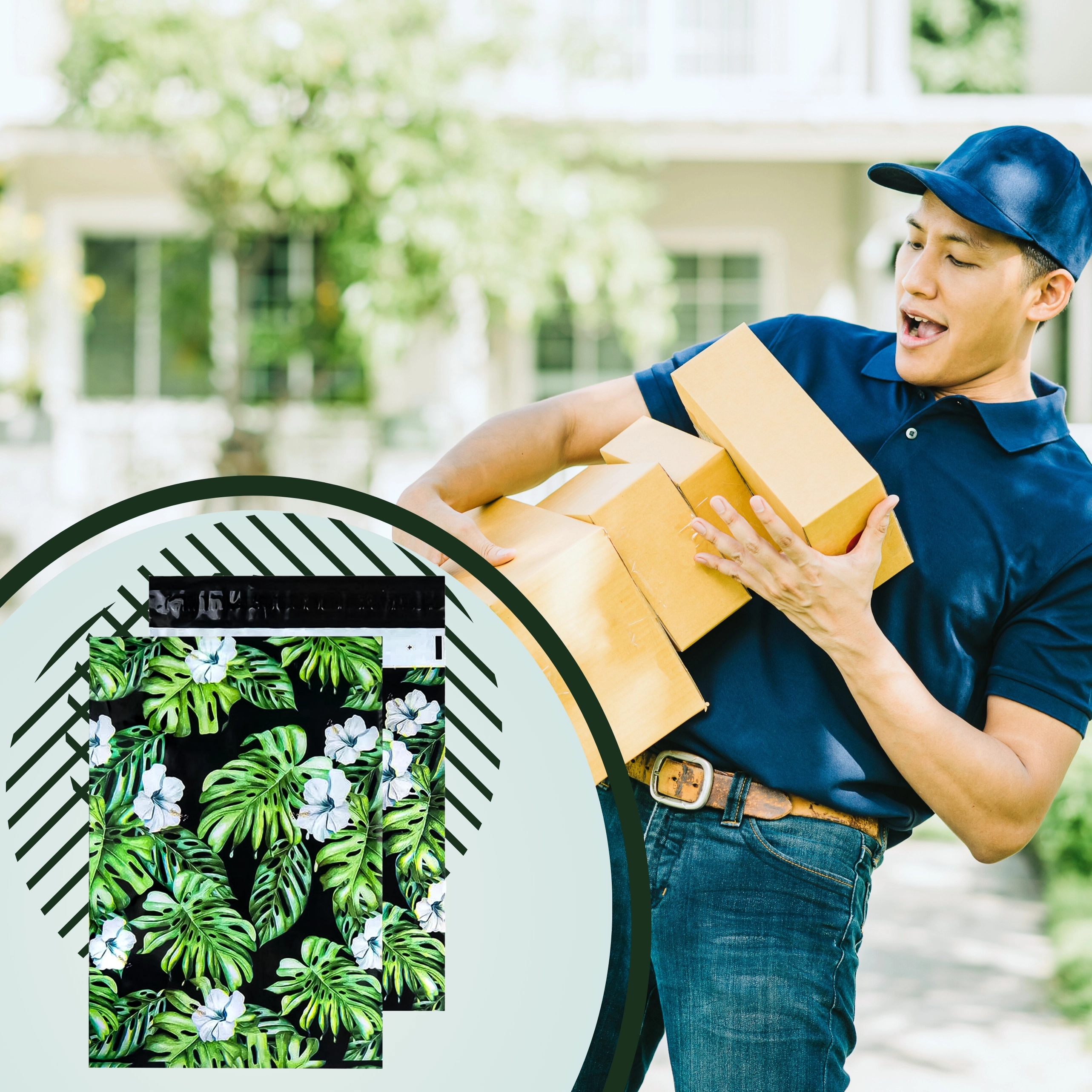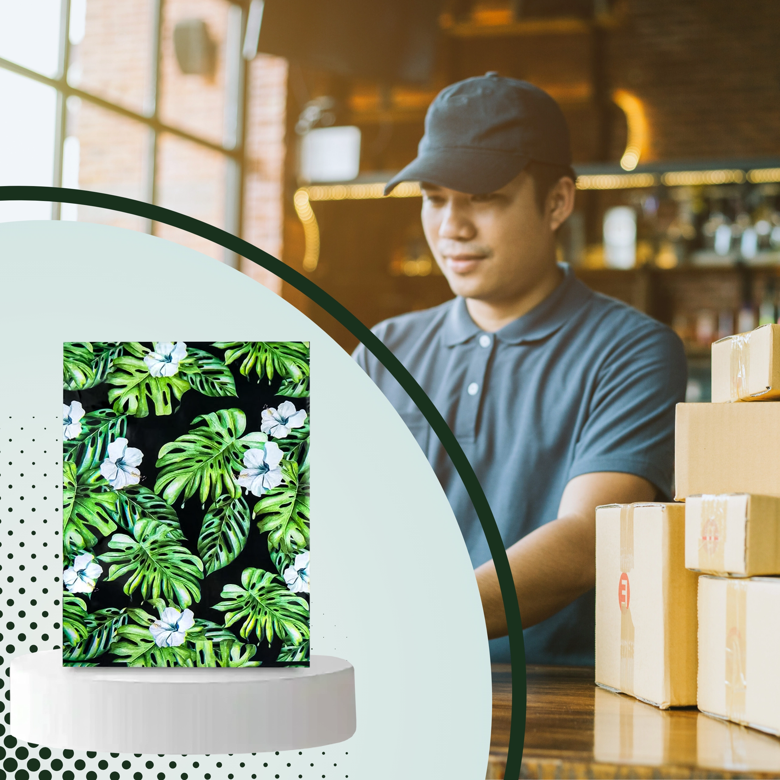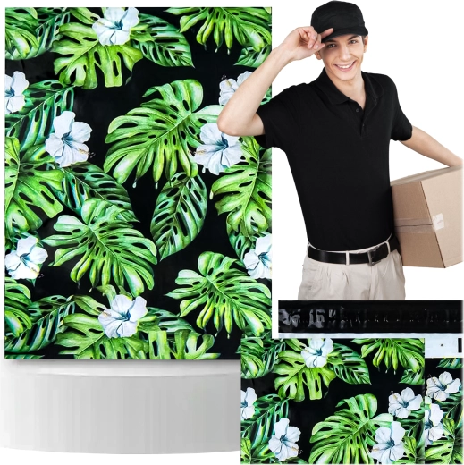 Print med blade og blomster på mørk baggrund giver dine forsendelser et markant look og styrker brandet ved levering.