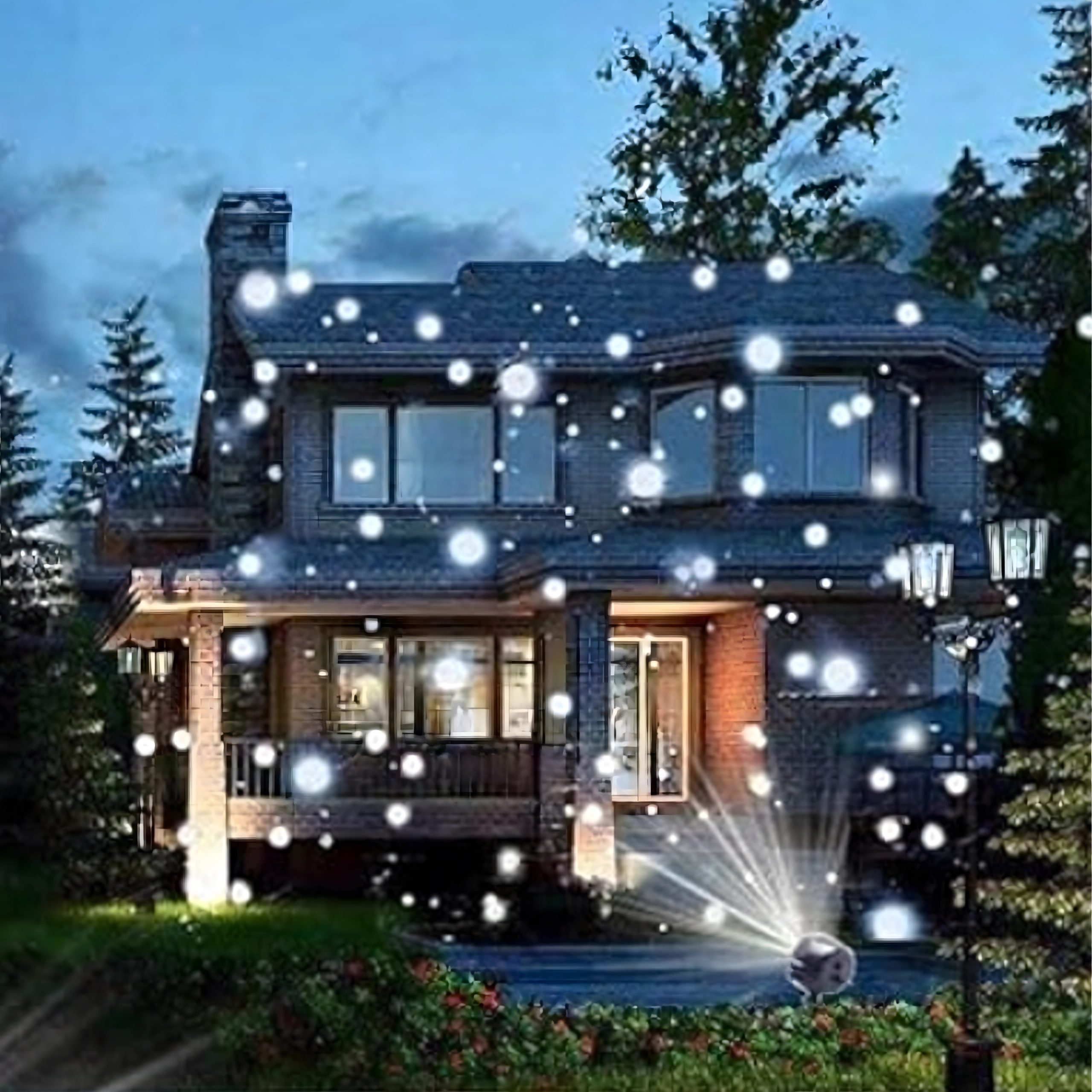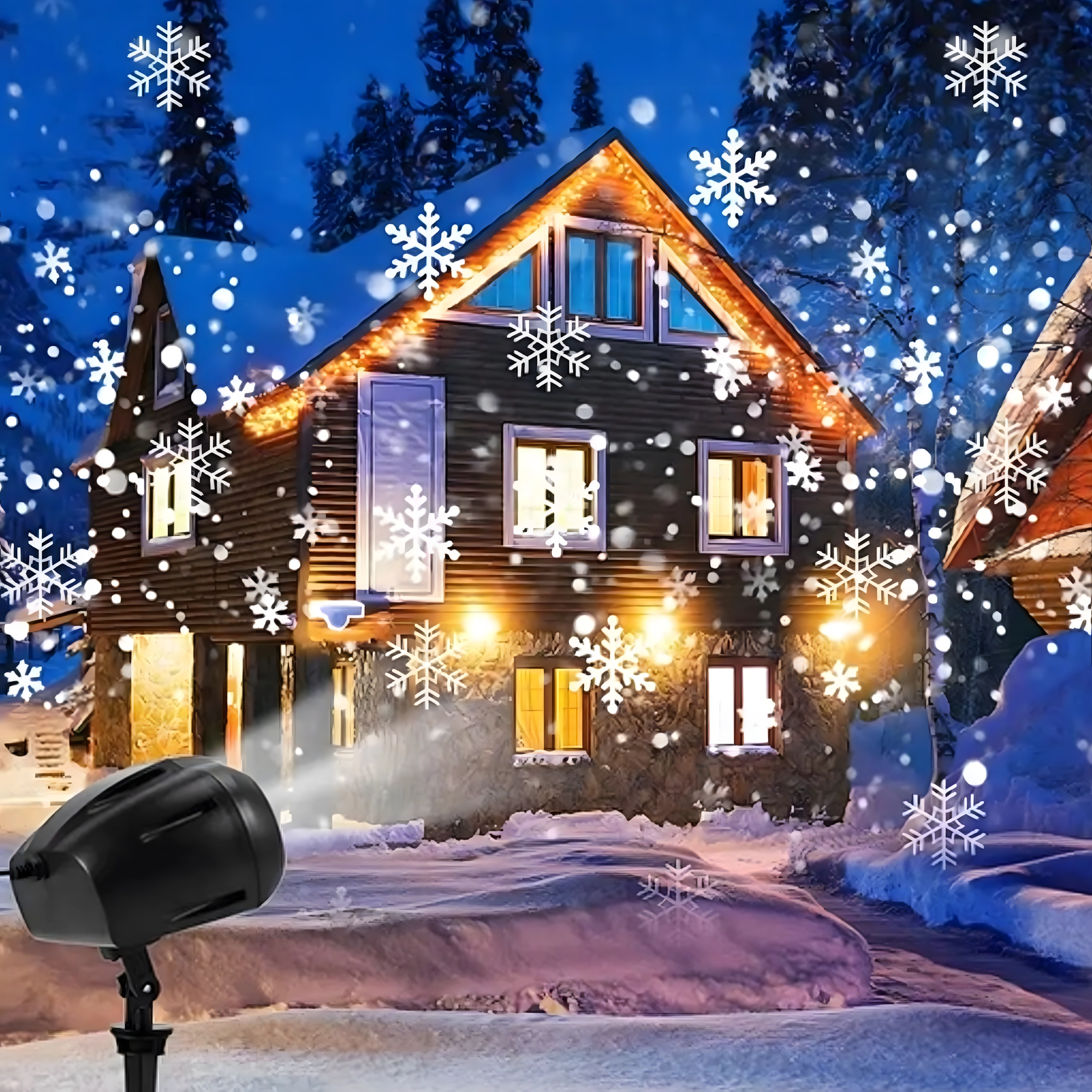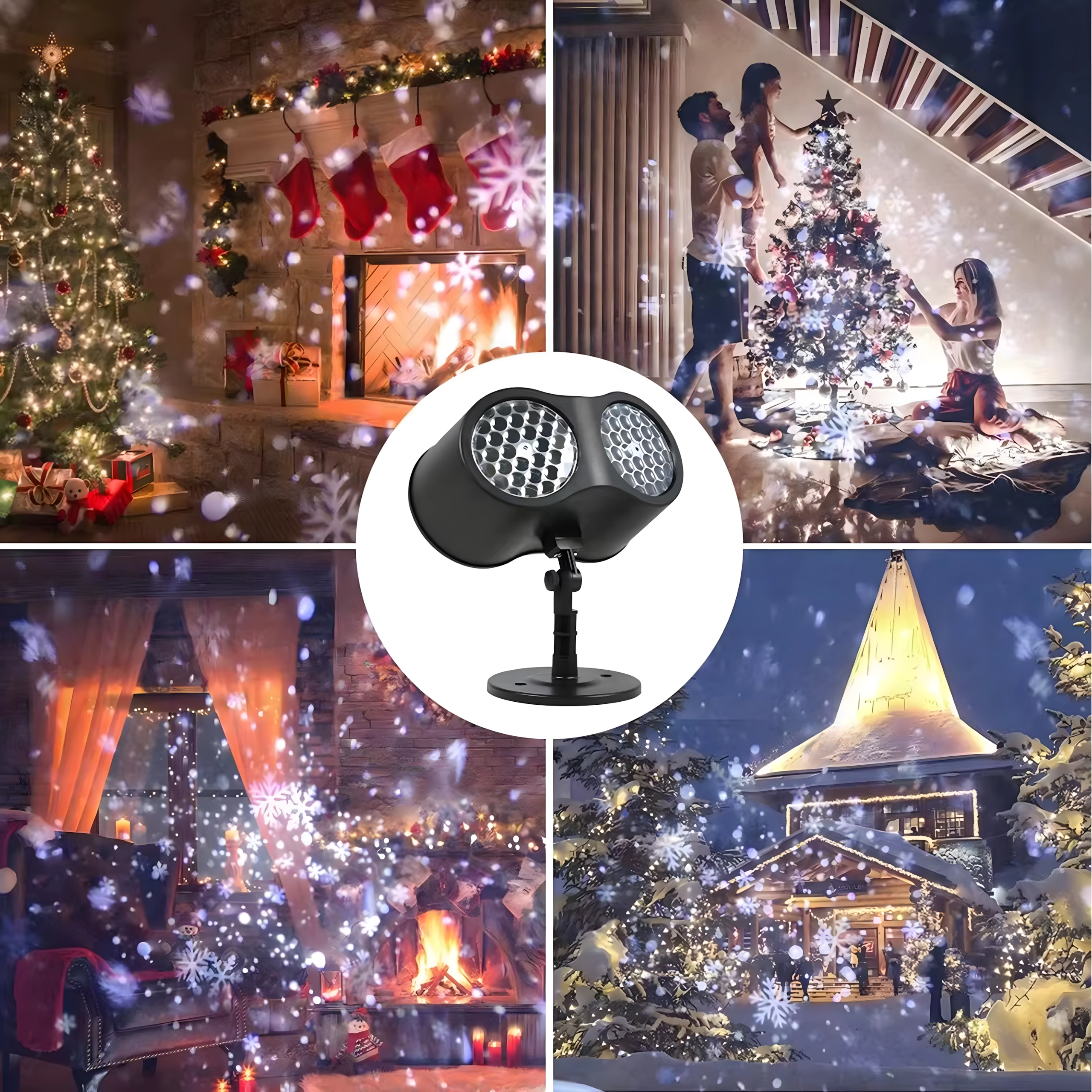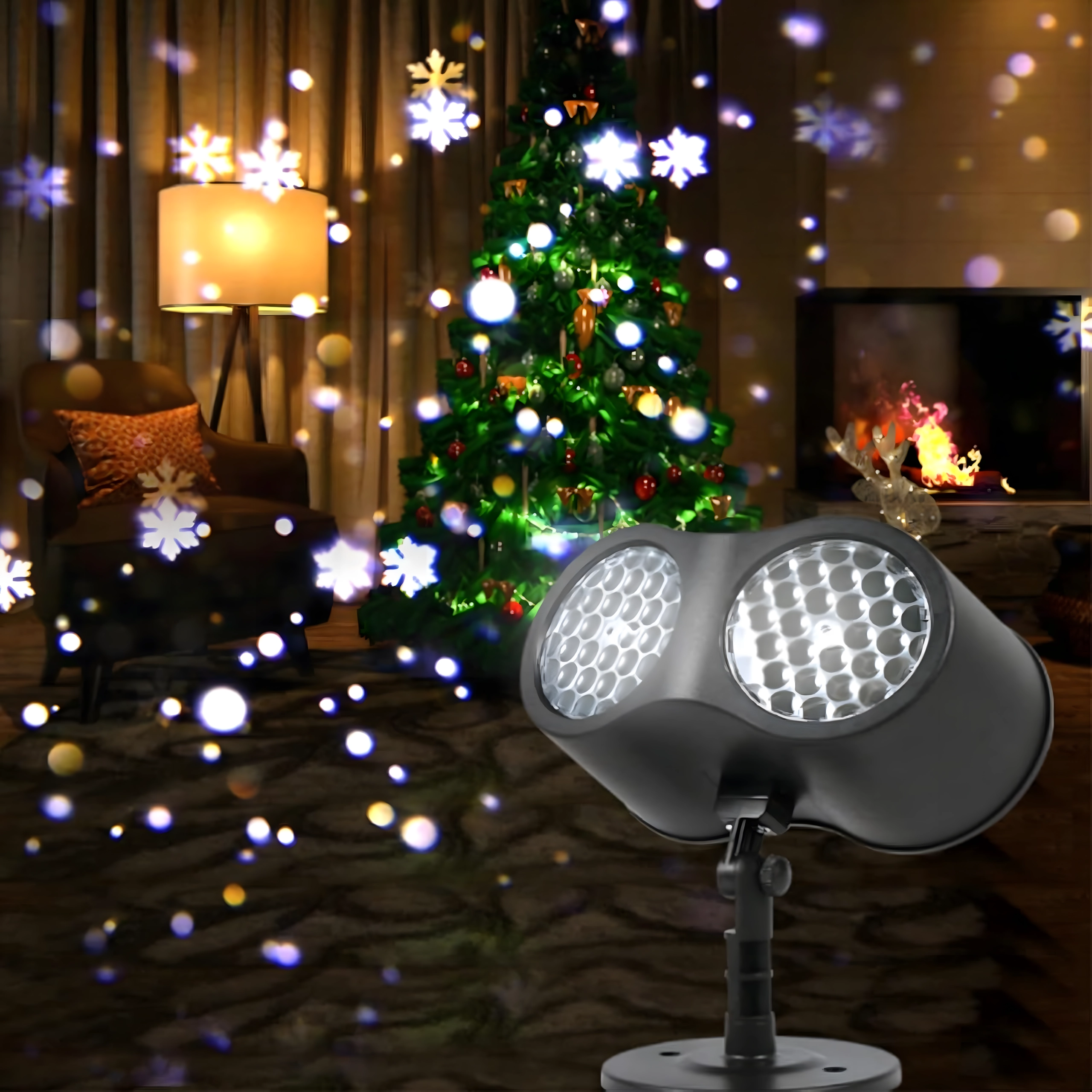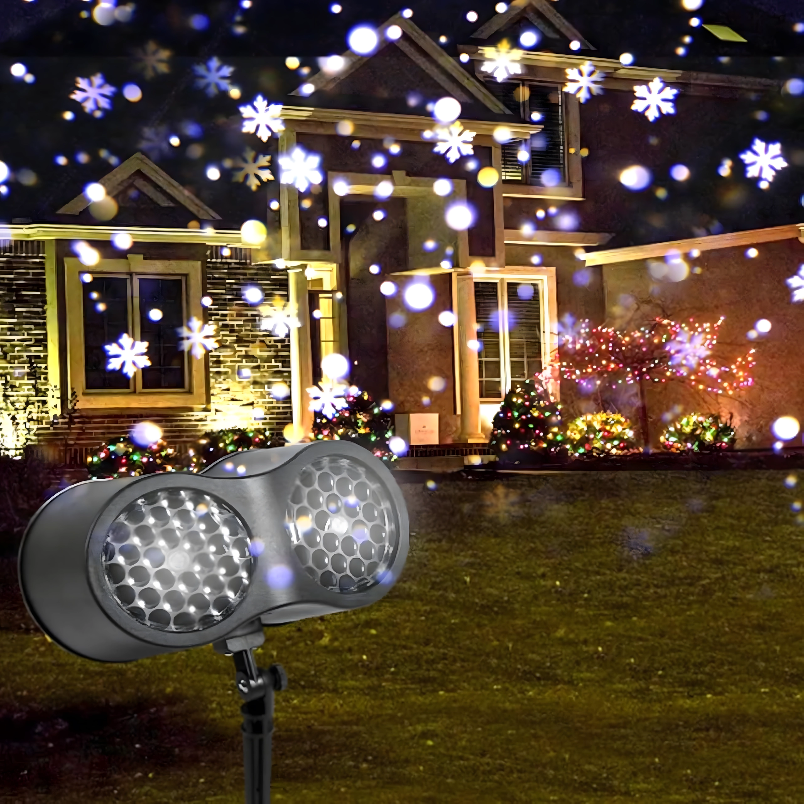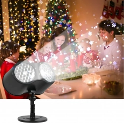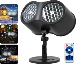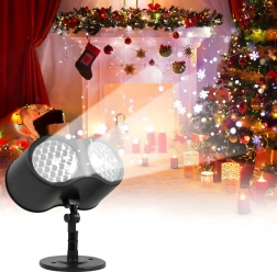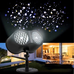 Dobbelt LED-optik projicerer klare, dynamiske snefnug og prikker over store væg- og facadeflader – ideelt til hurtig julepynt uden stiger og lyskæder.