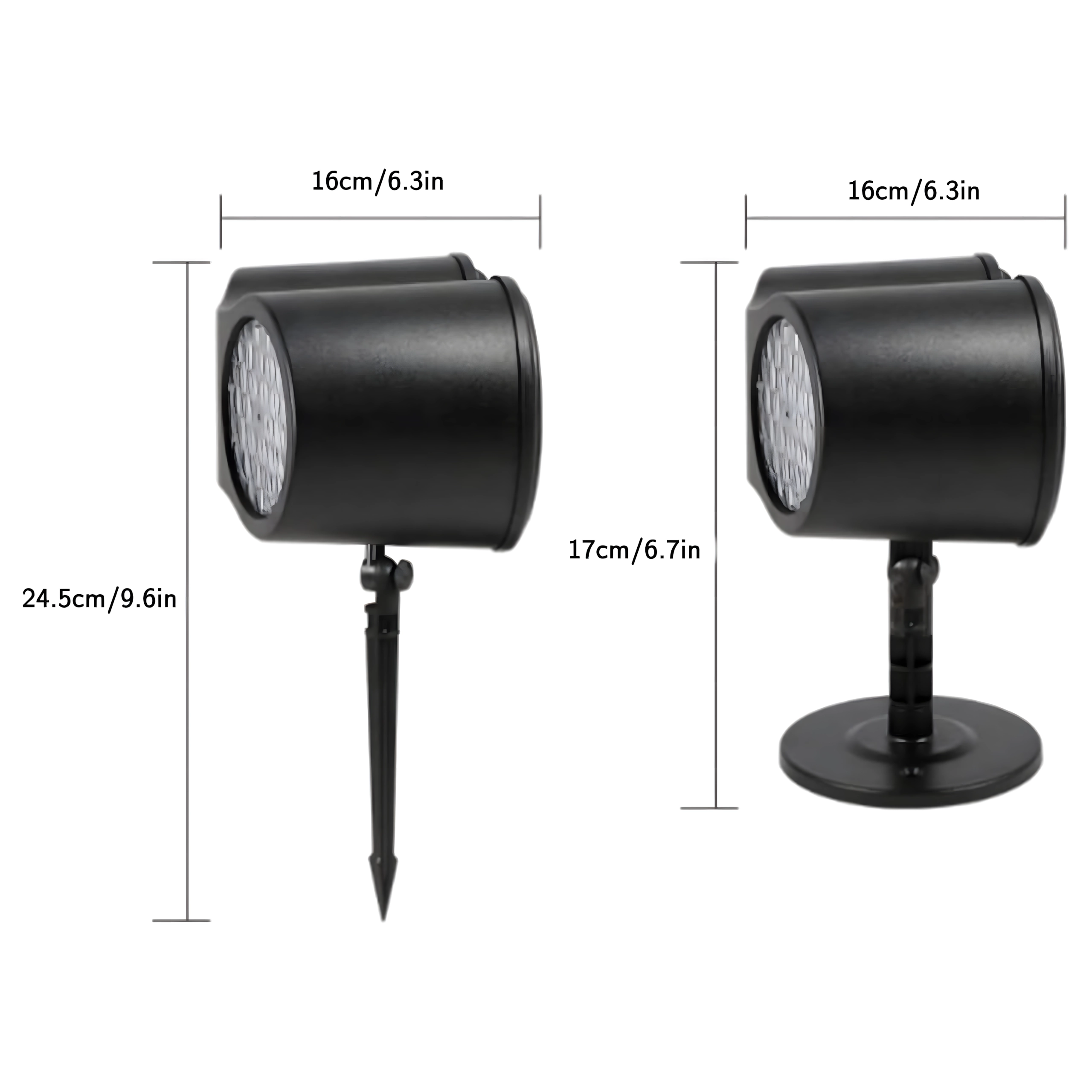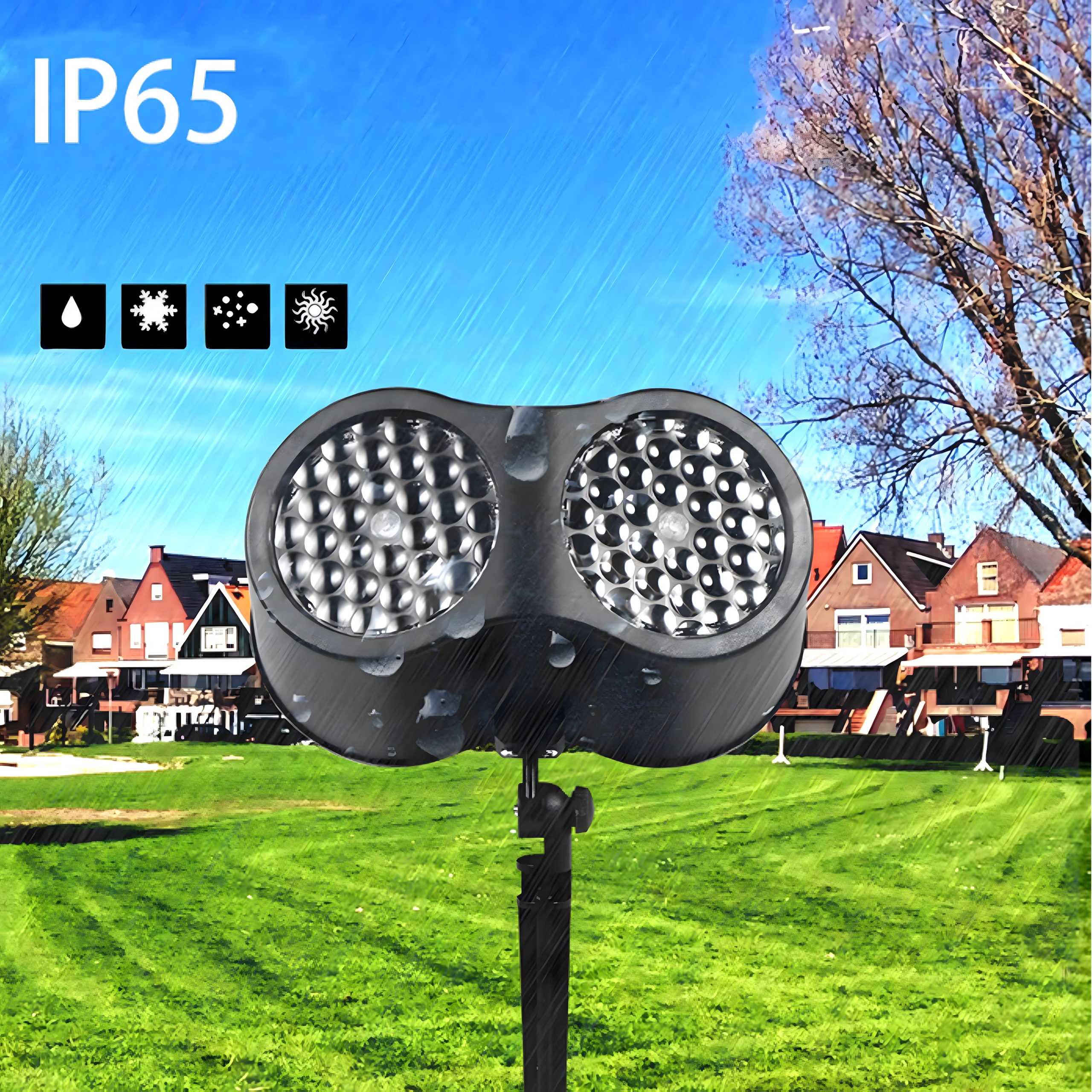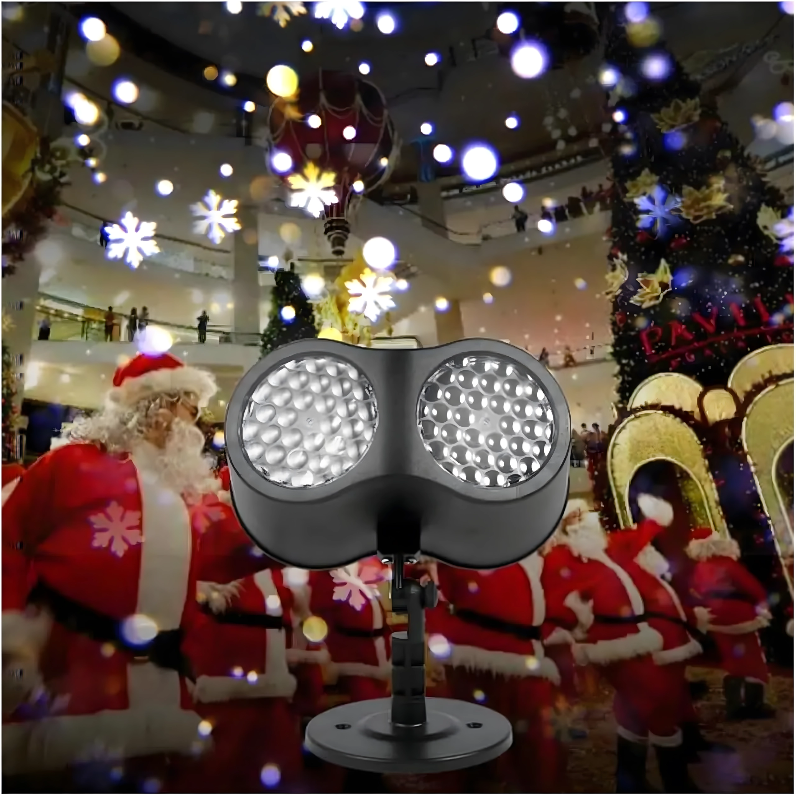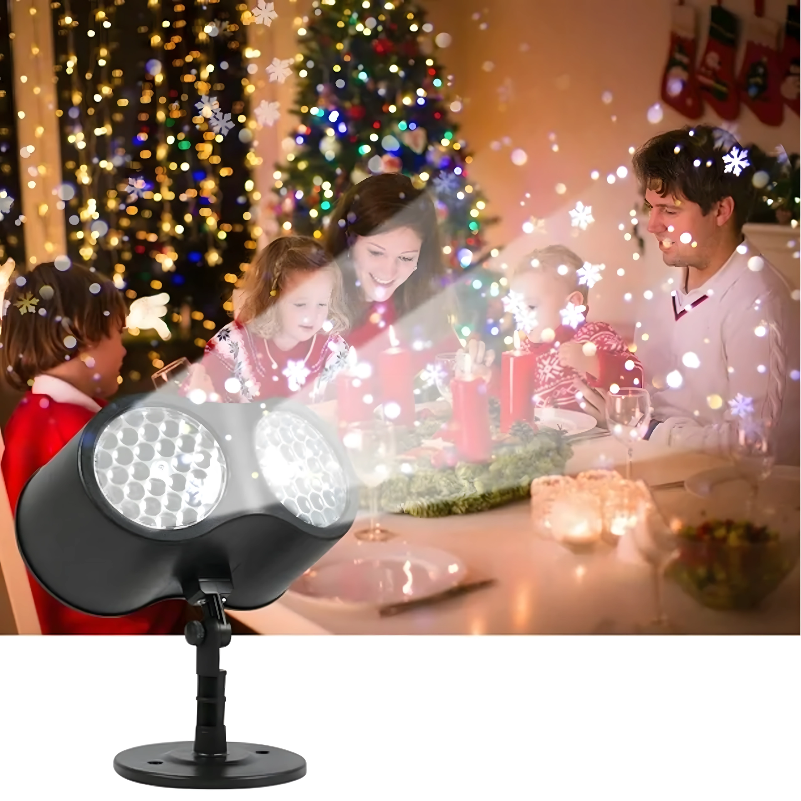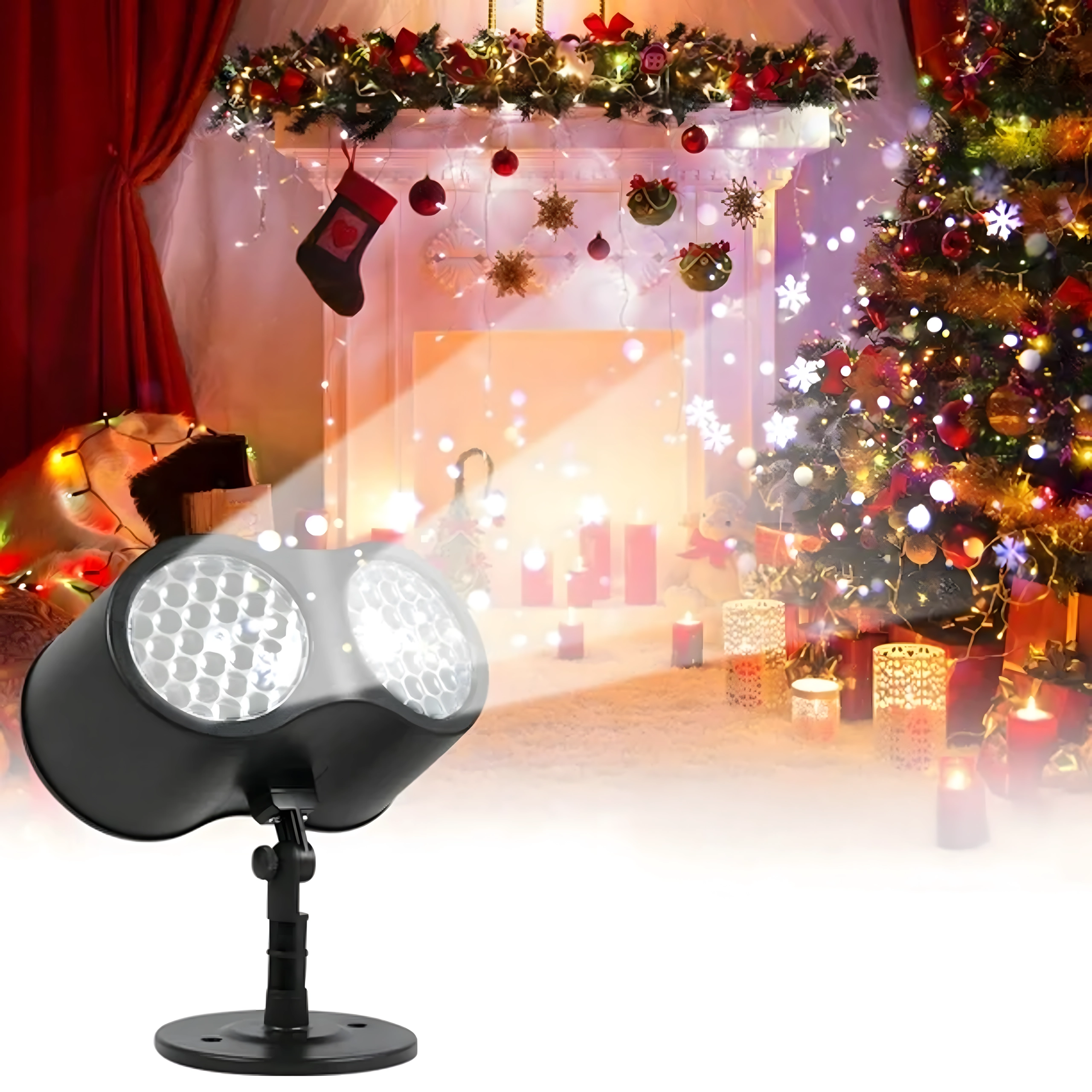 Dobbelt LED-optik projicerer klare, dynamiske snefnug og prikker over store væg- og facadeflader – ideelt til hurtig julepynt uden stiger og lyskæder.