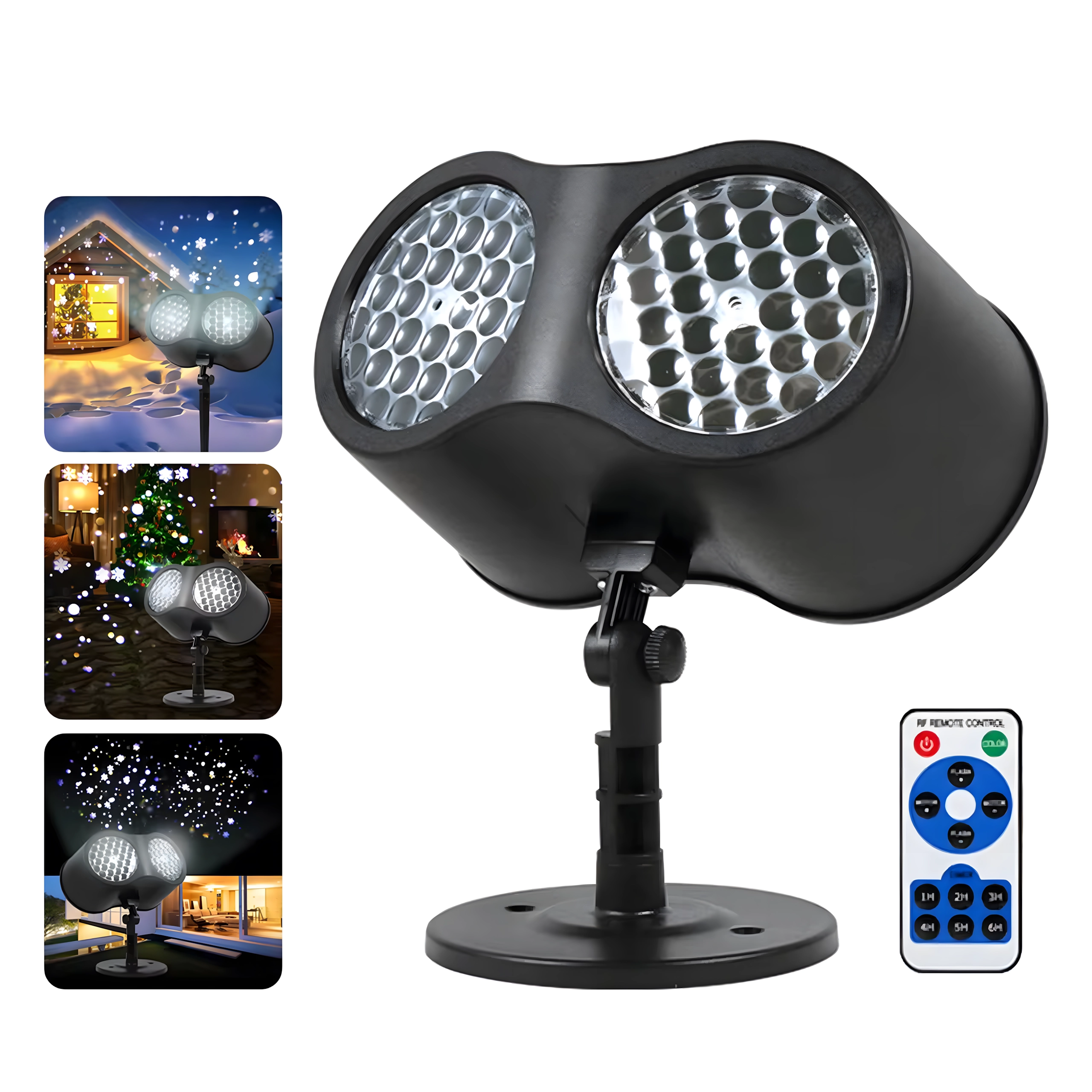 Takket være IP65-klassificeringen er projektoren klar til vinter – den tåler regn, sne og frost. Et justerbart beslag og jordspyd gør det nemt at montere i haven, mens en stabil base er ideel til indendørs brug. Med fjernbetjeningen (rækkevidde op til 25 m) skifter du effekter og indstiller timeren 2–4–6 timer uden at skulle gå udenfor.