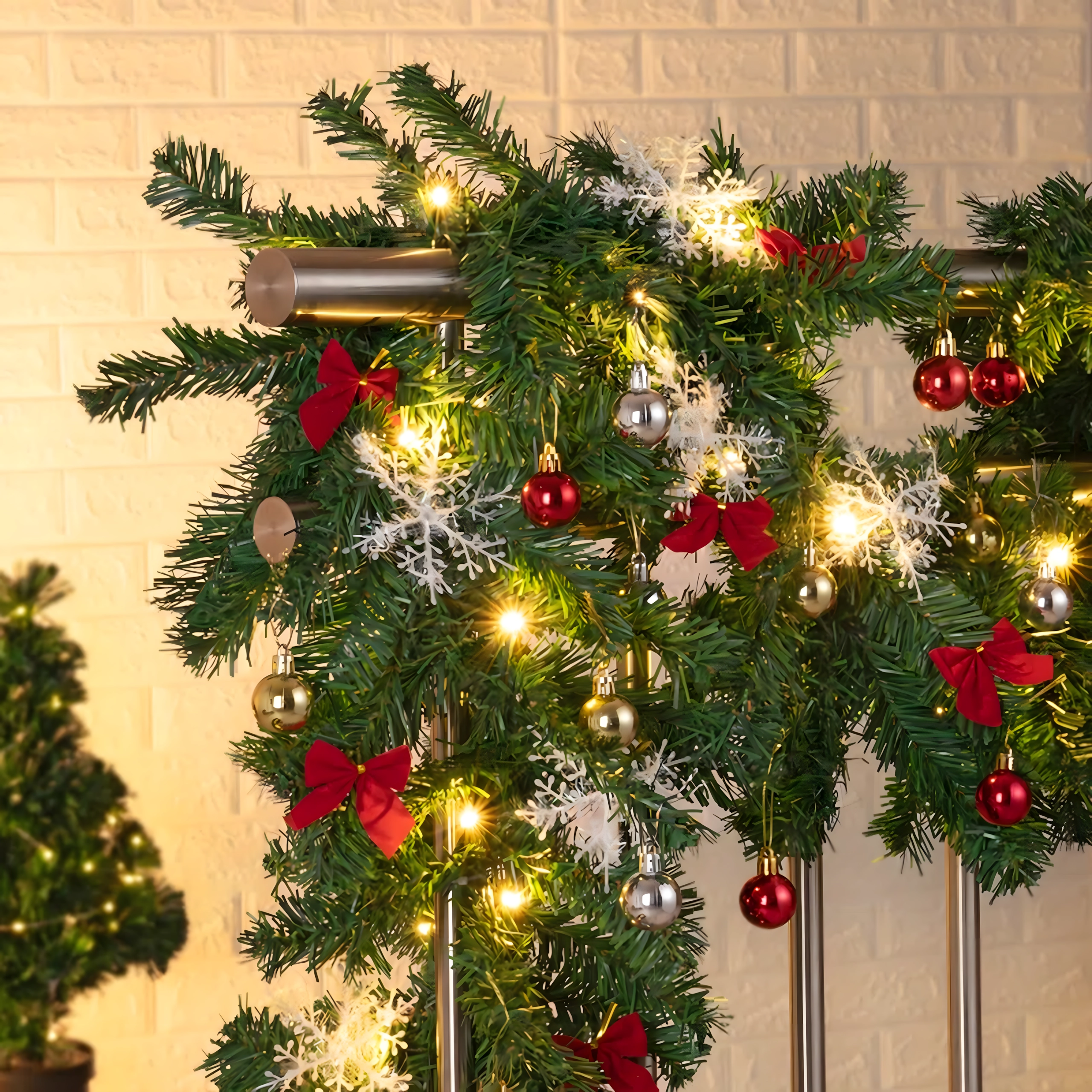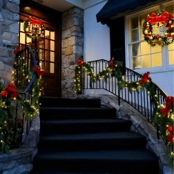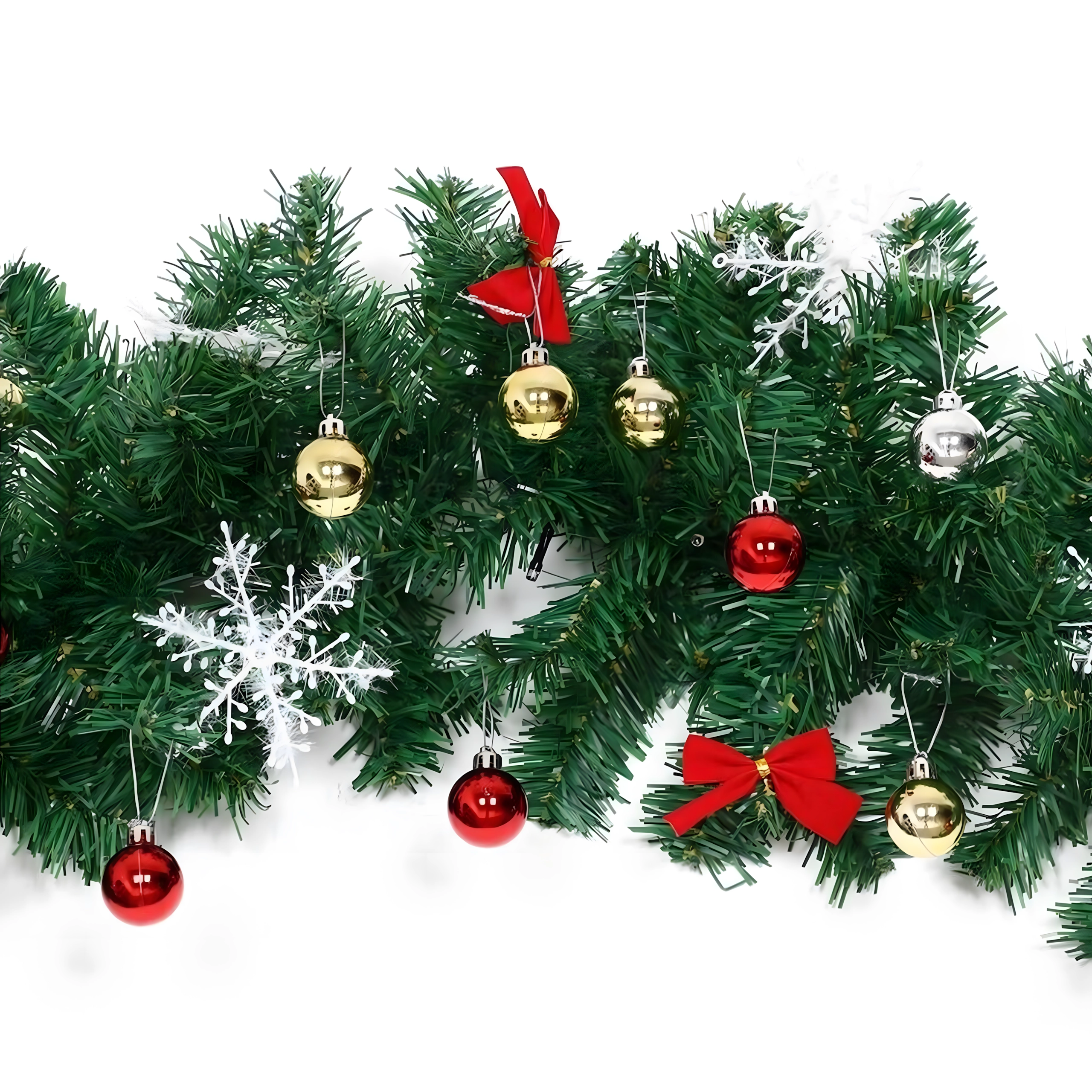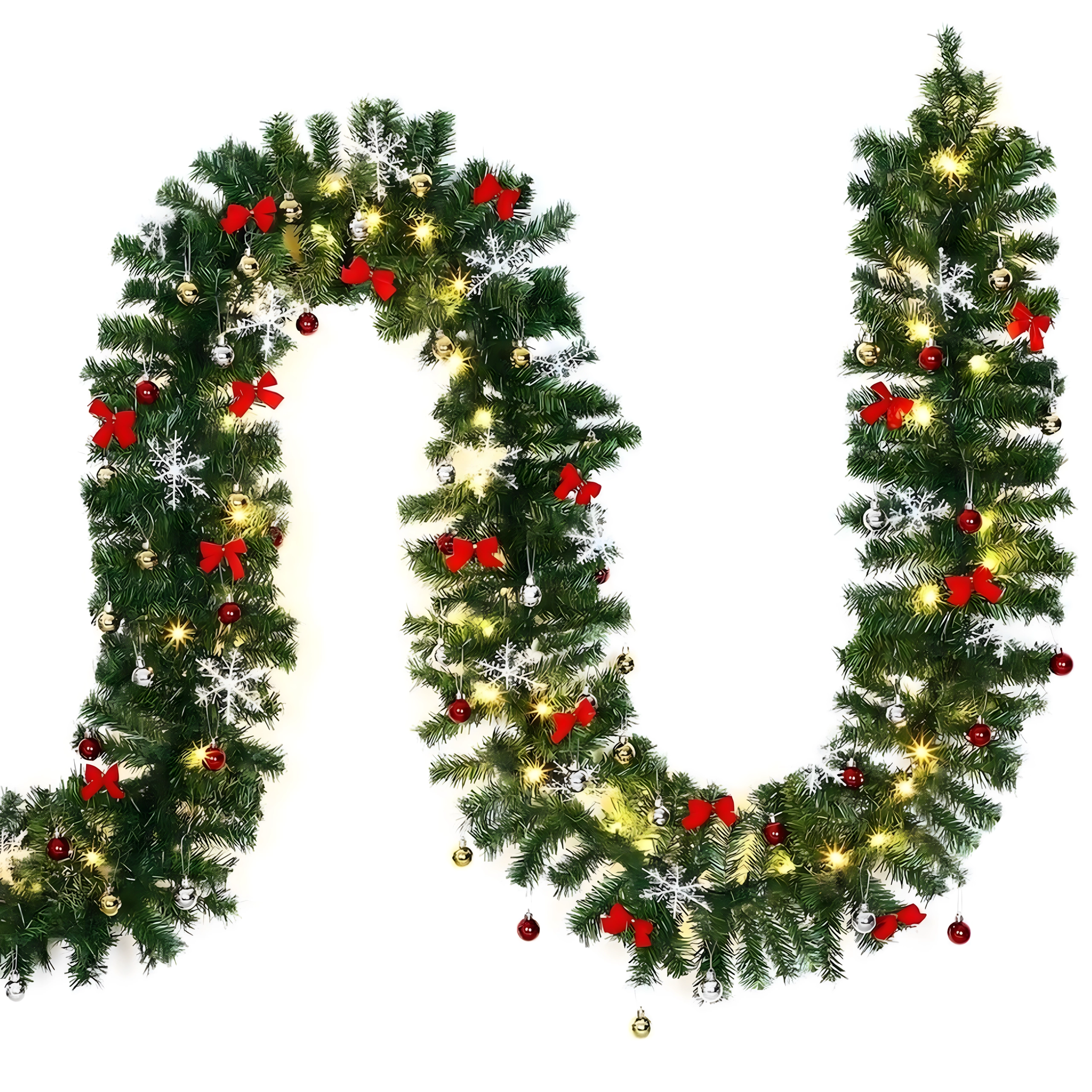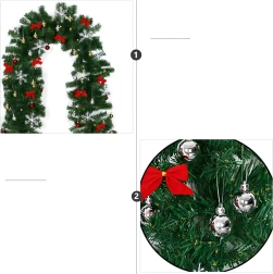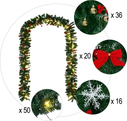 Denne elegante juleguirlande forvandler enhver indgang, ethvert gelænder eller enhver pejshylde til et festligt blikfang. De integrerede, varme LED-lys giver en behagelig, hyggelig belysning, og de tidløse dekorationer i form af kugler, sløjfer og snefnug sørger for et stilfuldt udtryk uden besvær.