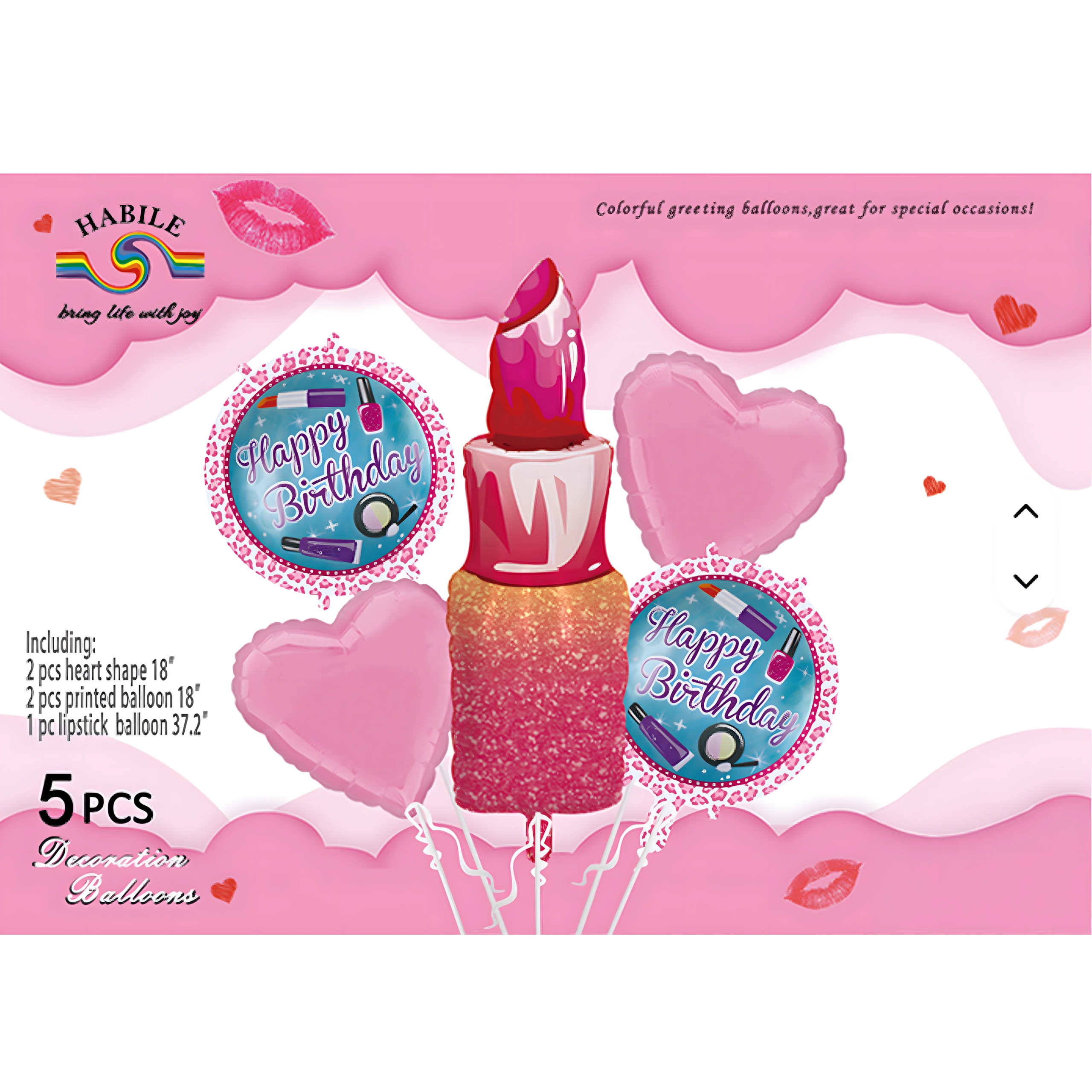 Et stilfuldt sæt fødselsdagsballoner til piger indeholder 5 stk.: læbestift, læber, 2 balloner med teksten Happy Birthday og et hjerte. Perfekt til fødselsdage, polterabend og andre damefester.
