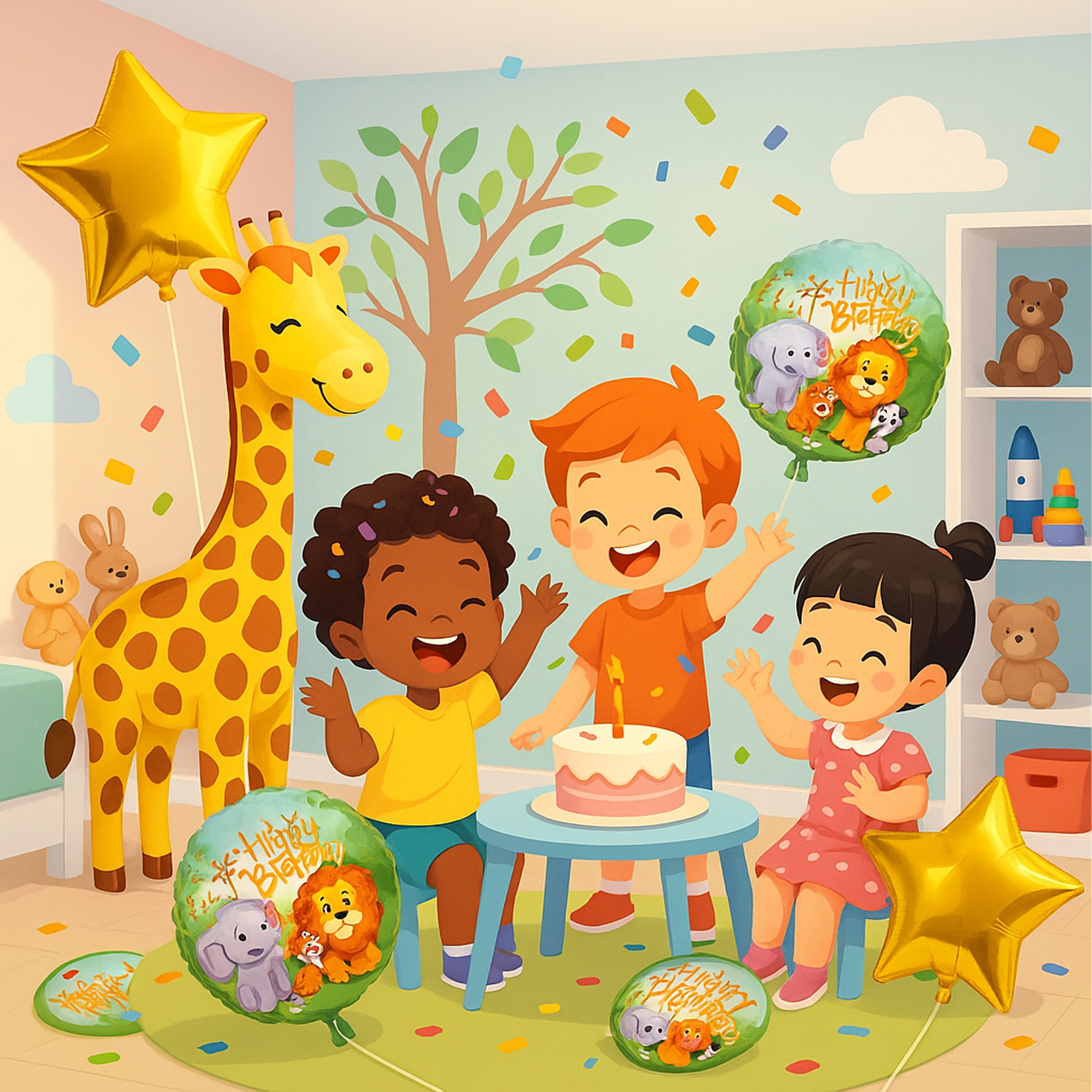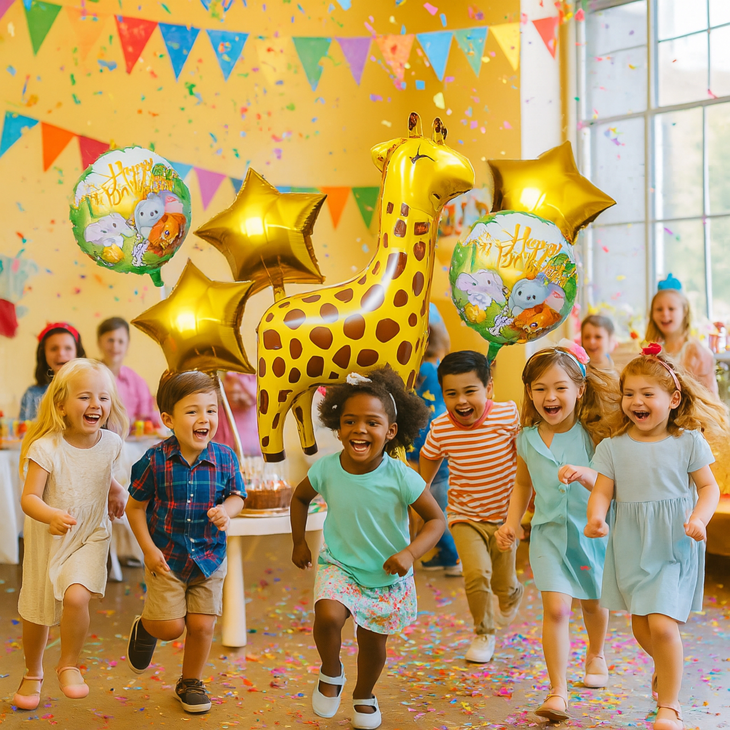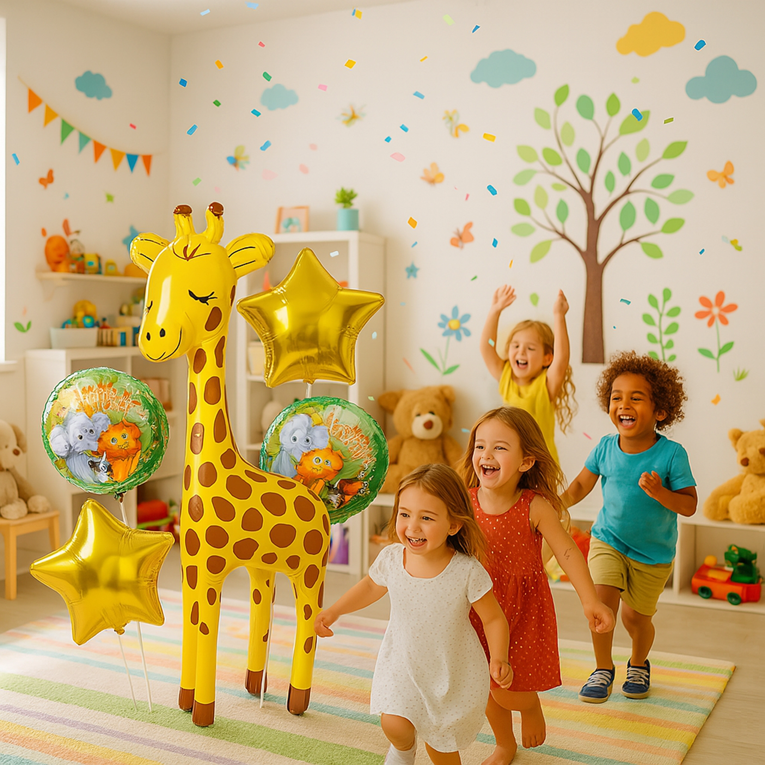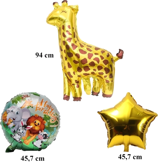 Et festligt ballonsæt med motiv af giraffer og dyr forvandler enhver fest til et lille safari-paradis. I pakken finder du 1 folieballon med giraf, 2 balloner med teksten HAPPY BIRTHDAY og 2 gyldne stjerner – den ideelle pynt til børnefødselsdage og tematiske zoo-/safarifester.