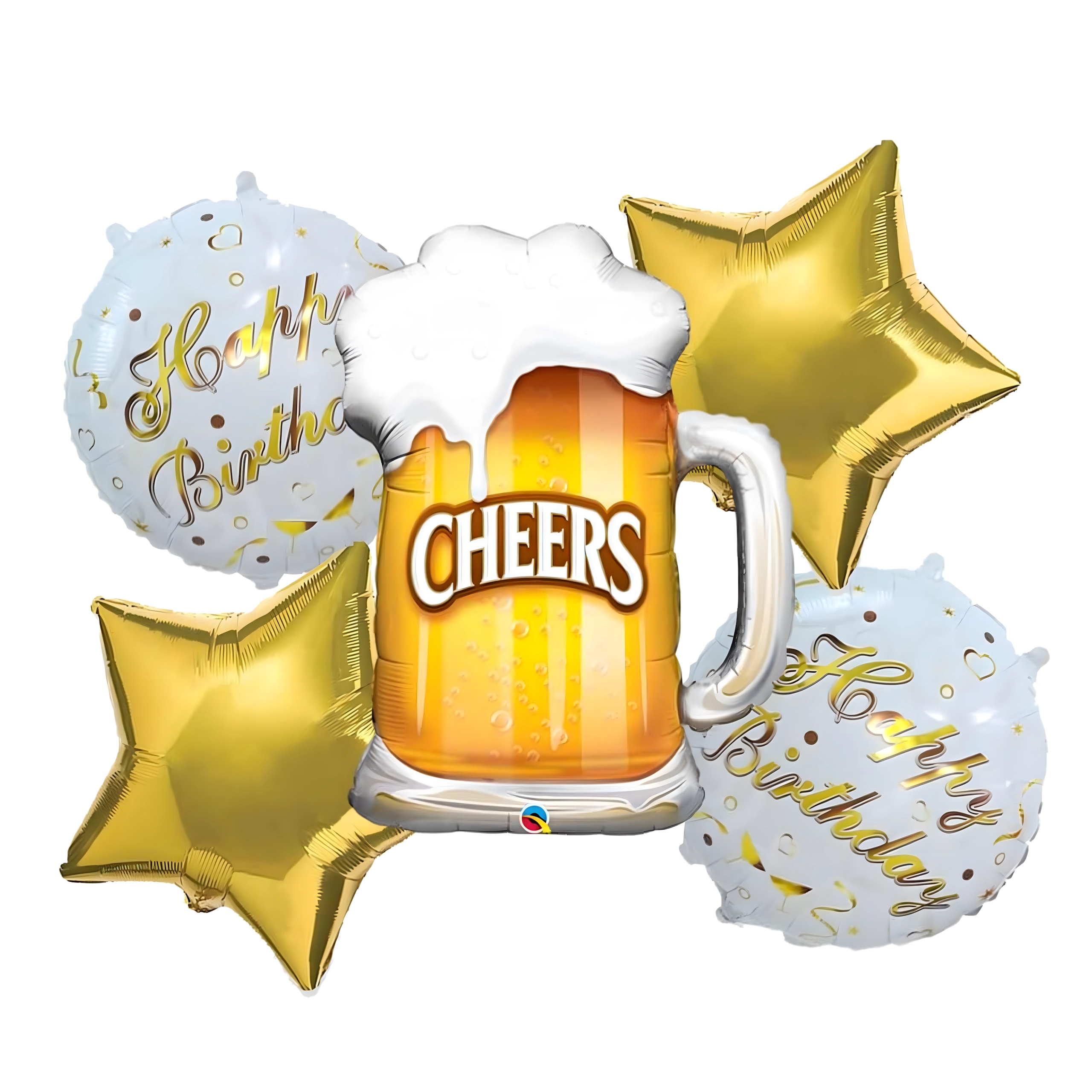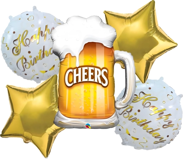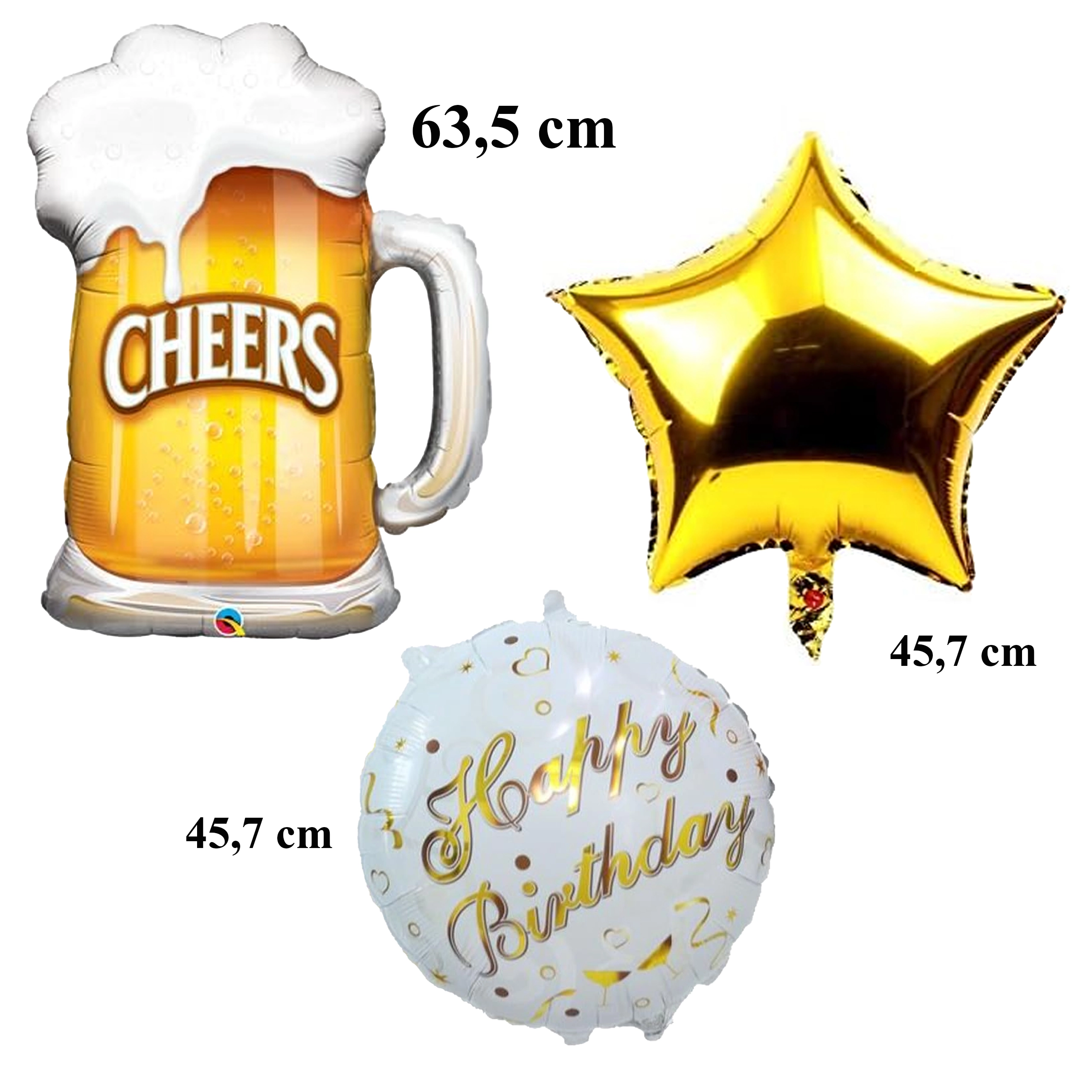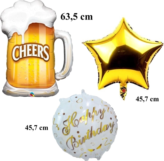 Dette designede ballonsæt “CHEERS” giver din fest en unik atmosfære. Højdepunktet er en folieballon formet som et ølkrus, suppleret af to balloner med teksten Happy Birthday og to gyldne stjerner. Kombinationen er ideel til voksenselskaber.