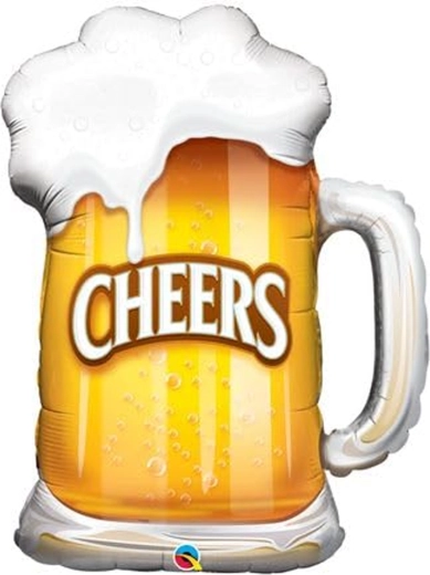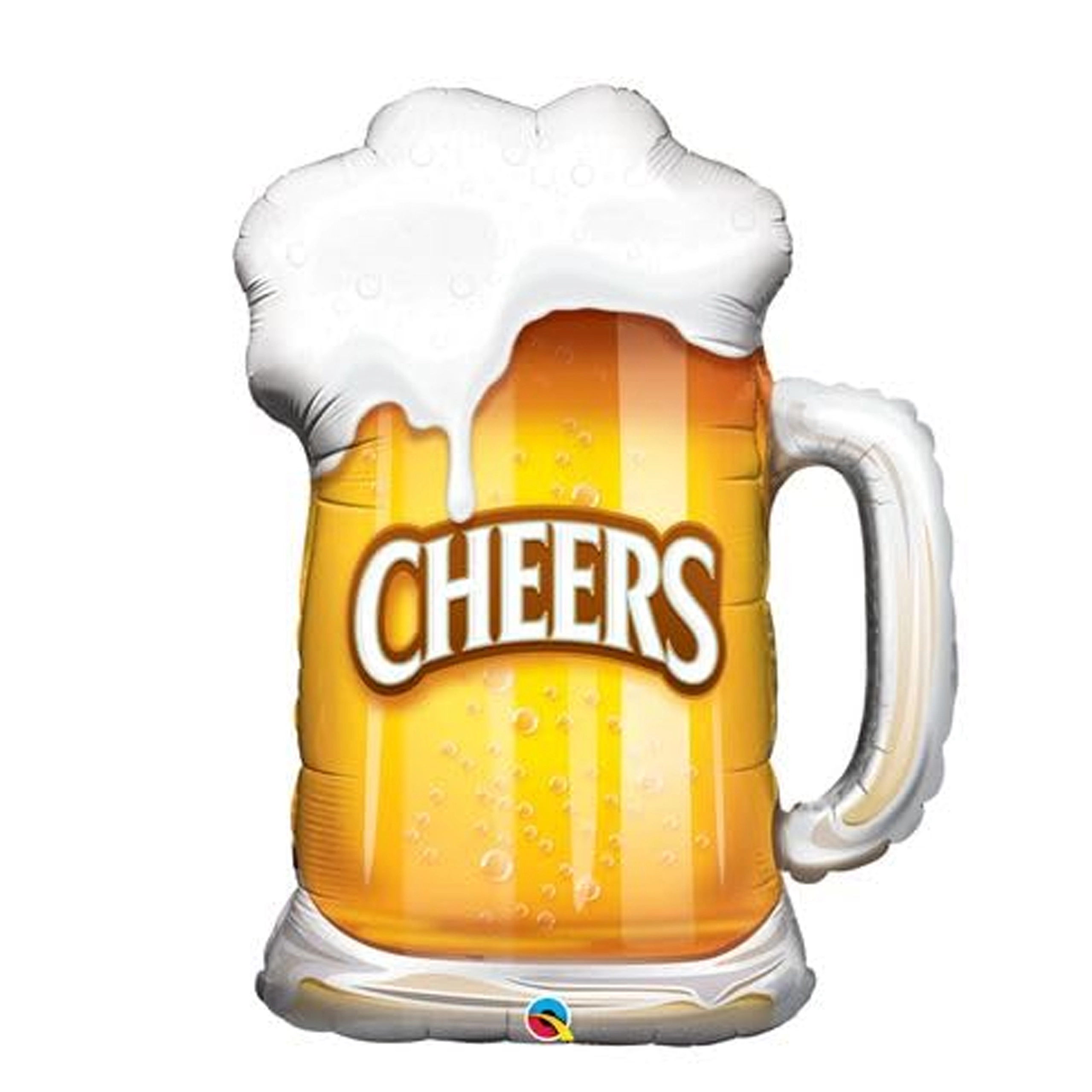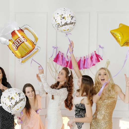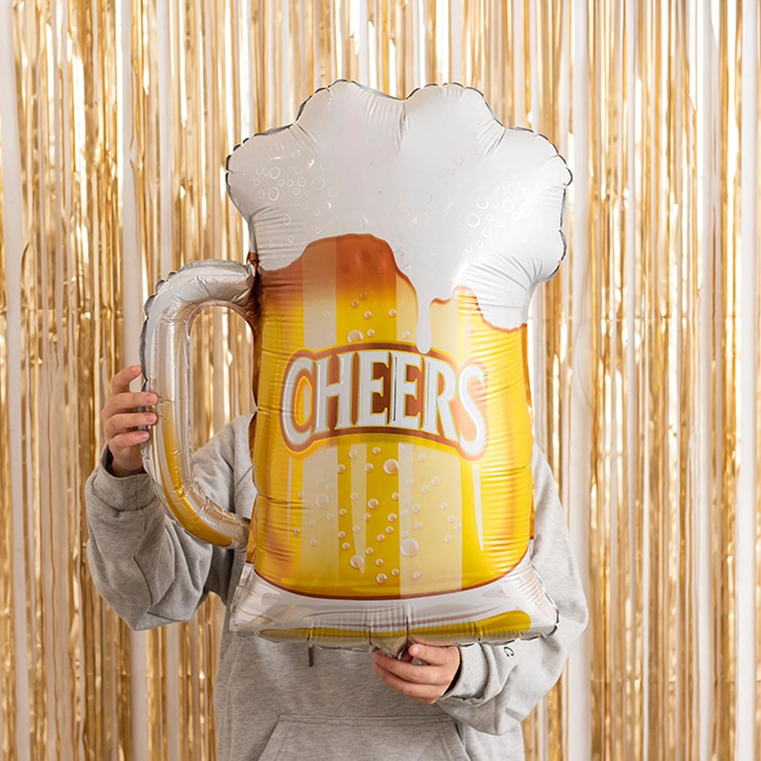 Stilfuldt sæt af folieballoner CHEERS med motiv af et ølkrus, to balloner med teksten Happy Birthday og to gyldne stjerner er et glimrende valg til voksne fødselsdage, polterabend og firmafester. De er nemme at puste op med helium eller luft og skaber øjeblikkelig feststemning.