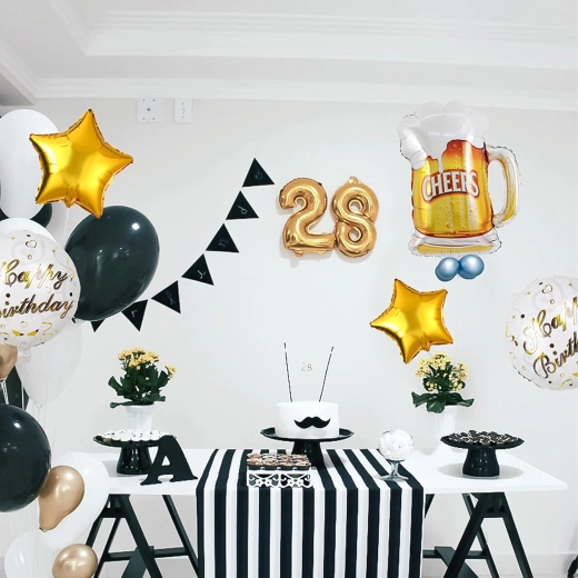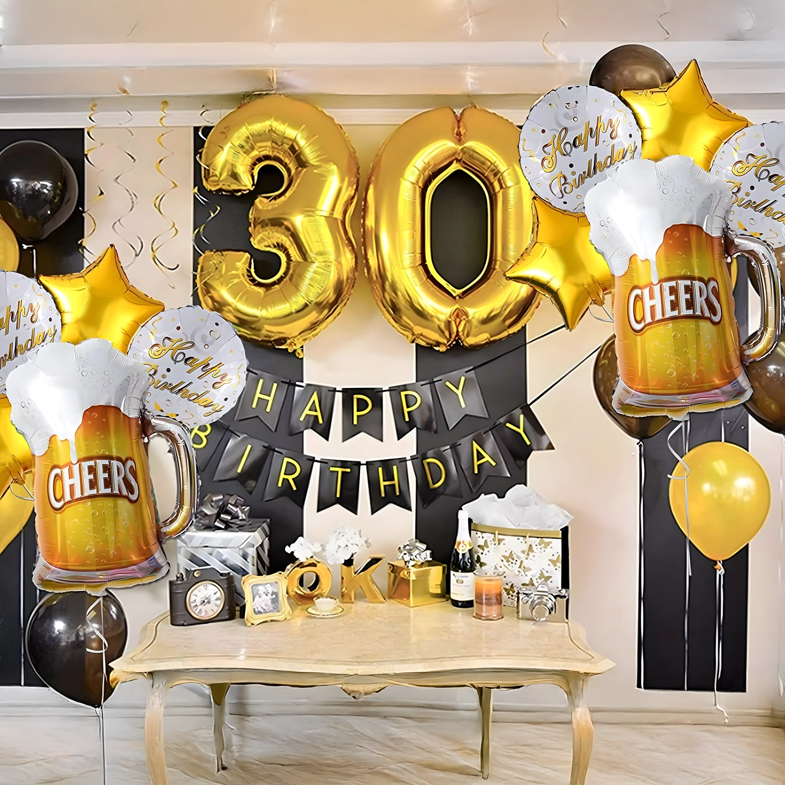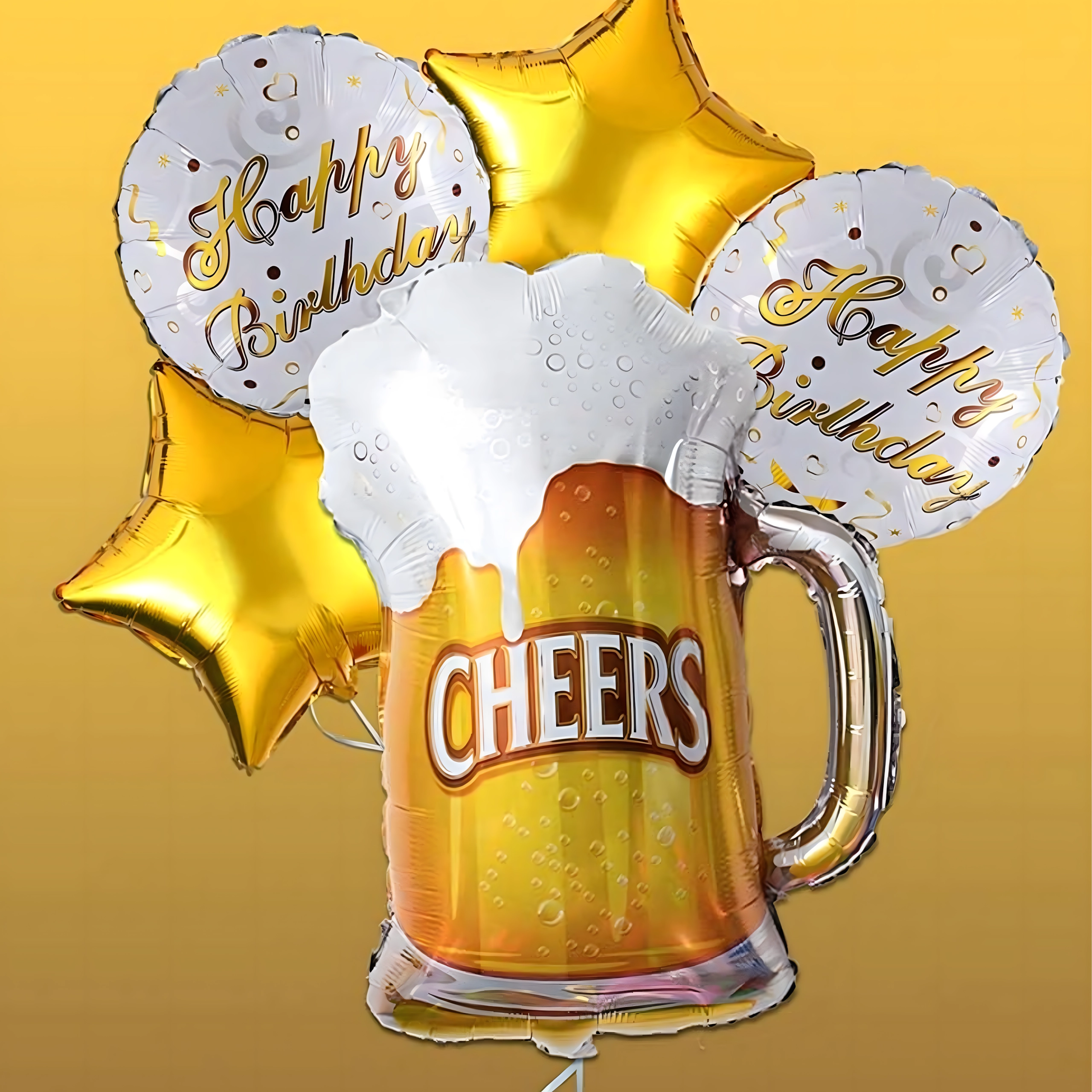 - Effektfuldt party-sæt: 1× ølkrus, 2× Happy Birthday, 2× gylden stjerne (i alt 5 stk.)