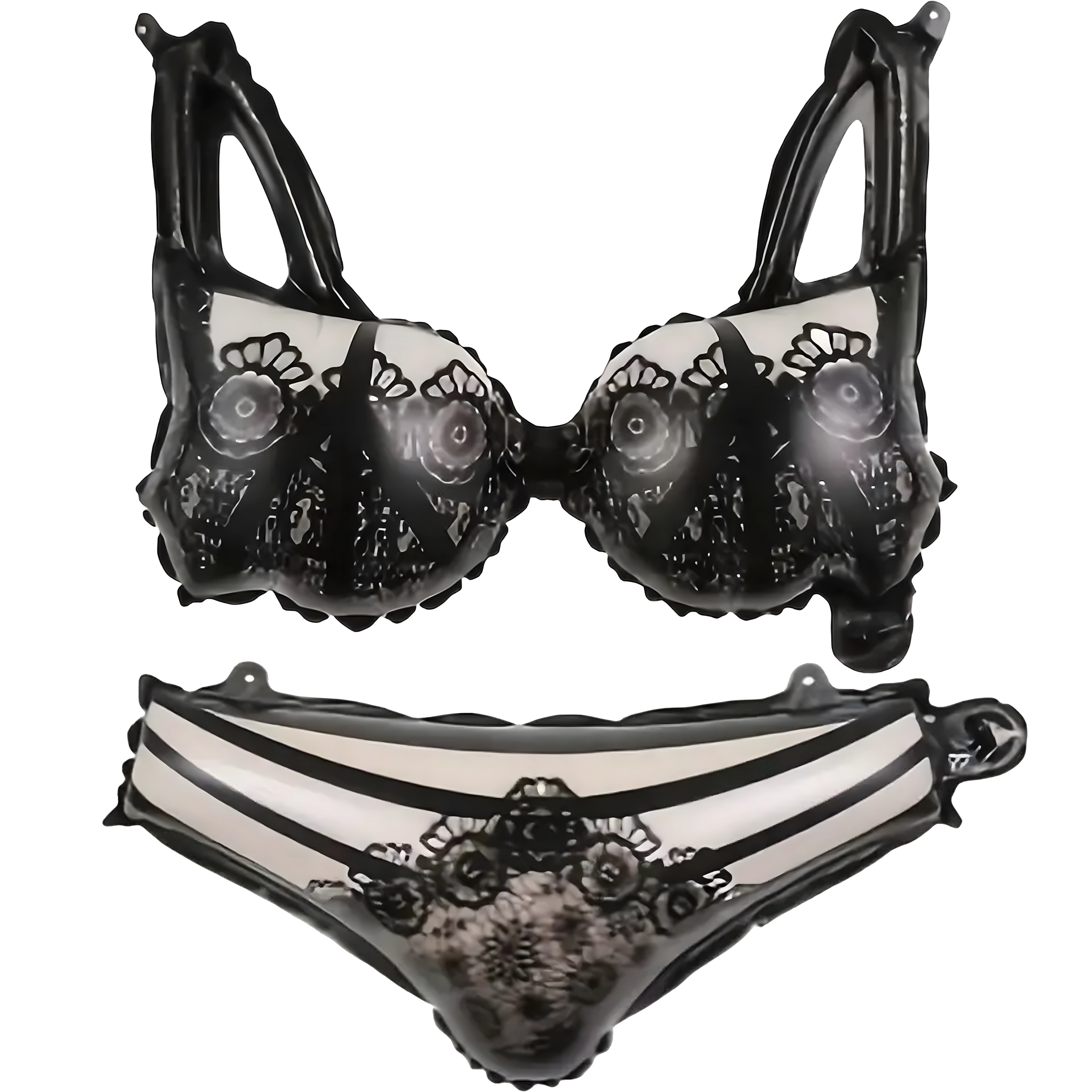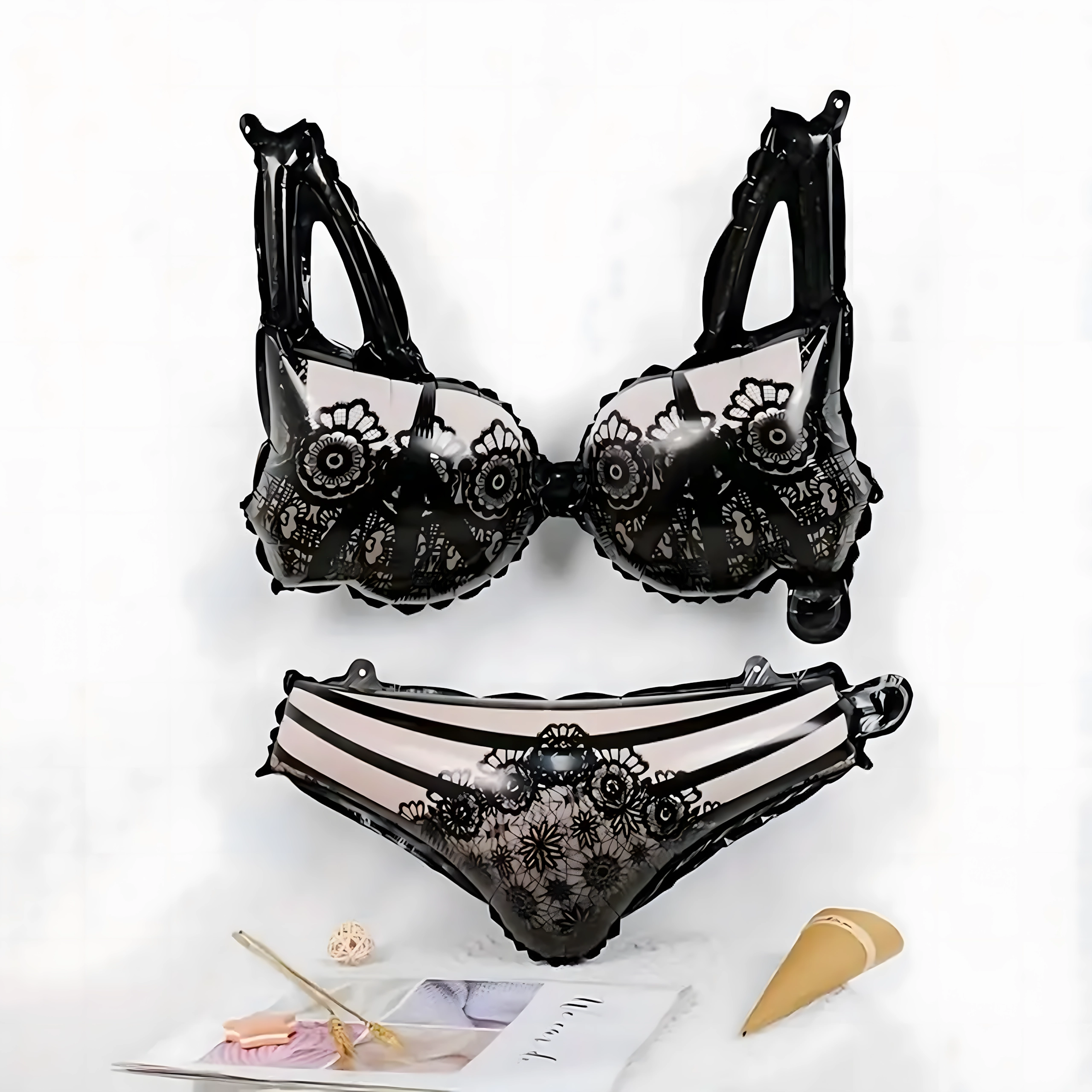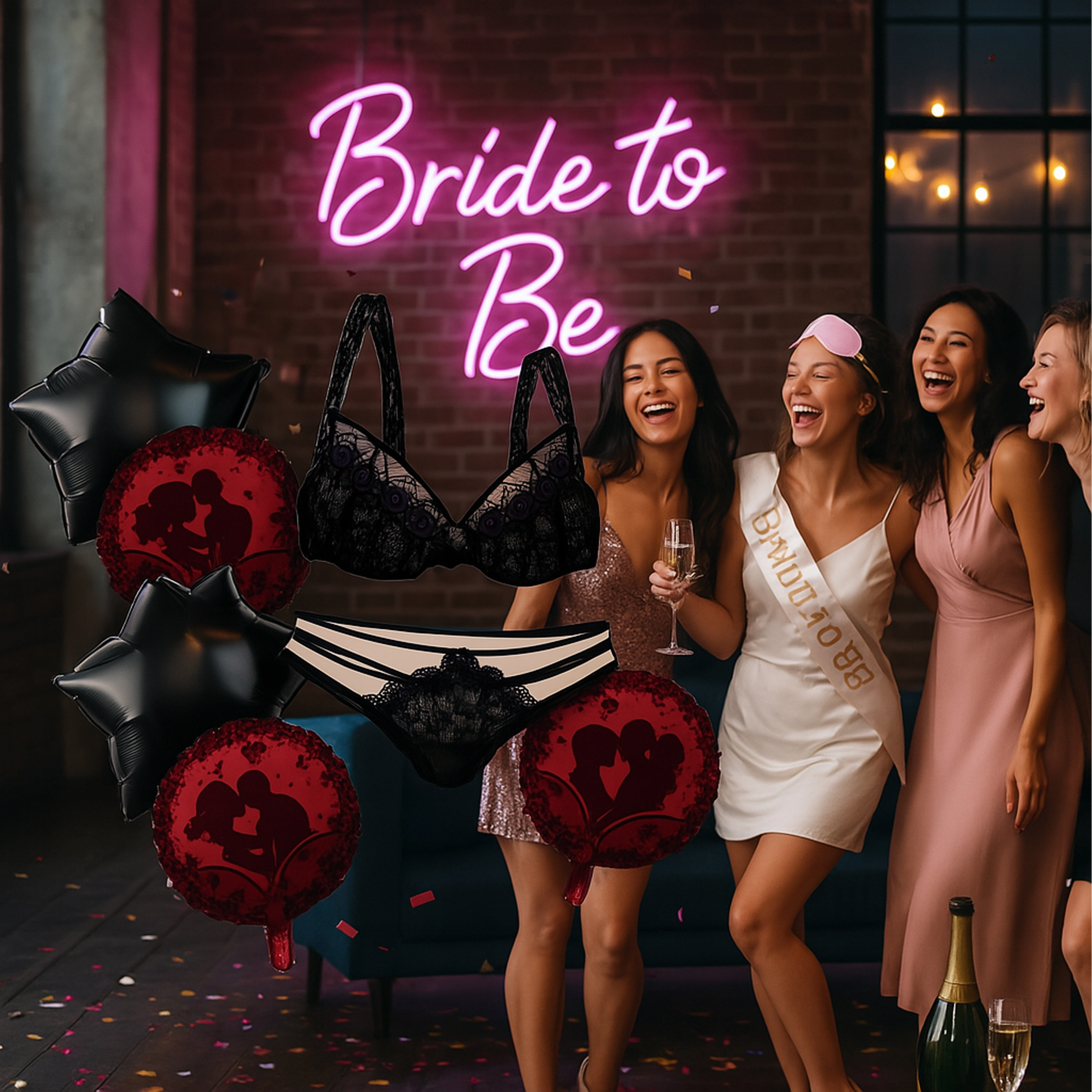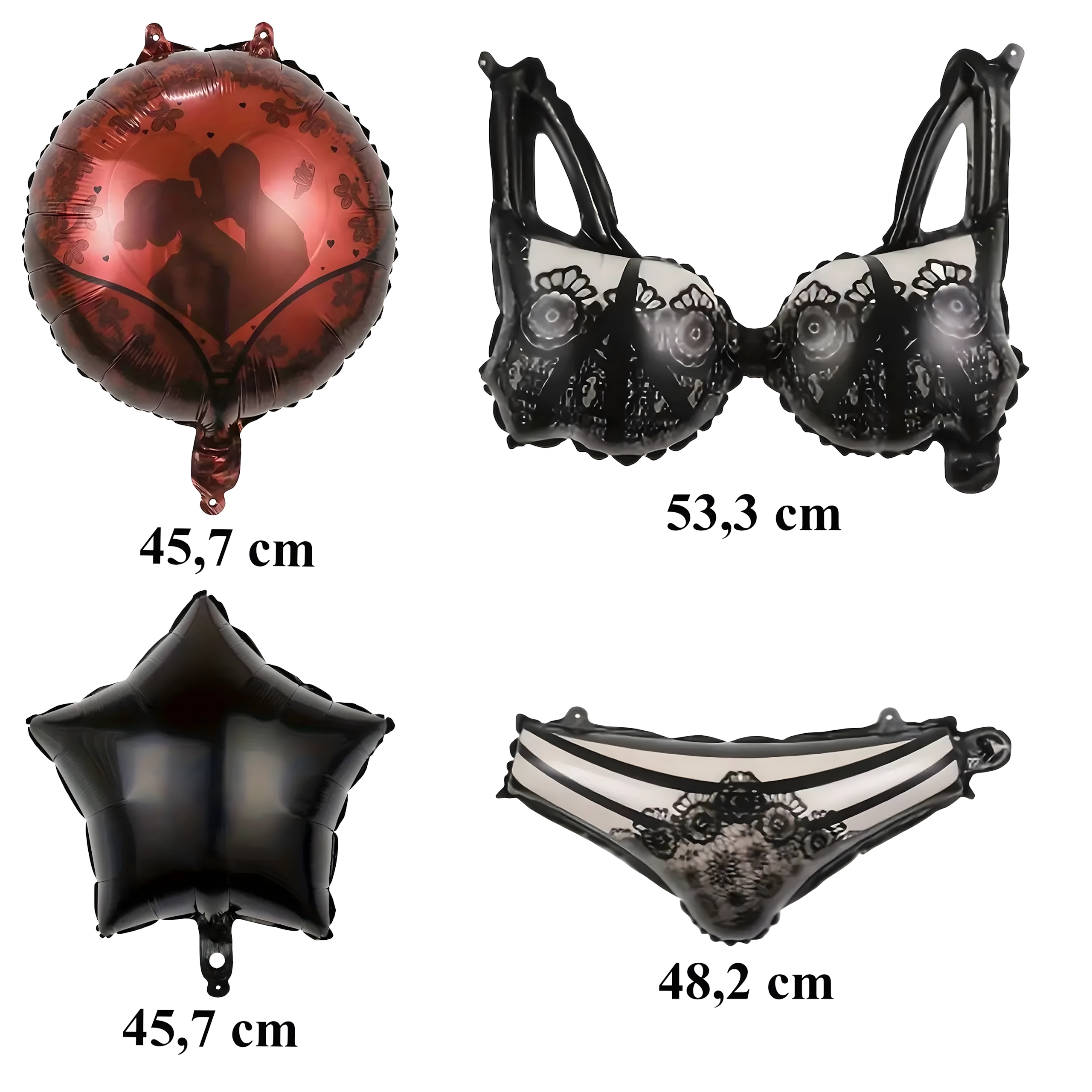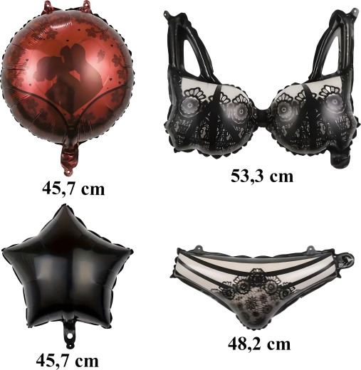 Et muntert sæt balloner til polterabend med motiv af damelingeri, der lyser op på enhver fest. Indeholder en bh-formet ballon (53,3 cm), en trusse-formet ballon (48,2 cm), 2 runde balloner og 2 balloner med print. Ideel som dekoration til fotohjørnet og til Bride‑to‑Be-fester.