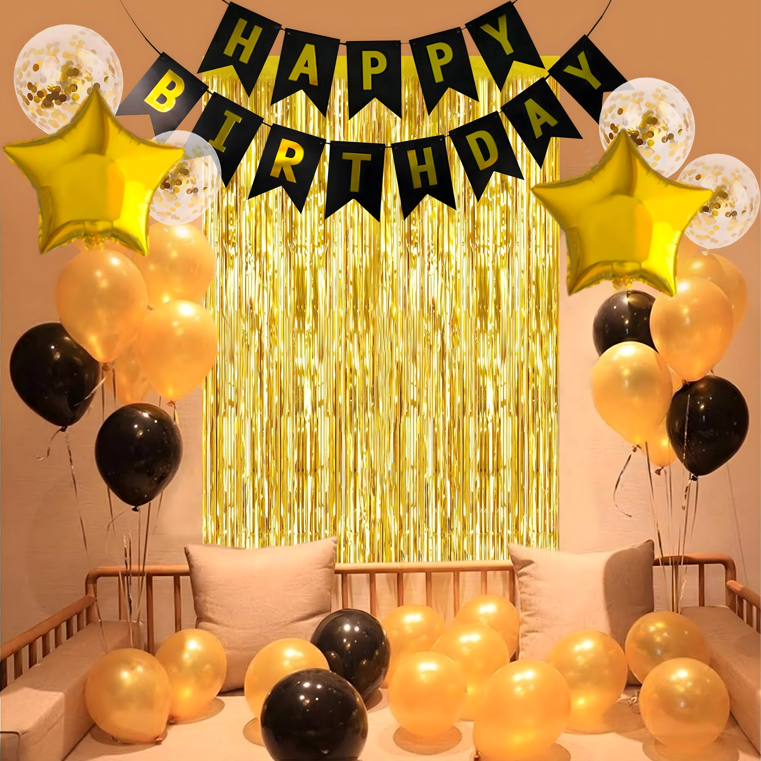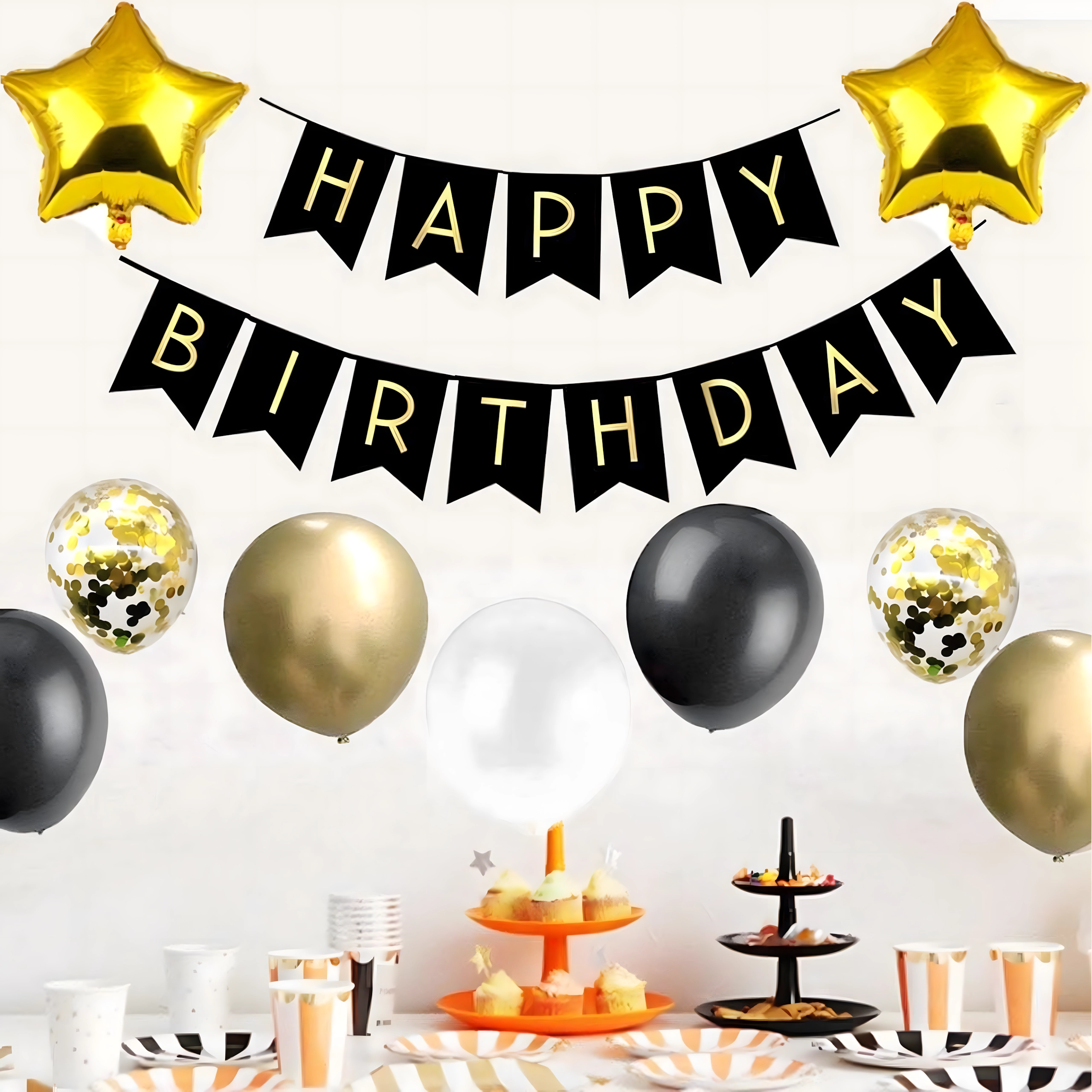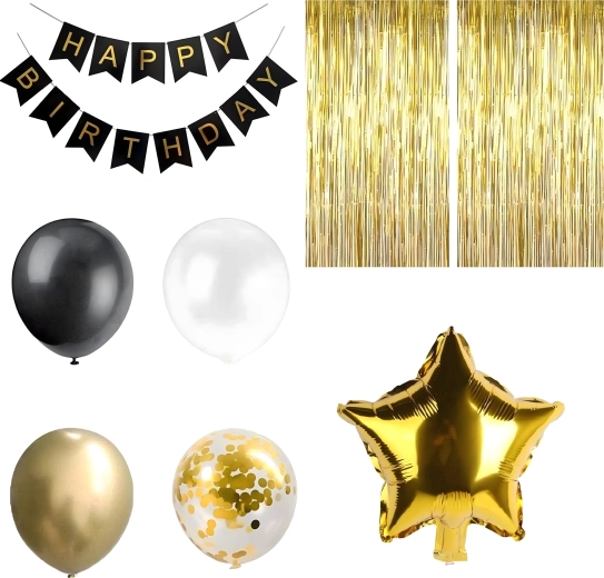 Dette komplette dekorsæt er ideelt til at skabe en markant fødselsdagsscene i sort‑guld. Kombinationen af forskellige typer balloner og hængedekoration giver en effektfuld baggrund til fotos og det centrale fødselsdagsbord.