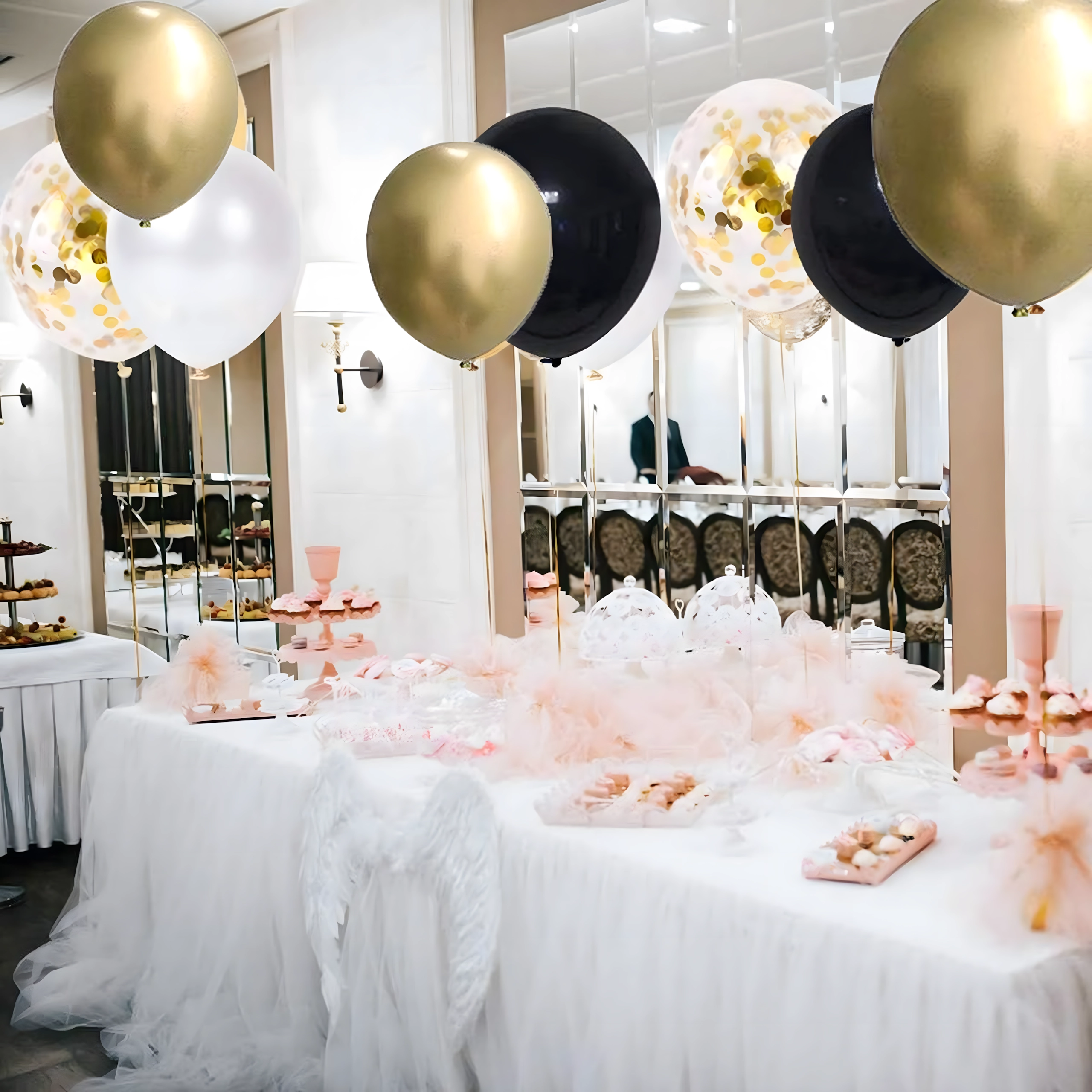 Designet i moderne kontrast mellem sort og guld virker elegant og festligt. Sættet er udformet til nem oppustning og opsætning, så du opnår et professionelt resultat selv uden dekoratør‑erfaring.