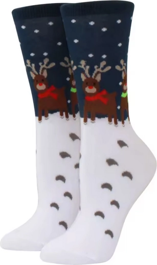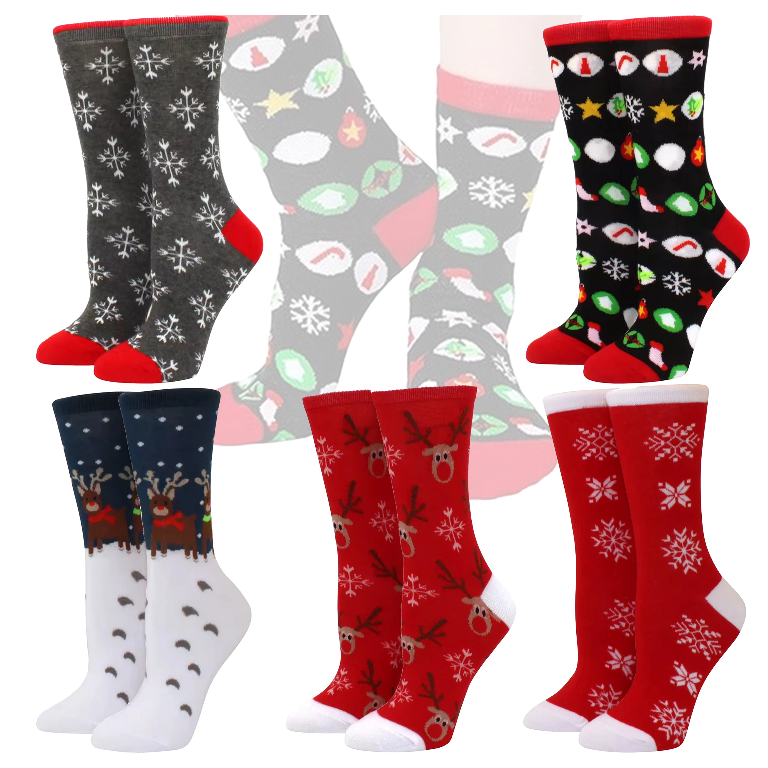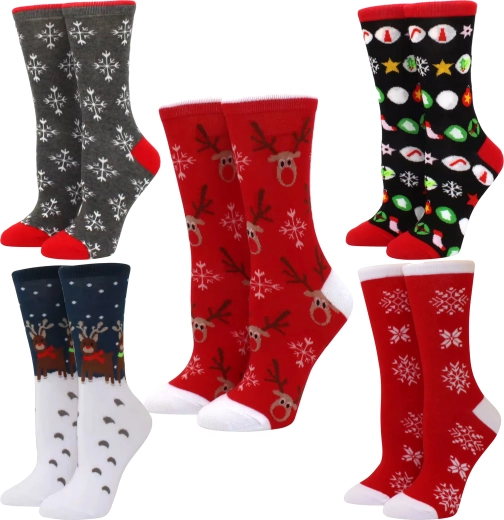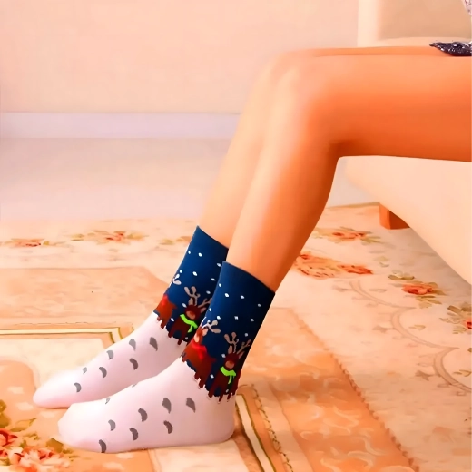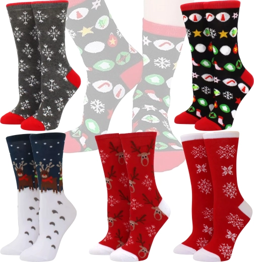 Stilfuldt sæt med 5 par julede bomuldssokker for komfort og glæde i de kolde vinterdage. Af bomuld af høj kvalitet – bløde, åndbare og behagelige at røre ved. Glade motiver som rener, juletræer og snefnug skaber en festlig stemning. En fantastisk gave til jul og Sankt Nikolaus.